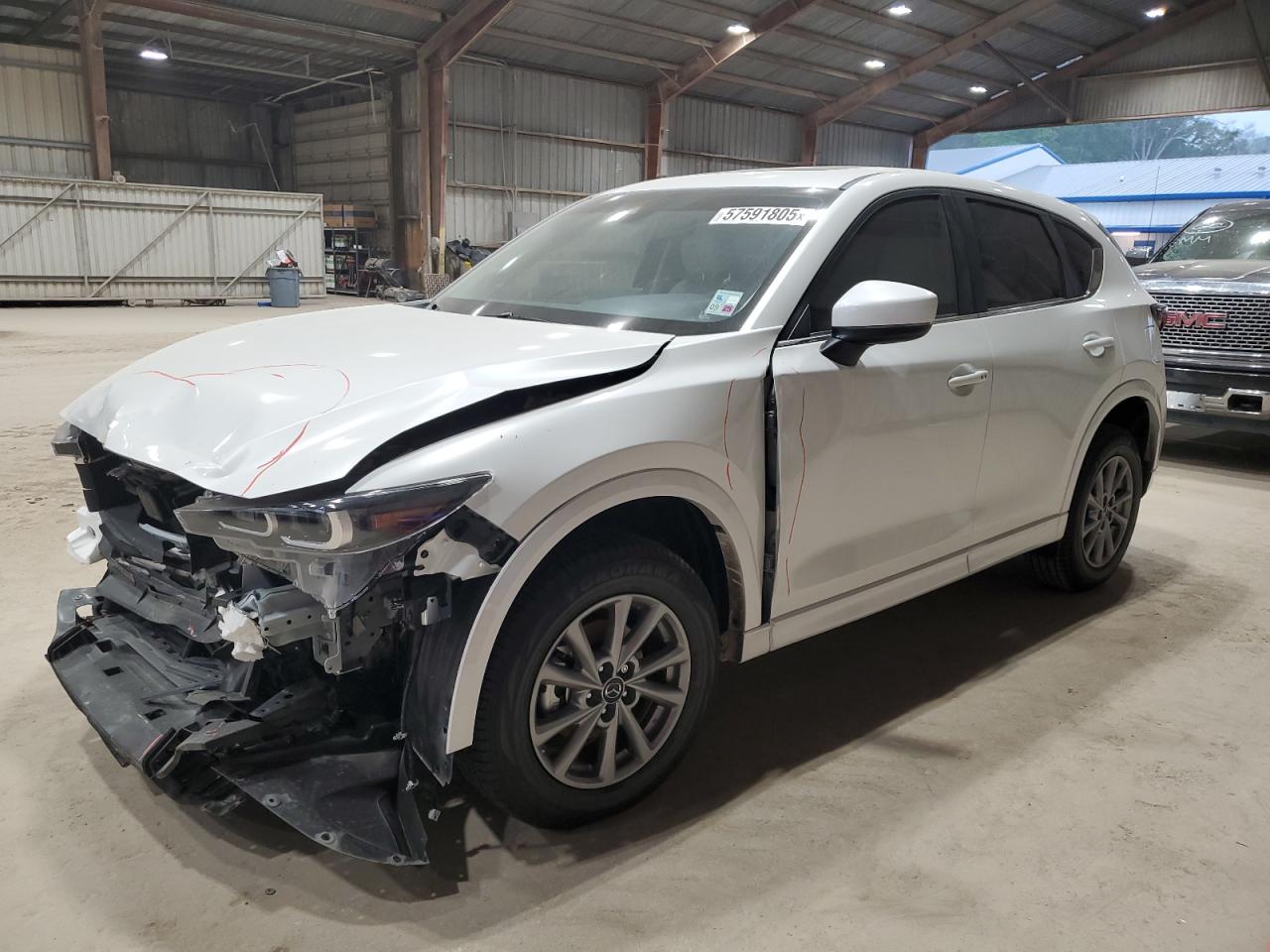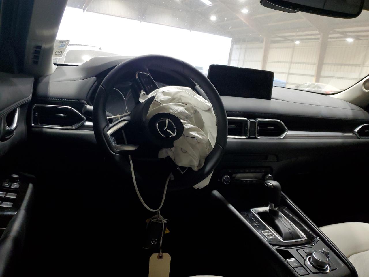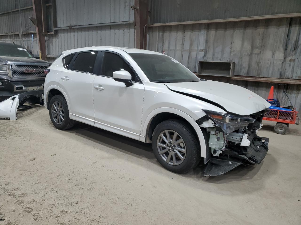 FairThis is a white MAZDA CX-5 PREFE 2025 that has sustained damage to the front end and side. The vehicle starts and drives. The car exhibits significant front-end damage, with visible damage to the body panels. Interior damage is evident, including deployed airbags. This car is in a Fair state due to moderate visible damage. It requires considerable repair but is drivable.