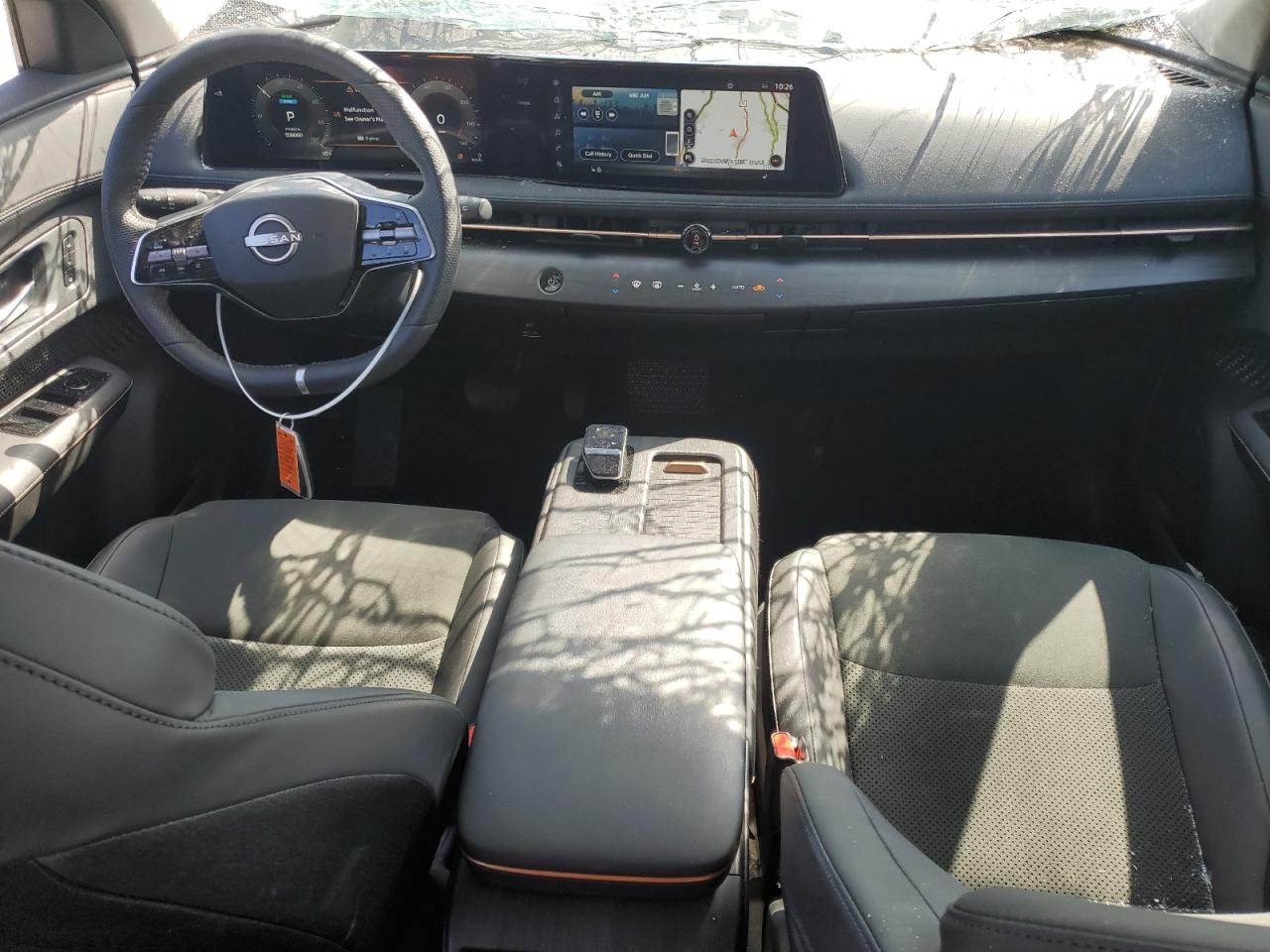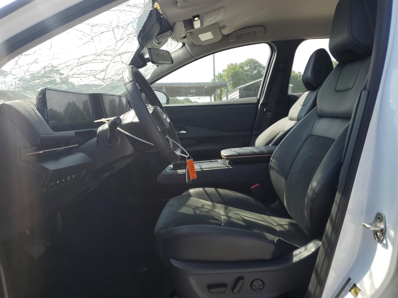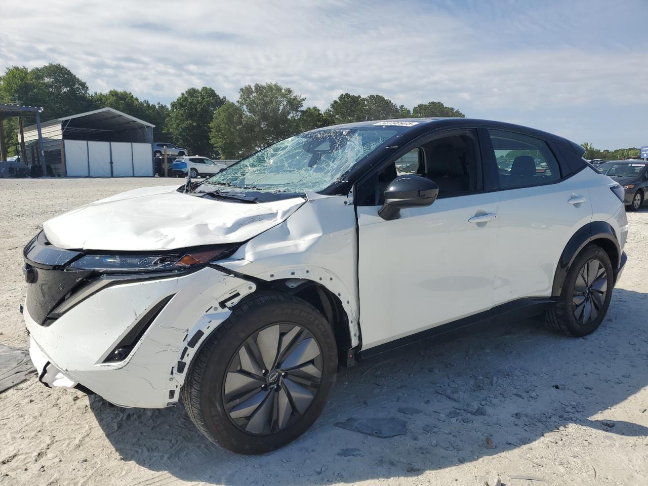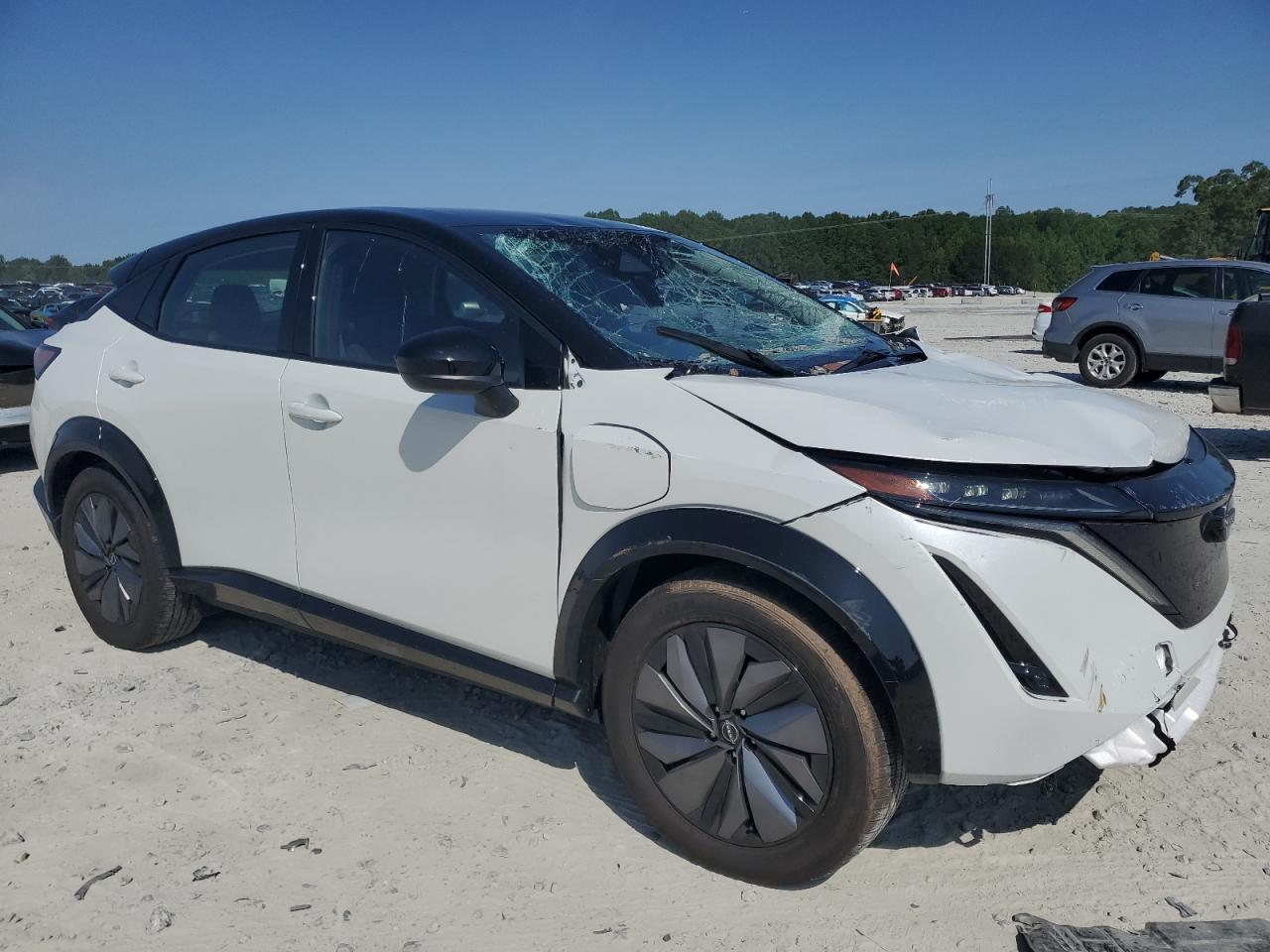 FairThis is a damaged 2023 Nissan Ariya EVOL. The primary damage is to the front end, with secondary damage from vandalism. The vehicle's white exterior shows significant damage, including a shattered windshield and damaged front body panels. The wheels appear intact. The interior shows some wear and tear, but generally appears to be in acceptable condition. The car is listed as Run & Drive Verified.