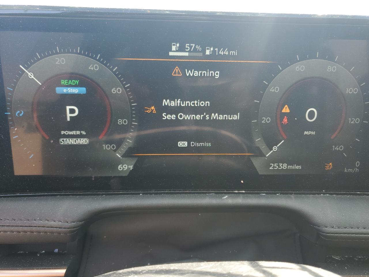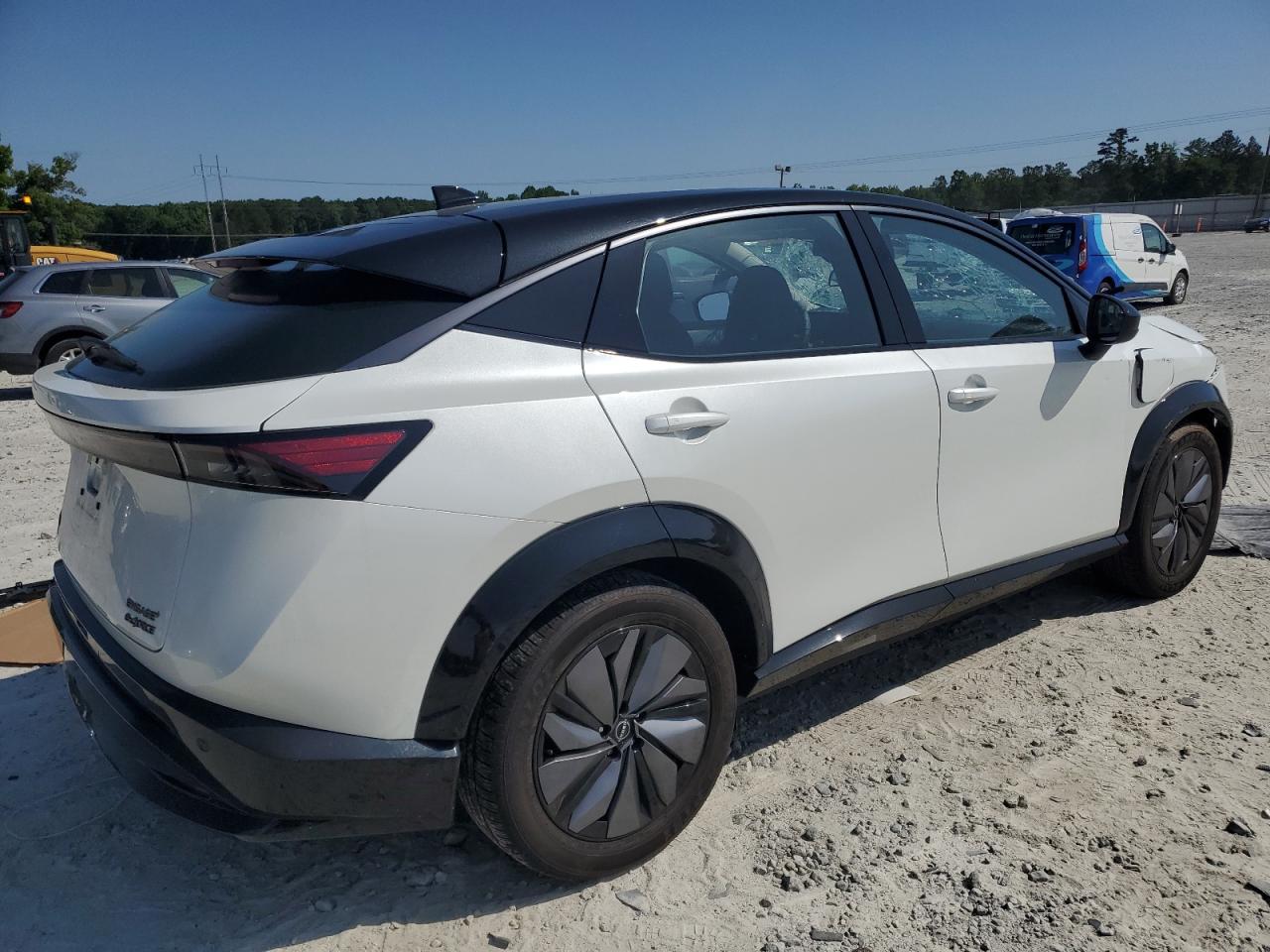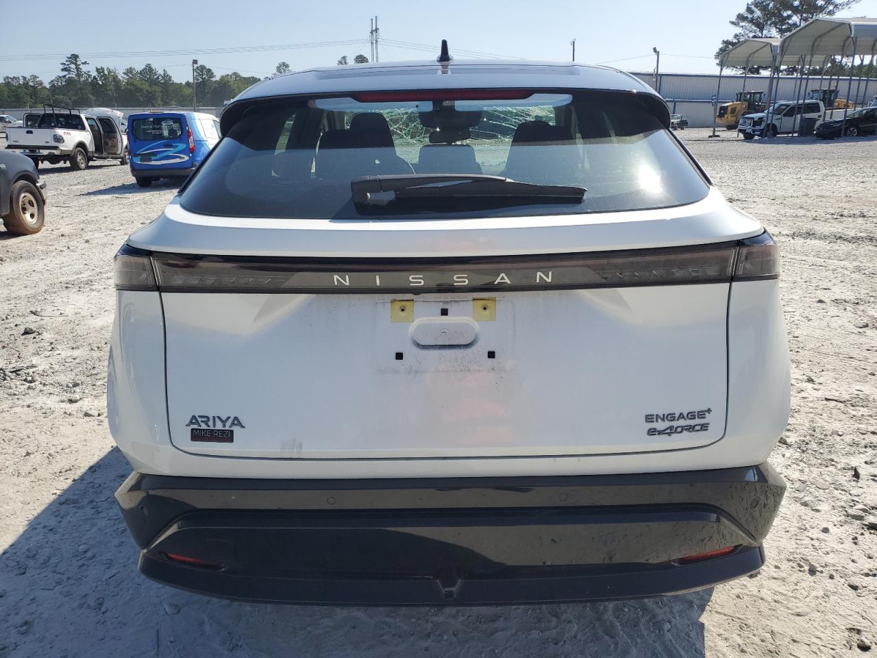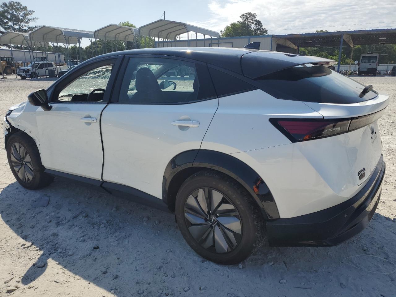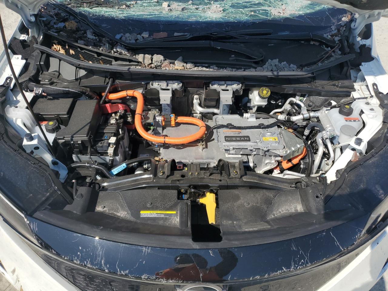 FairThis is a damaged 2023 Nissan Ariya EVOL. The primary damage is to the front end, with secondary damage from vandalism. The vehicle's white exterior shows significant damage, including a shattered windshield and damaged front body panels. The wheels appear intact. The interior shows some wear and tear, but generally appears to be in acceptable condition. The car is listed as Run & Drive Verified.