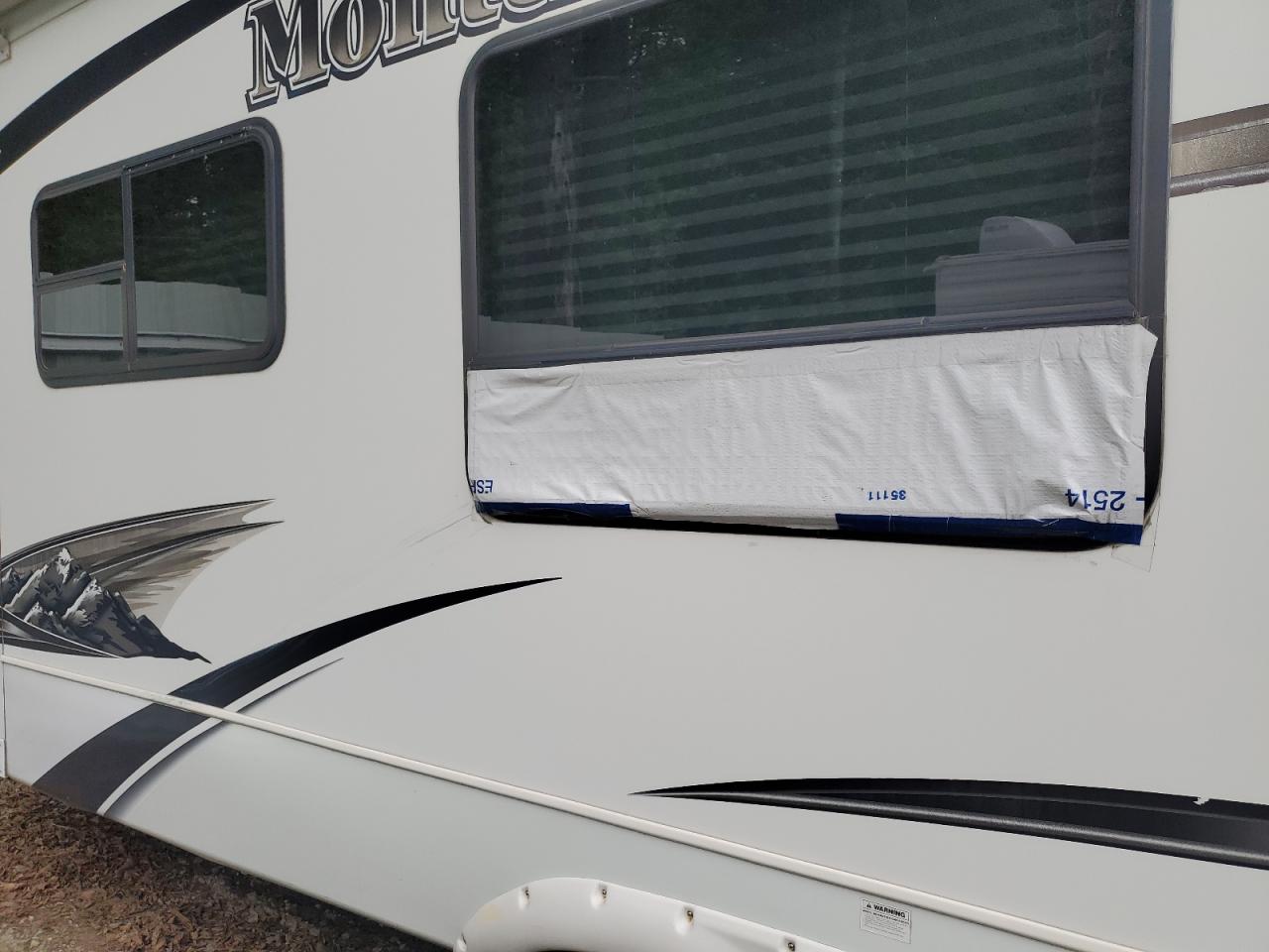 The RV has damage to the roof and side panels. The wheels and lights seem to be intact. The glasses are also in good condition. Interior damage requires an additional inspection