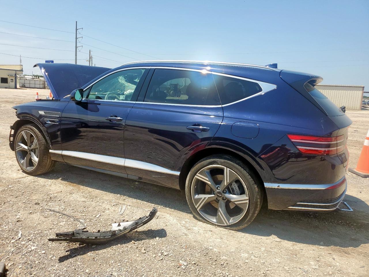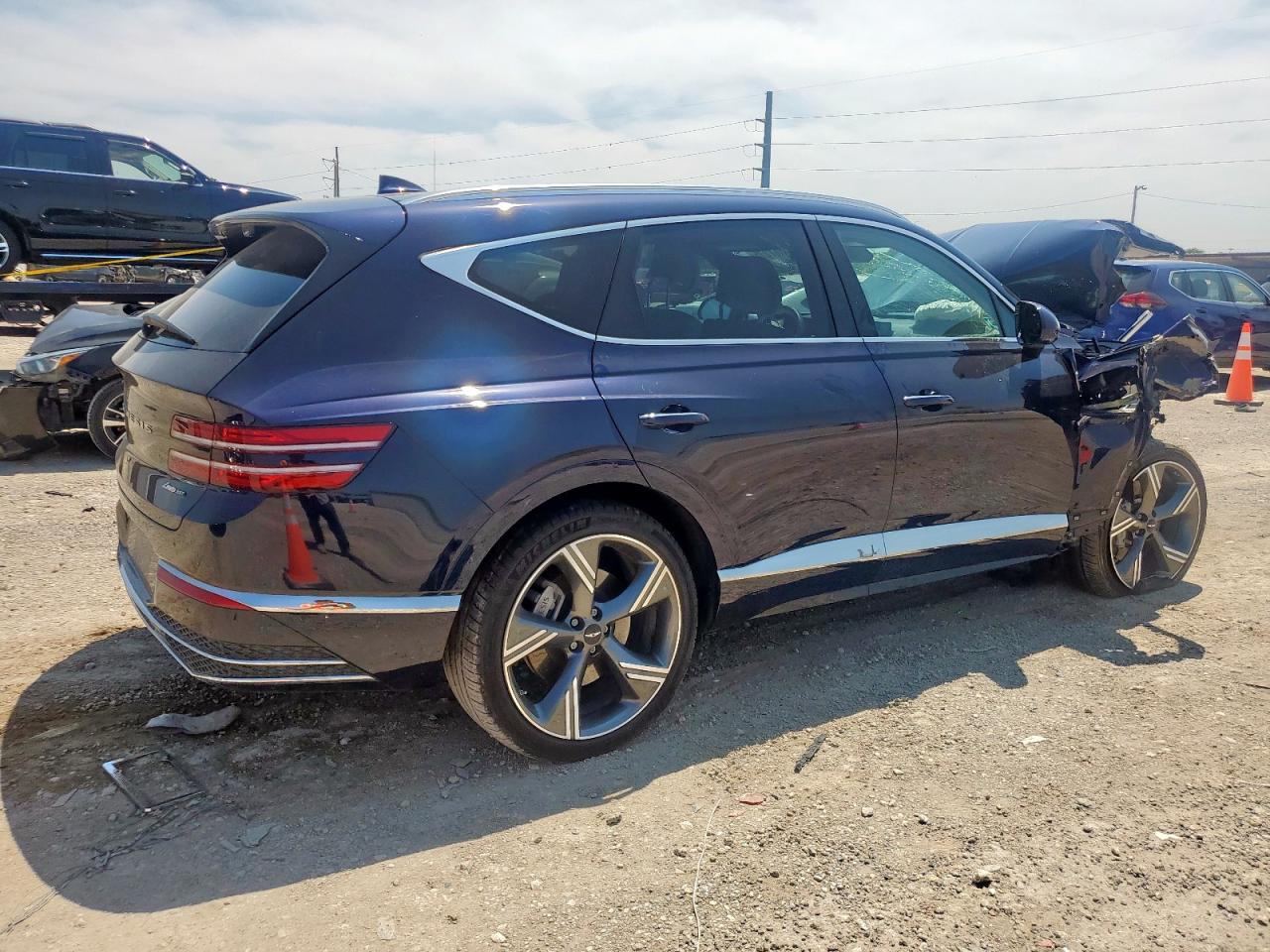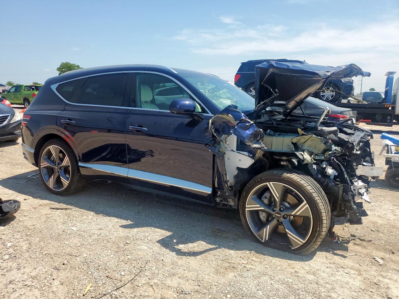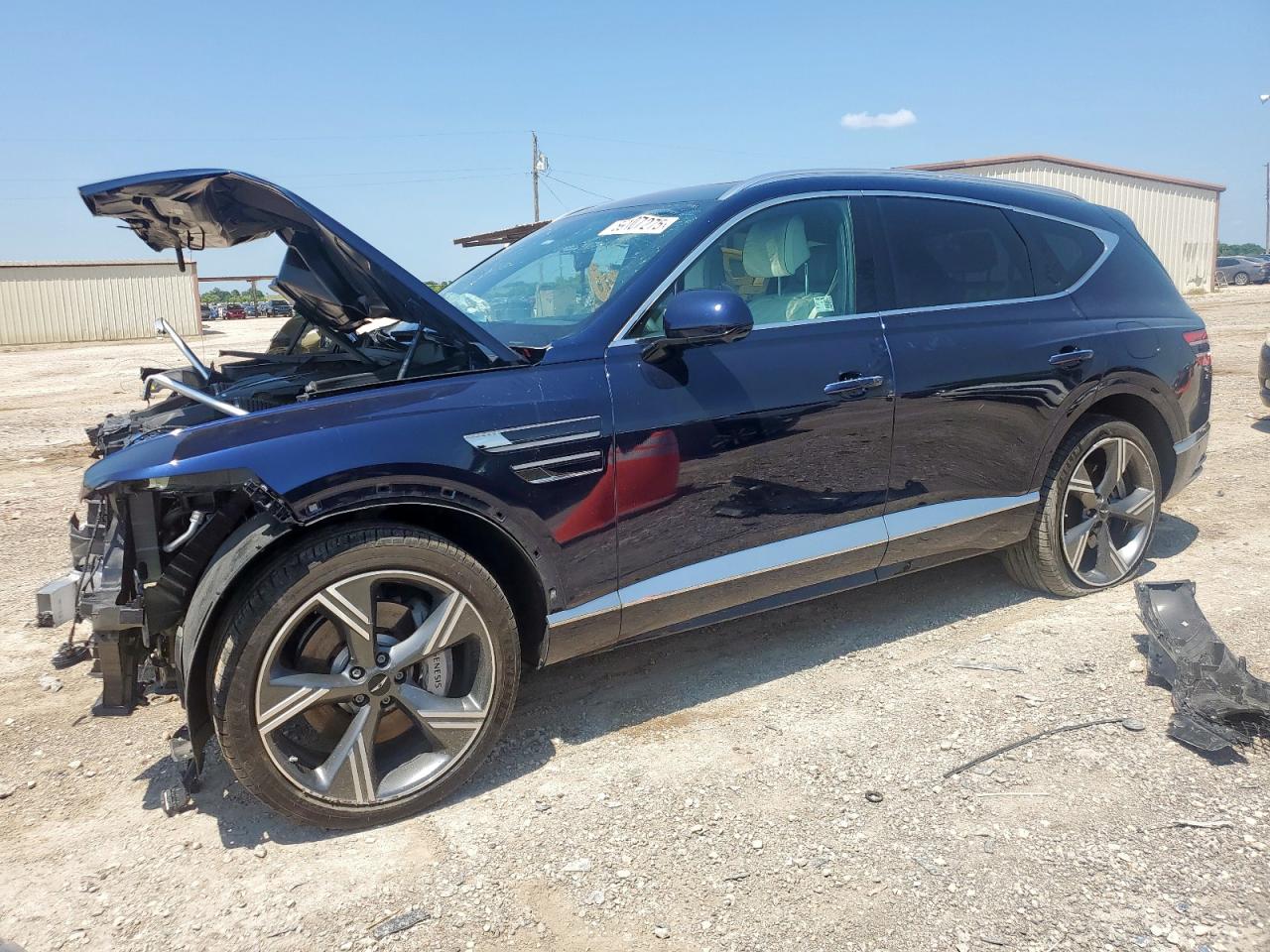 FairThis is a damaged 2025 GENESIS GV80 PREST, dark blue in color. The primary damage is to the front end, with significant body damage. The wheels appear to be intact, but the front lights and front of the car are heavily damaged. Interior also shows damage, with deployed airbags.