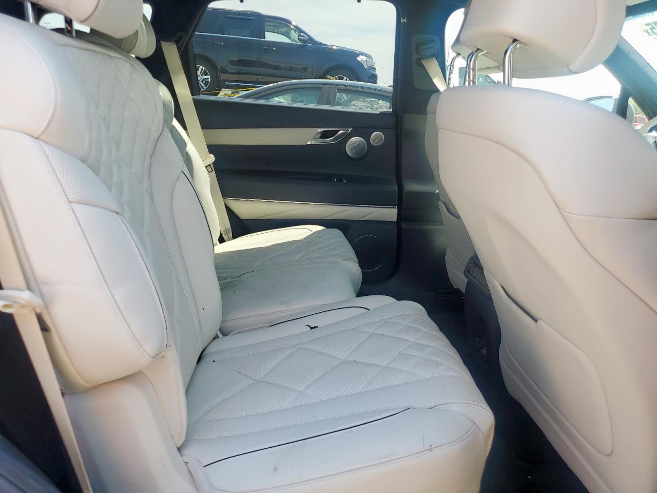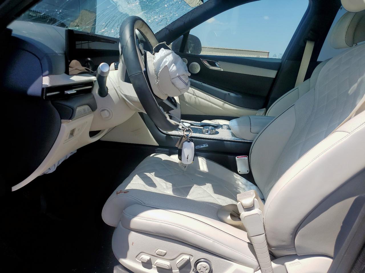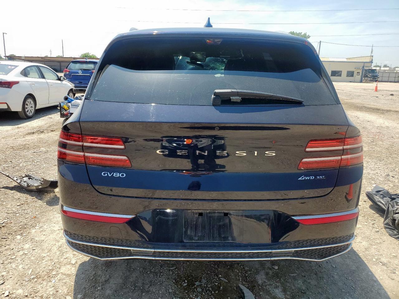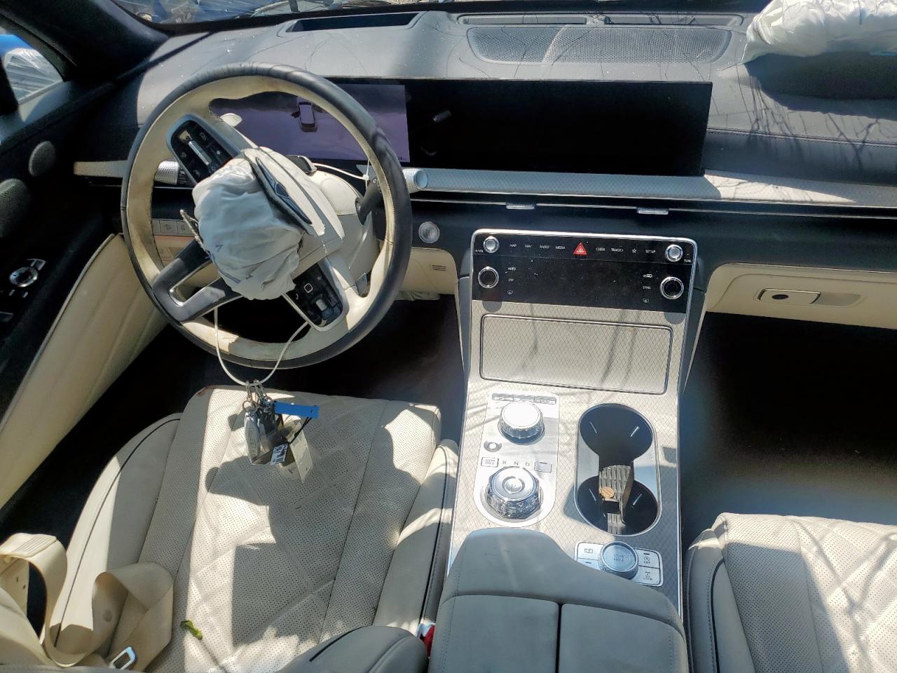 FairThis is a damaged 2025 GENESIS GV80 PREST, dark blue in color. The primary damage is to the front end, with significant body damage. The wheels appear to be intact, but the front lights and front of the car are heavily damaged. Interior also shows damage, with deployed airbags.