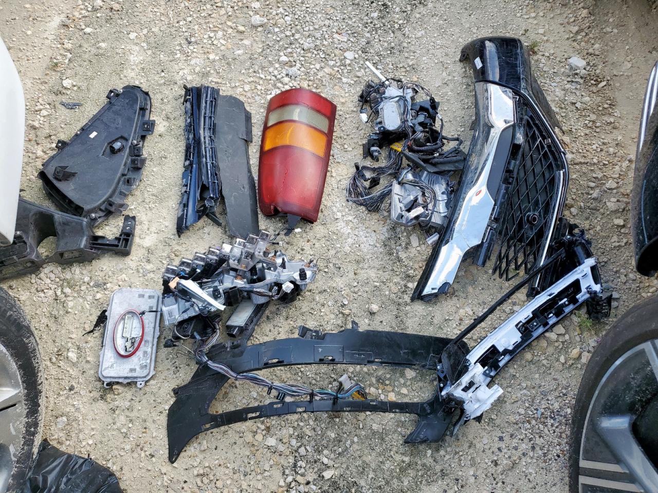 The vehicle has suffered extensive front-end damage, including a missing front bumper, damaged front panels, and deployed airbags. The body panels are dented and deformed. The interior shows signs of airbag deployment. The car's overall state is poor.