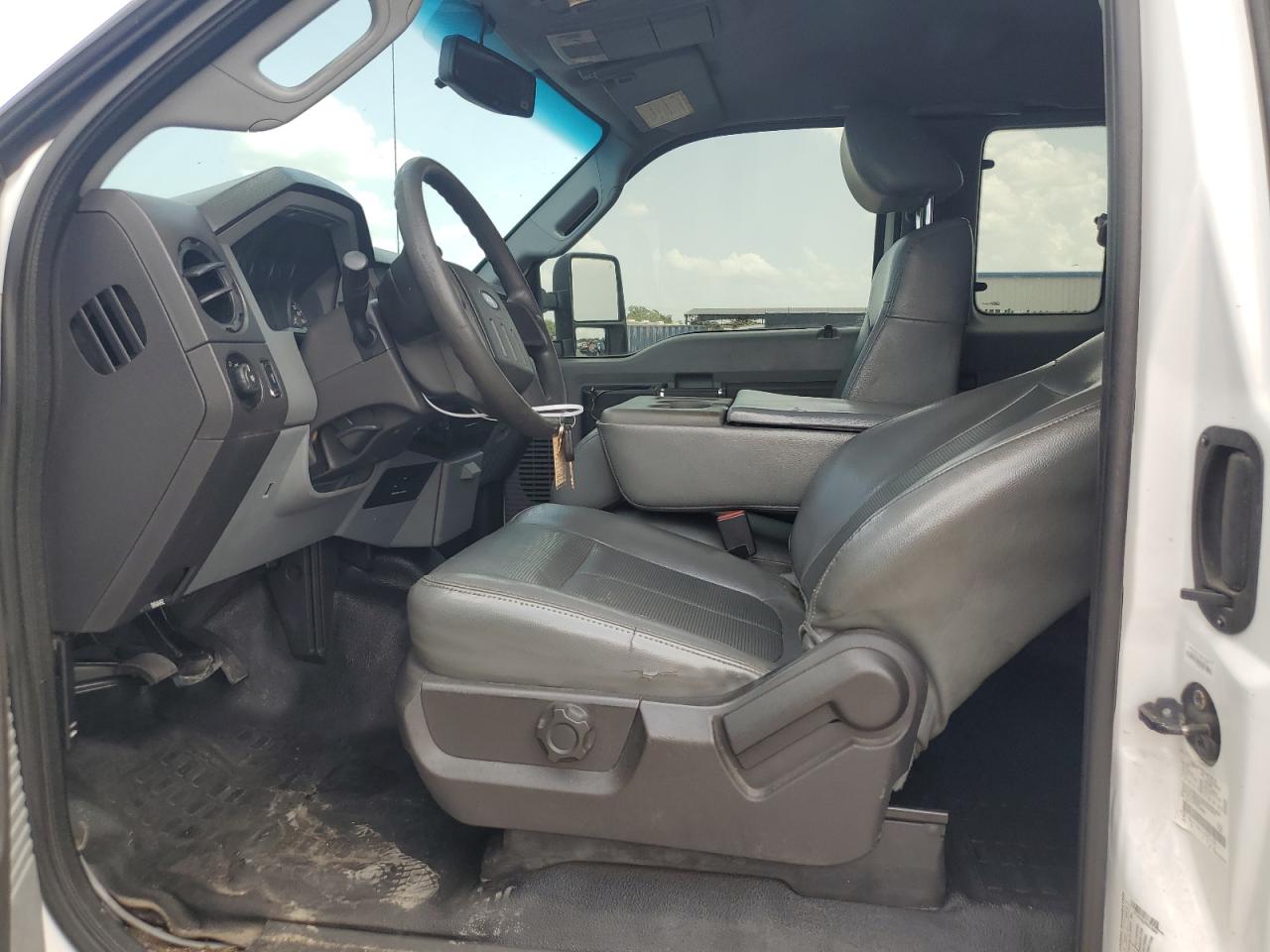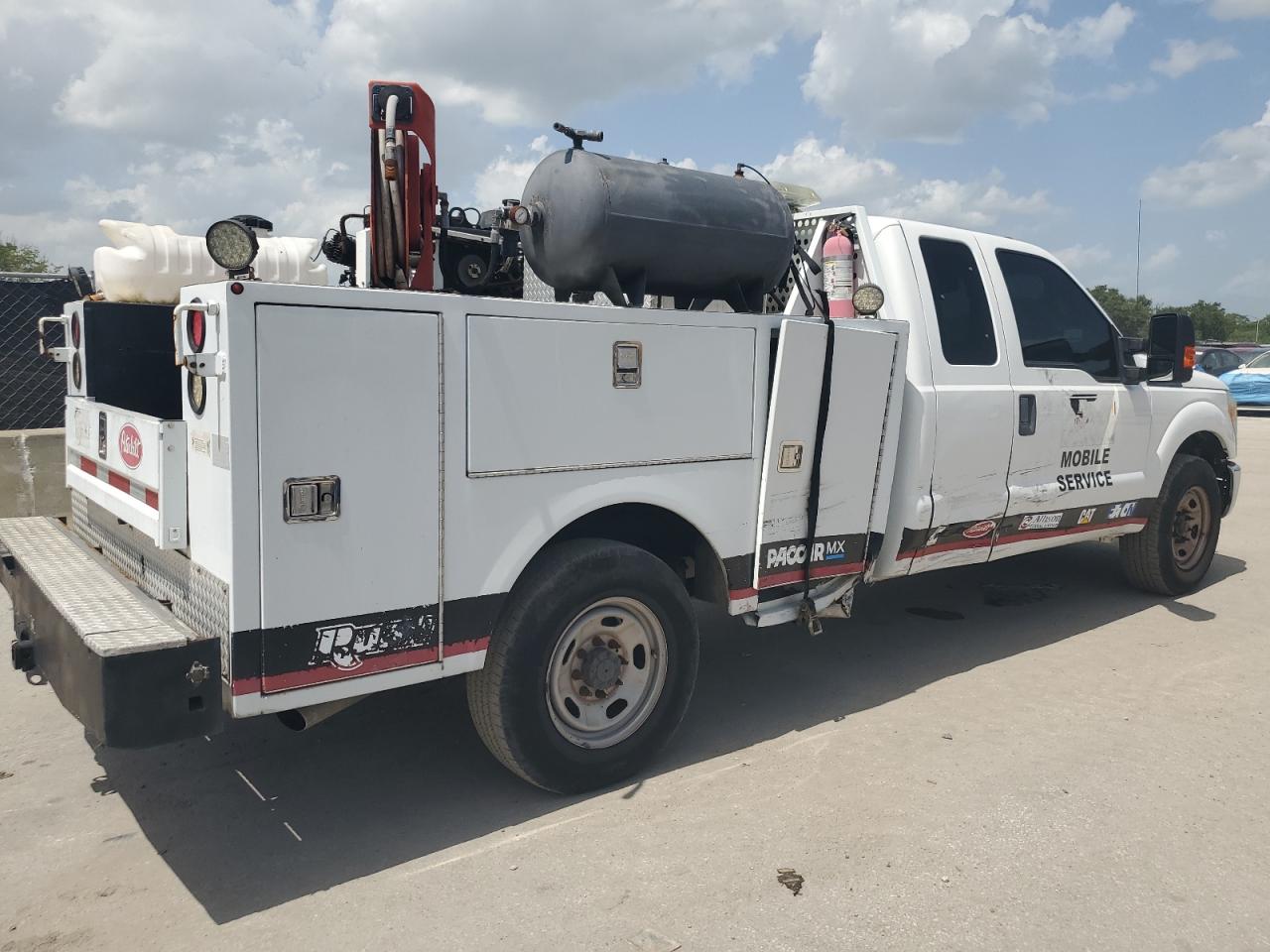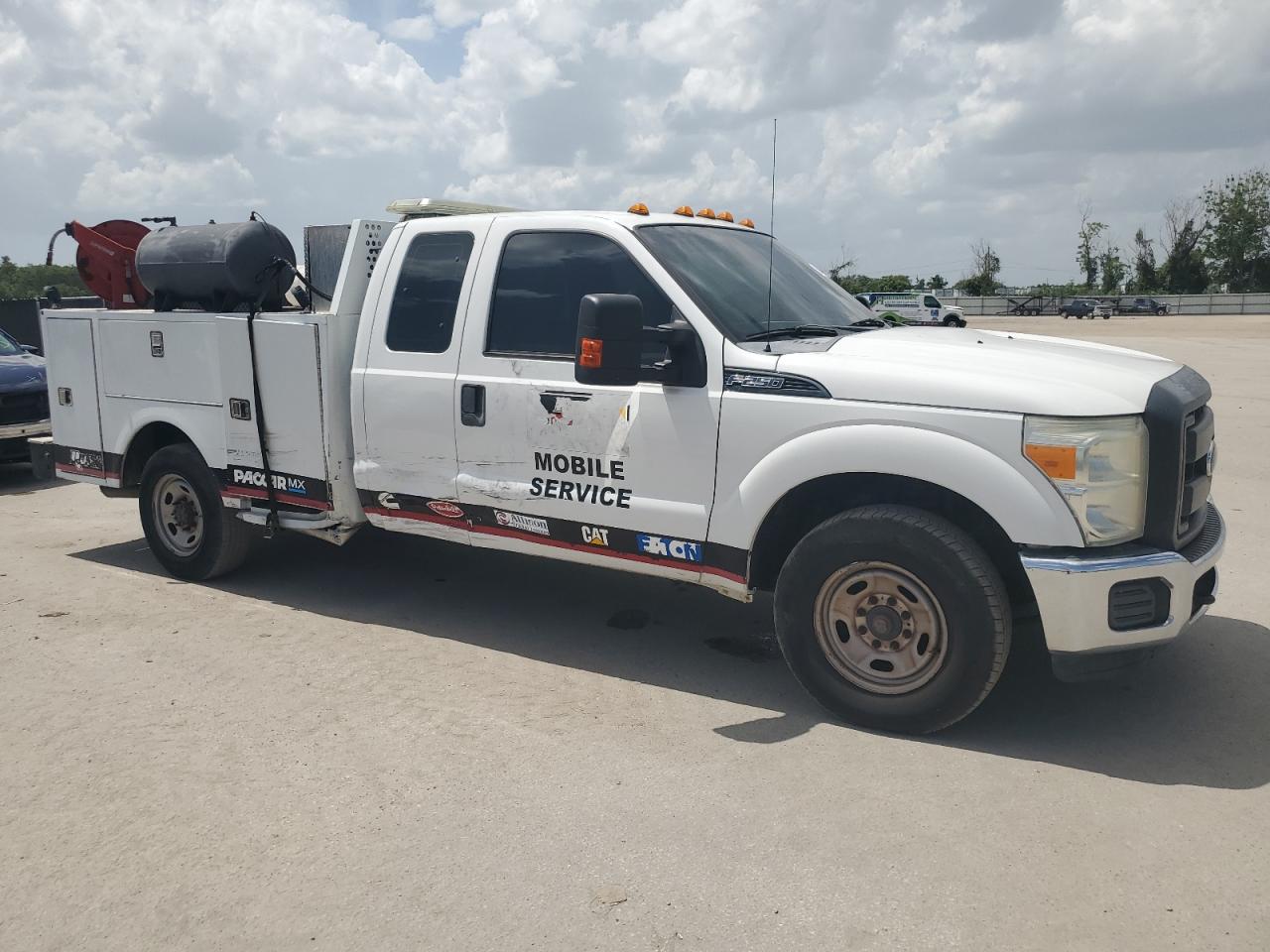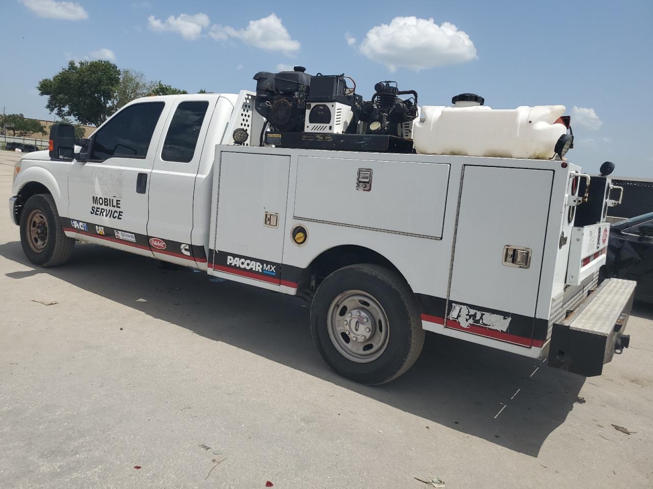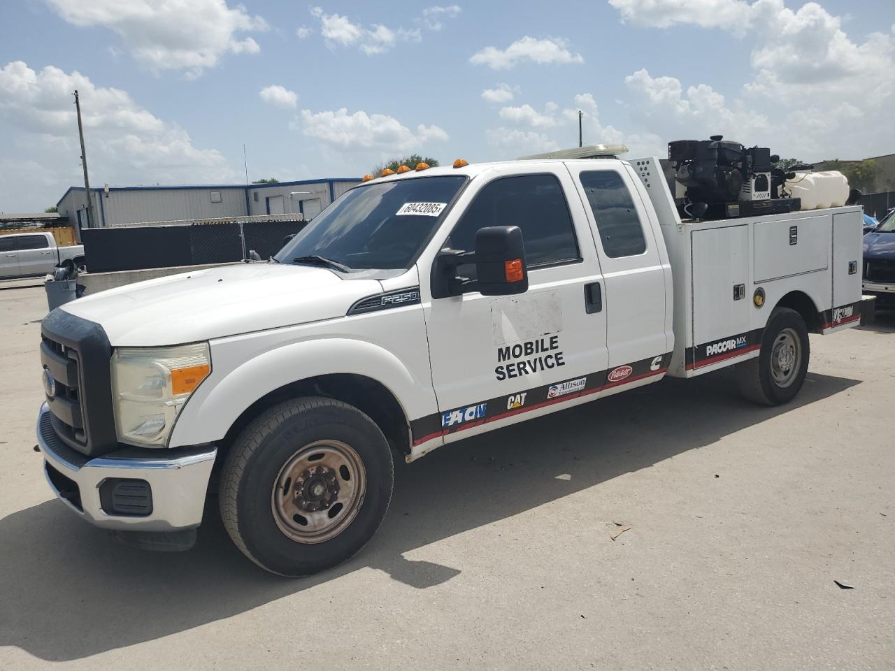 The FORD F250 SUPER DUTY 2015, is a white truck that has sustained side damage. The vehicle is confirmed to Run & Drive Verified. The interior condition appears to be in good shape, with no immediately visible issues. The car has a "Mobile Service" branding and appears to be equipped for utility work. The vehicle damage category is body, with the car being drivable, the overall exterior condition has been improved.