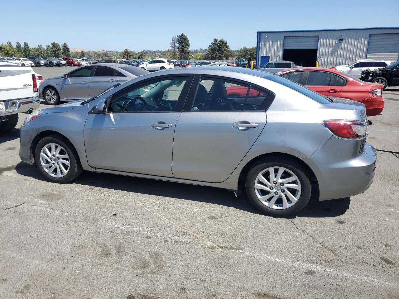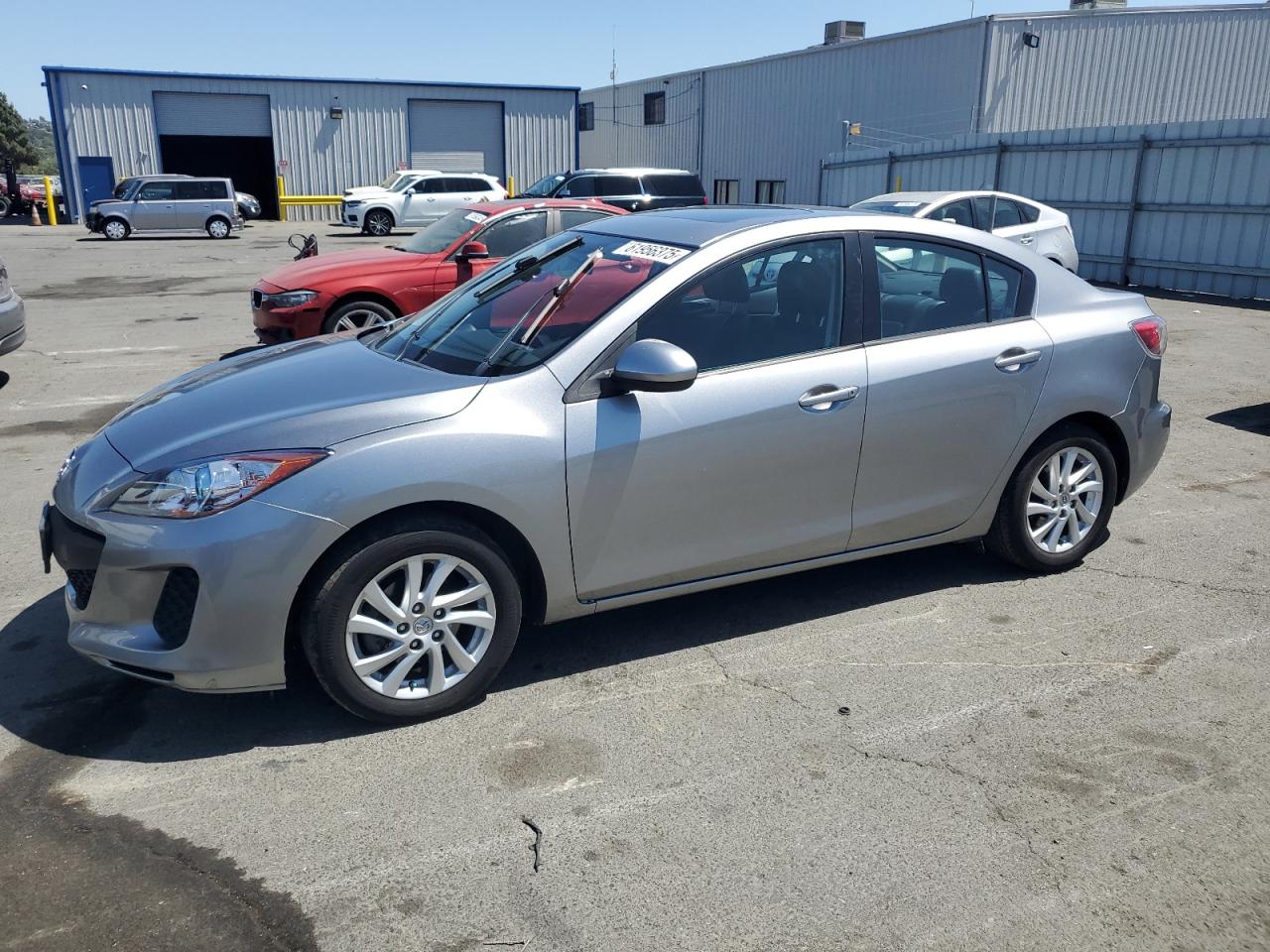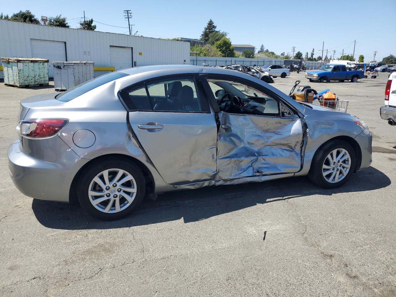 FairThe 2012 Mazda 3 is silver with significant side damage. The primary damage is to the side panels, with no visible secondary damage. The wheels and lights appear to be in good condition. Interior shows normal wear and tear, with the seats and dashboard showing minor signs of use.