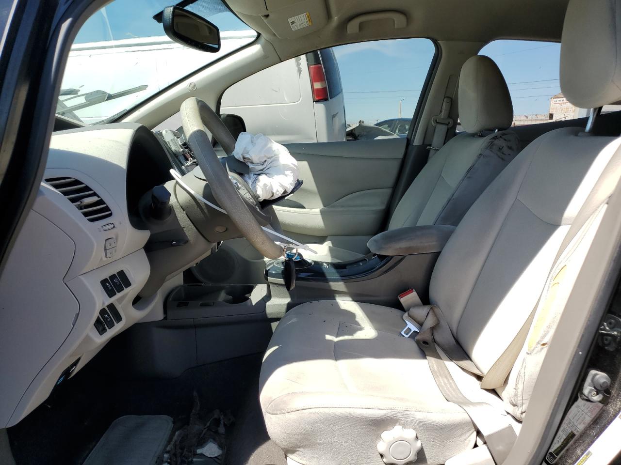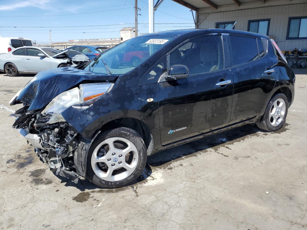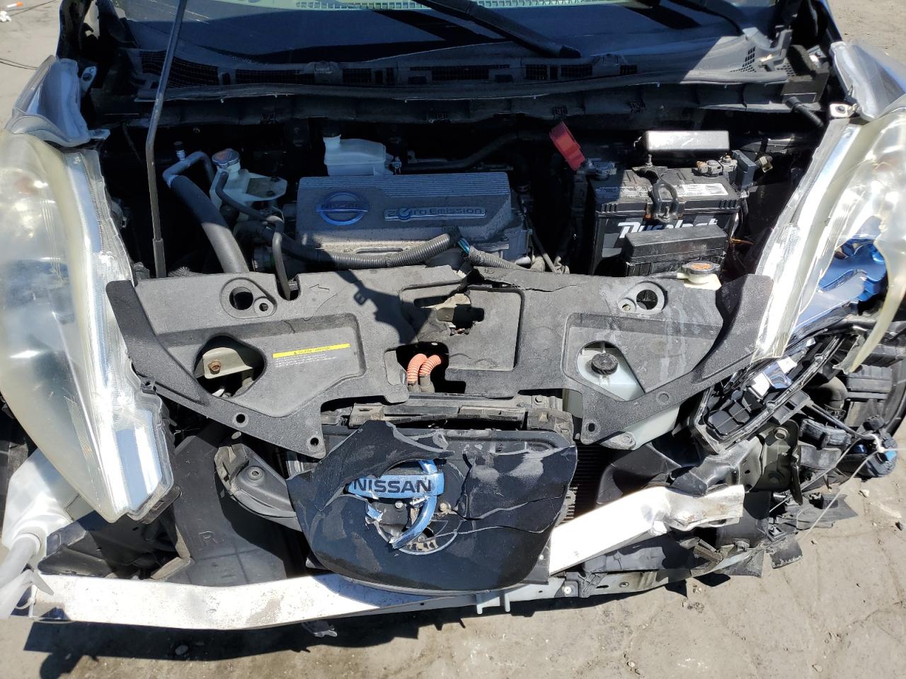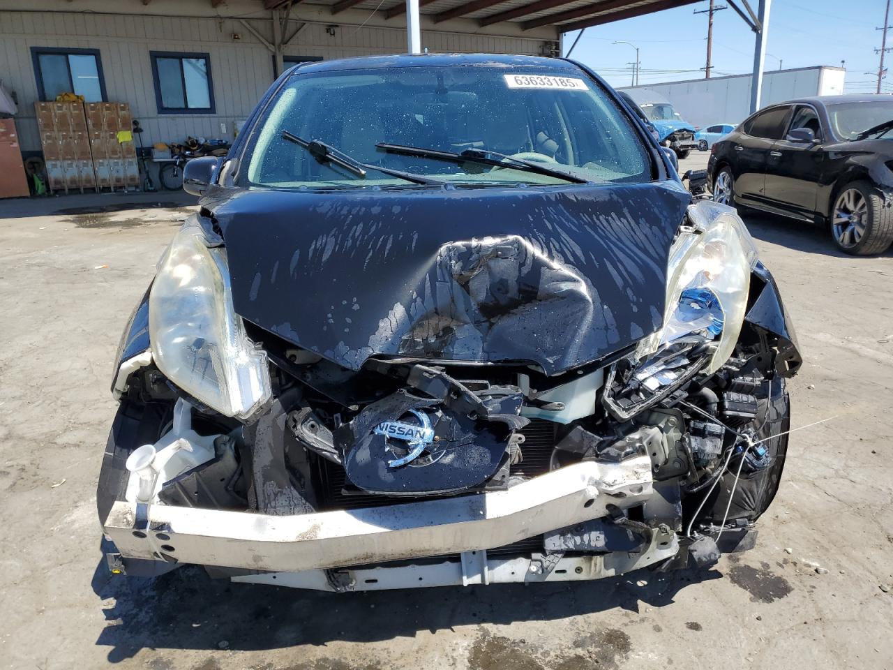 FairThis is a 2011 Nissan LEAF SV, black in color. The vehicle sustained significant front-end damage, including damage to the lights, front panel and the front bumper, the airbags has been deployed and interior is in not good condition. The car's exterior presents moderate damage overall.