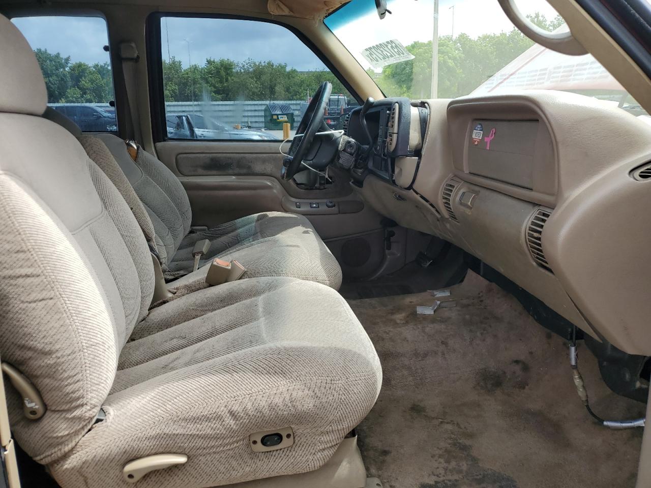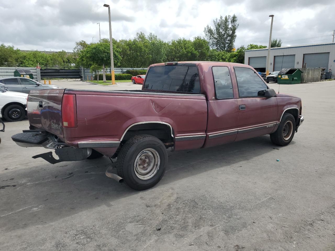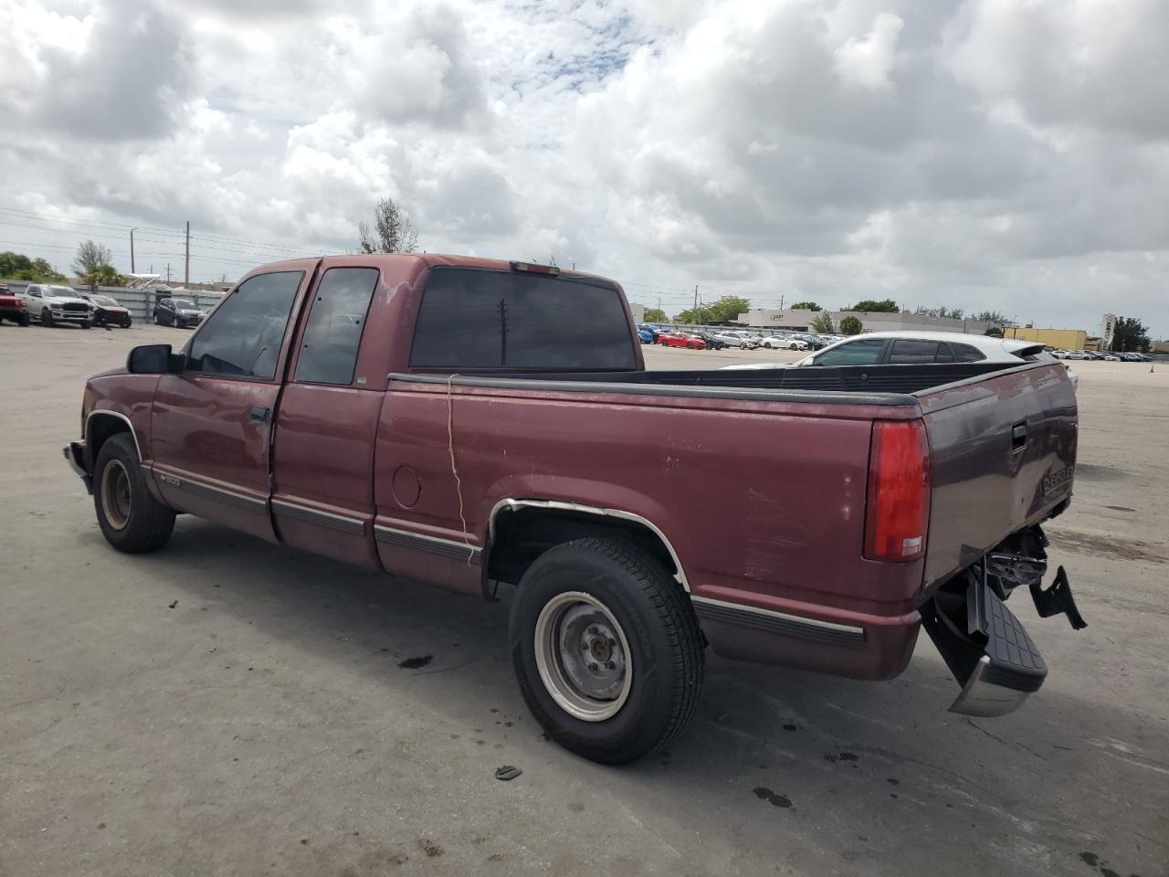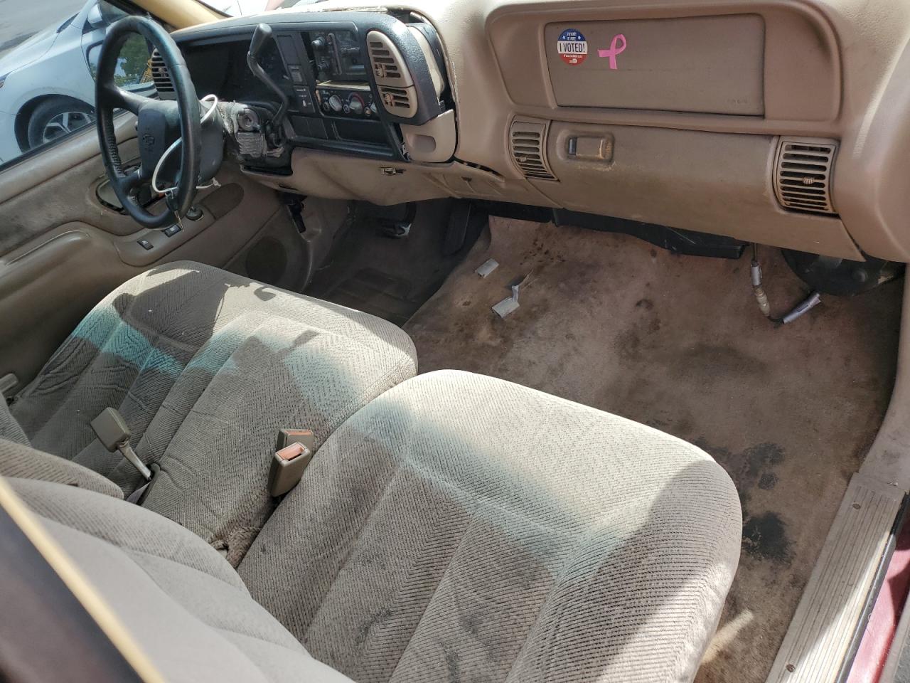 FairThe CHEVROLET GMT-400 C1 1998, maroon in color, presents with significant damage to its rear end, body panel damage, and a compromised front end. The interior shows wear and tear, indicating a need for potential repairs. The vehicle's overall state reflects its exterior and interior conditions. The wheels, lights, and glasses appear intact, but the overall appearance suggests a need for restoration. The car is drivable.