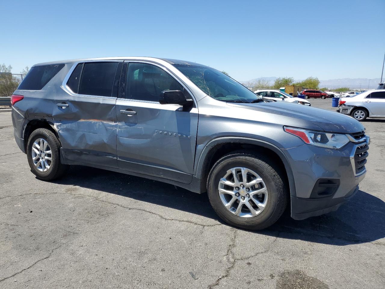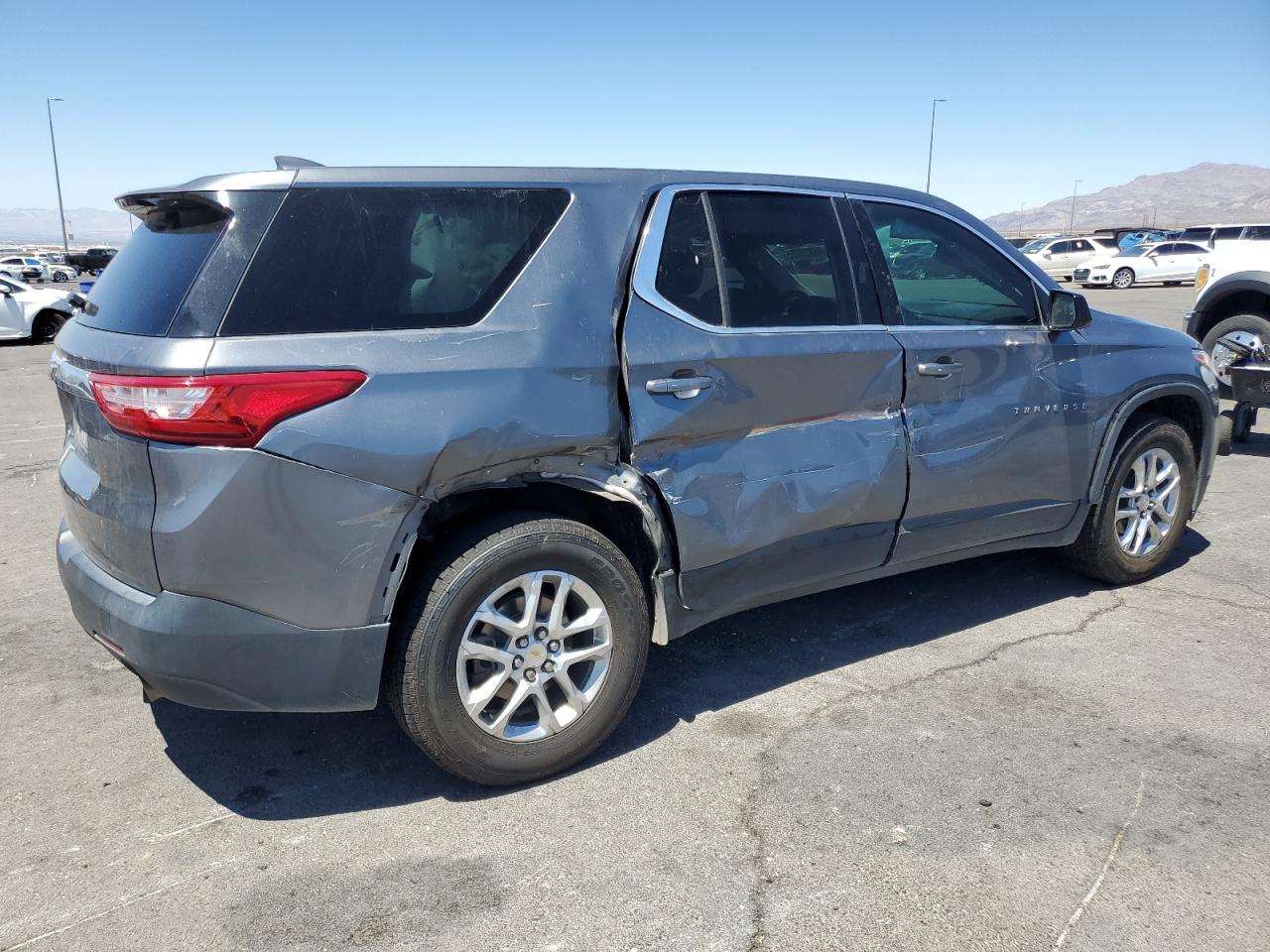 Side and rear end impact damage on a gray 2020 Chevrolet Traverse L. The body panels have significant dents and deformations, particularly on the side. The rear end also shows signs of impact. The vehicle is drivable but requires repairs. The interior has normal wear and tear, and no visible damage airbags.