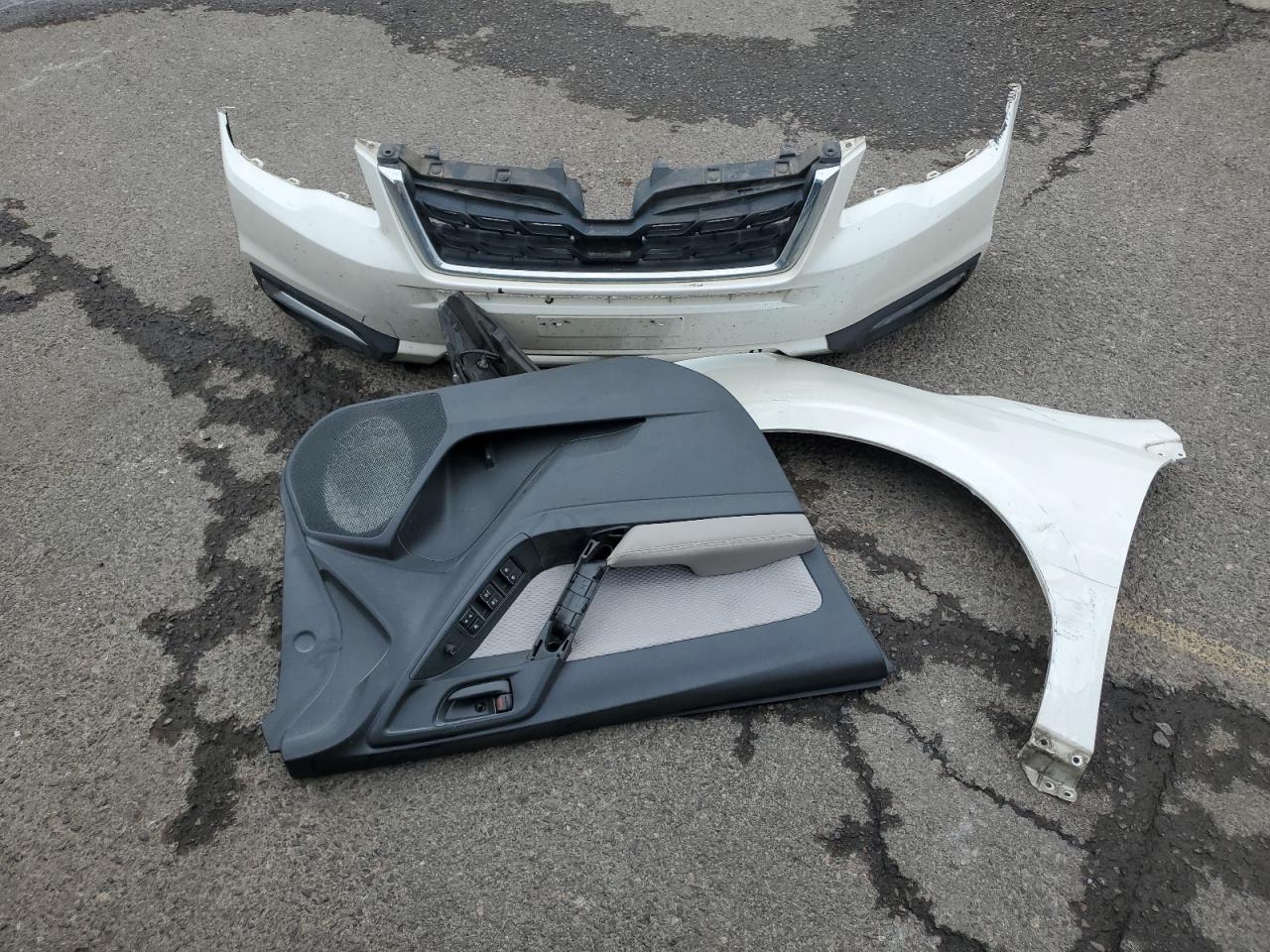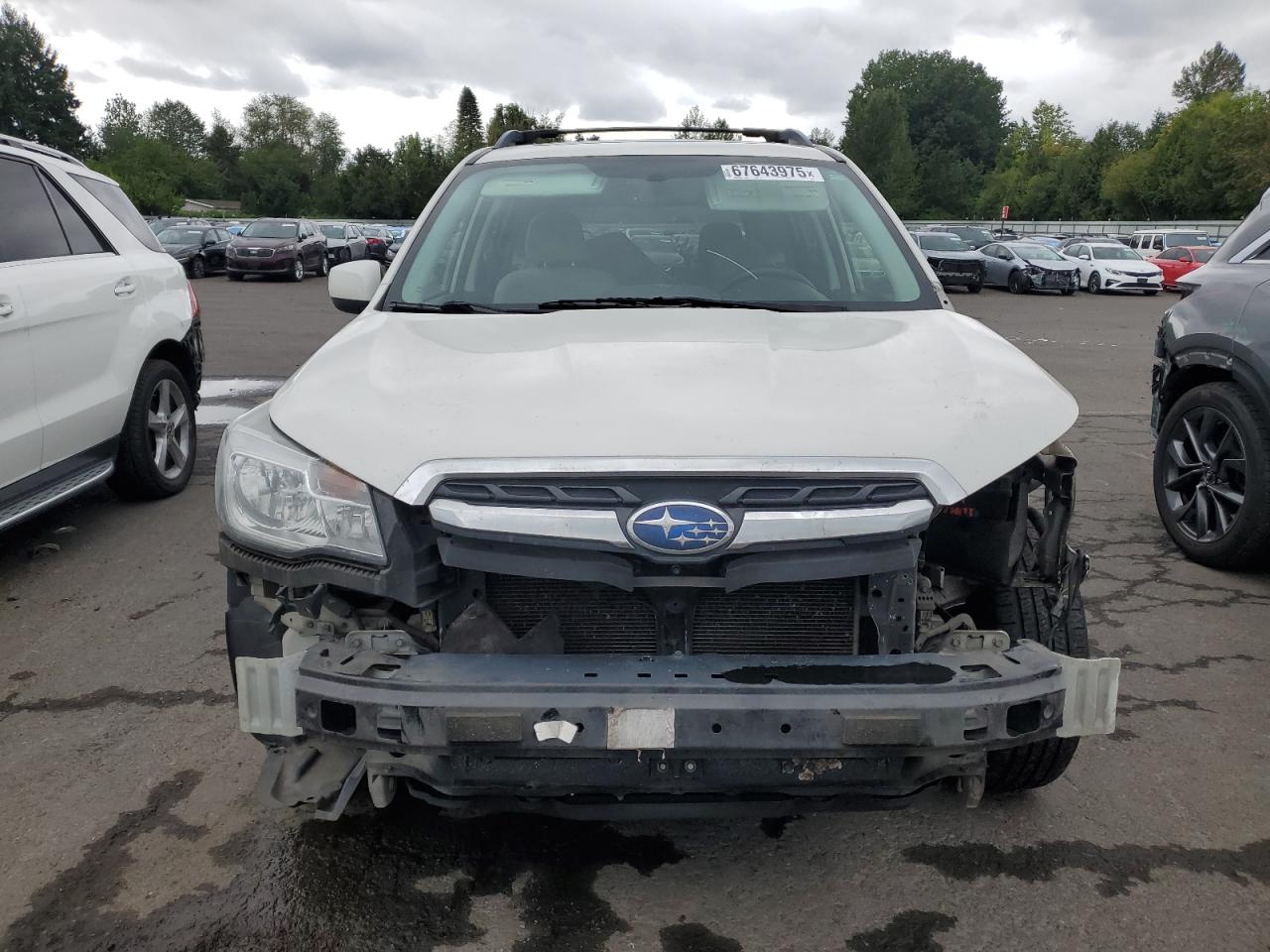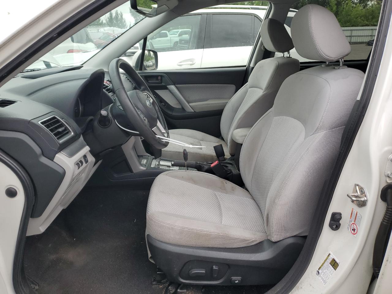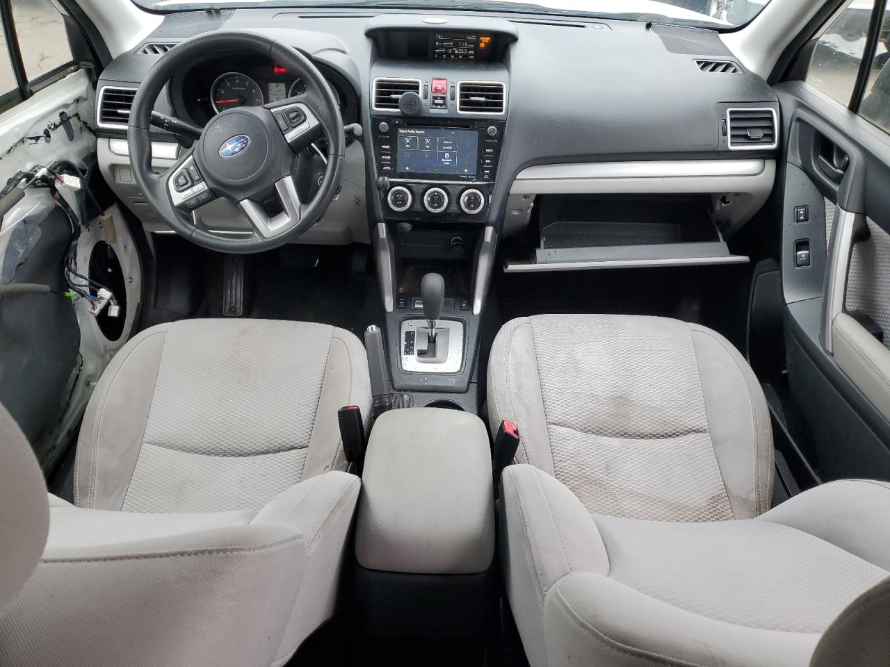 Fair2017 SUBARU FORESTER 2 with front-end damage. Vehicle is white with run and drive verification. The vehicle exhibits significant front-end damage, including the absence of the front bumper, lights, and significant body panel damage. The wheels appear intact. The interior shows signs of wear consistent with its age and mileage, but it's in good shape.