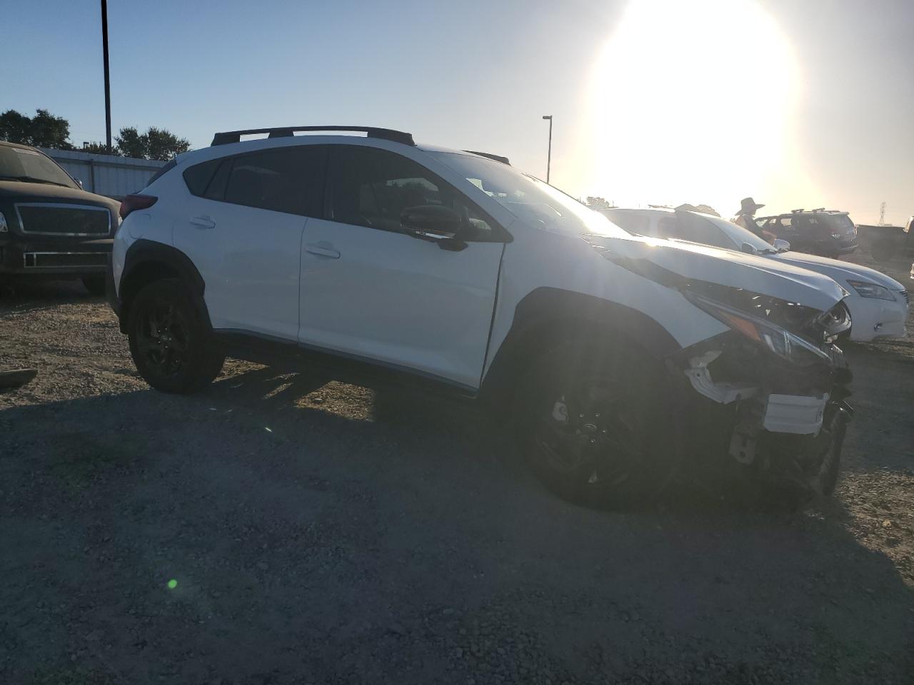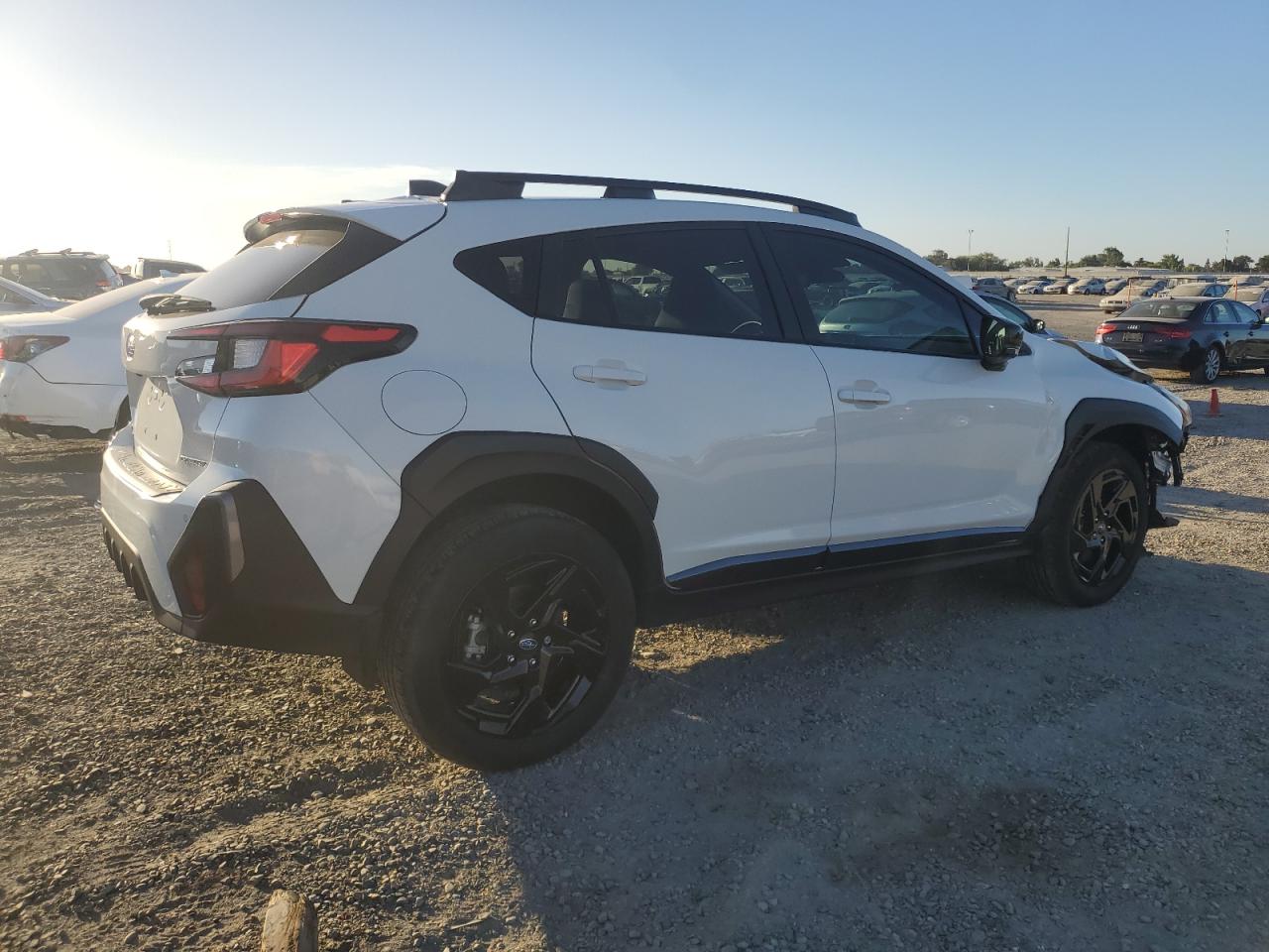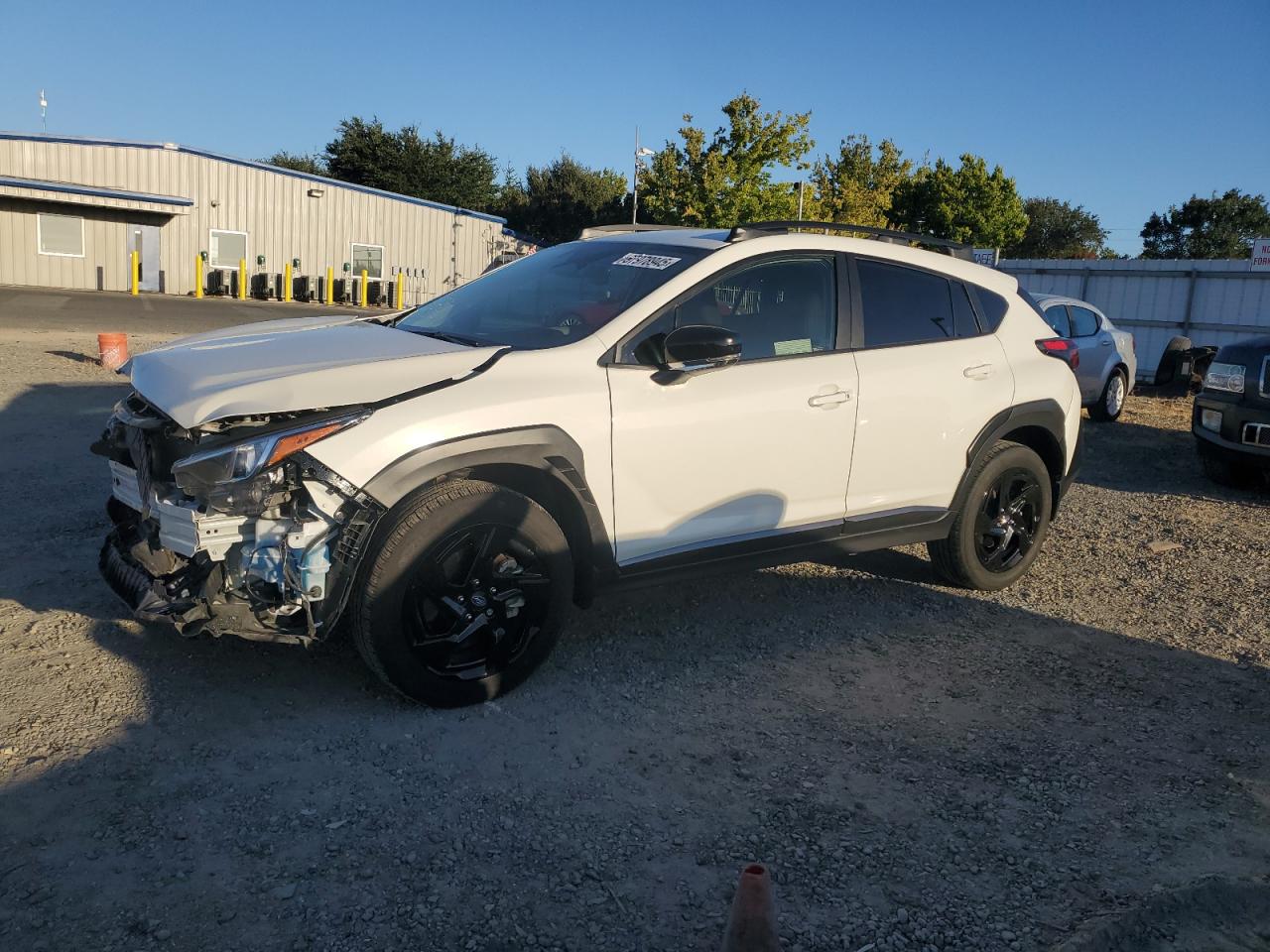 FairThis is a white 2024 Subaru Crosstrek with front end and side damage. The car is a Run & Drive Verified vehicle. The vehicle's front end shows significant damage, including the front bumper, fenders, and possible suspension components. The side damage suggests impact to the side panels, potentially affecting doors and quarter panels. Wheels appear intact, and the glass seems undamaged. The interior presents well, with no immediate signs of major damage.