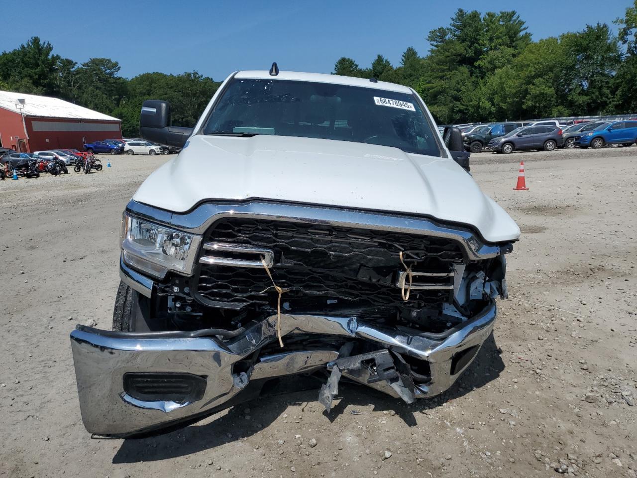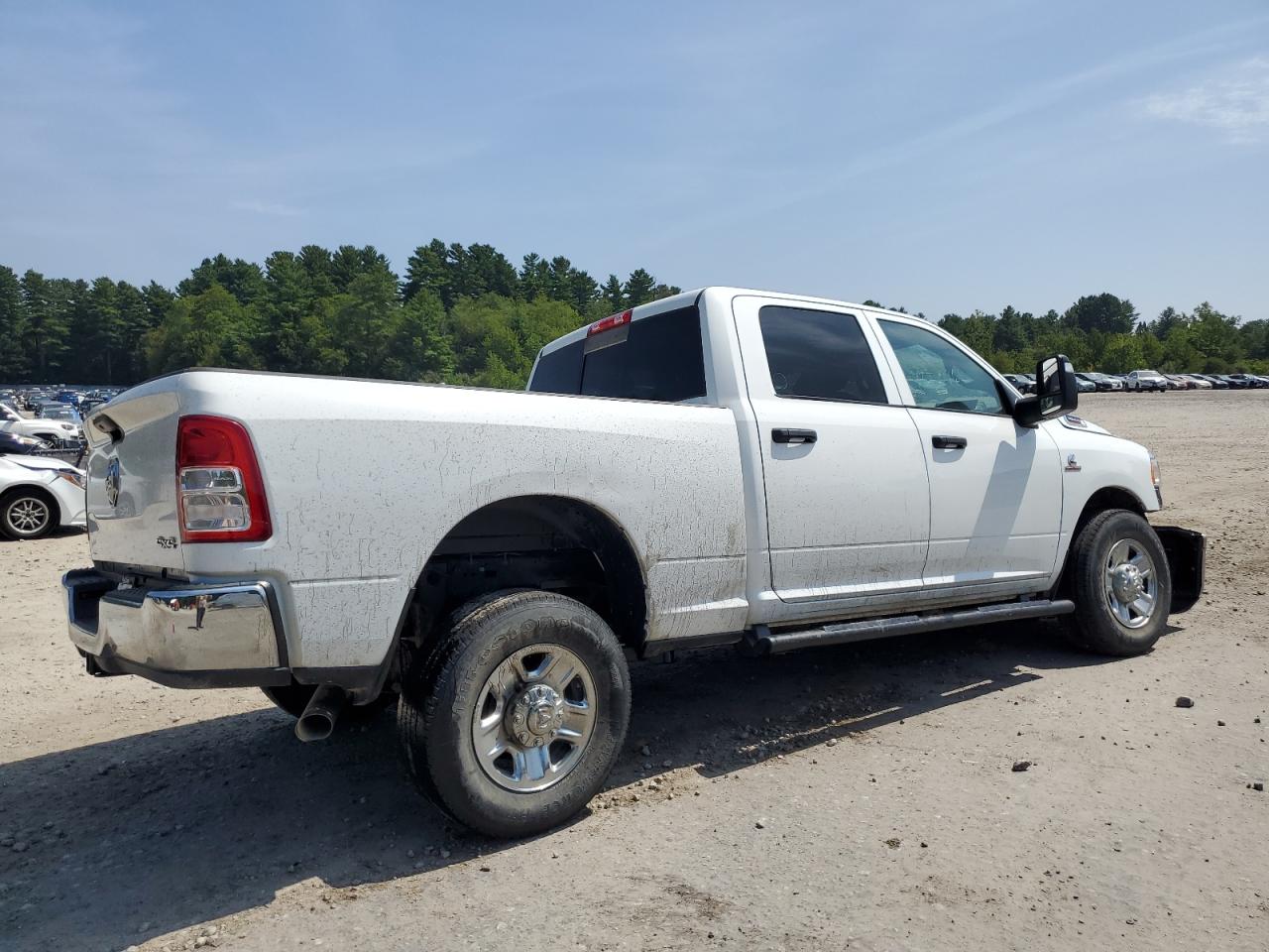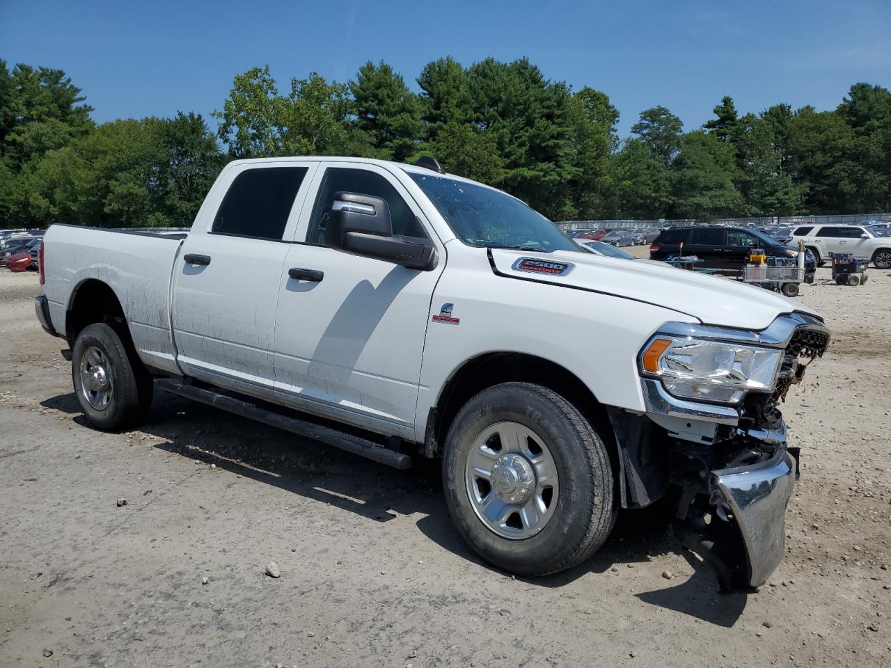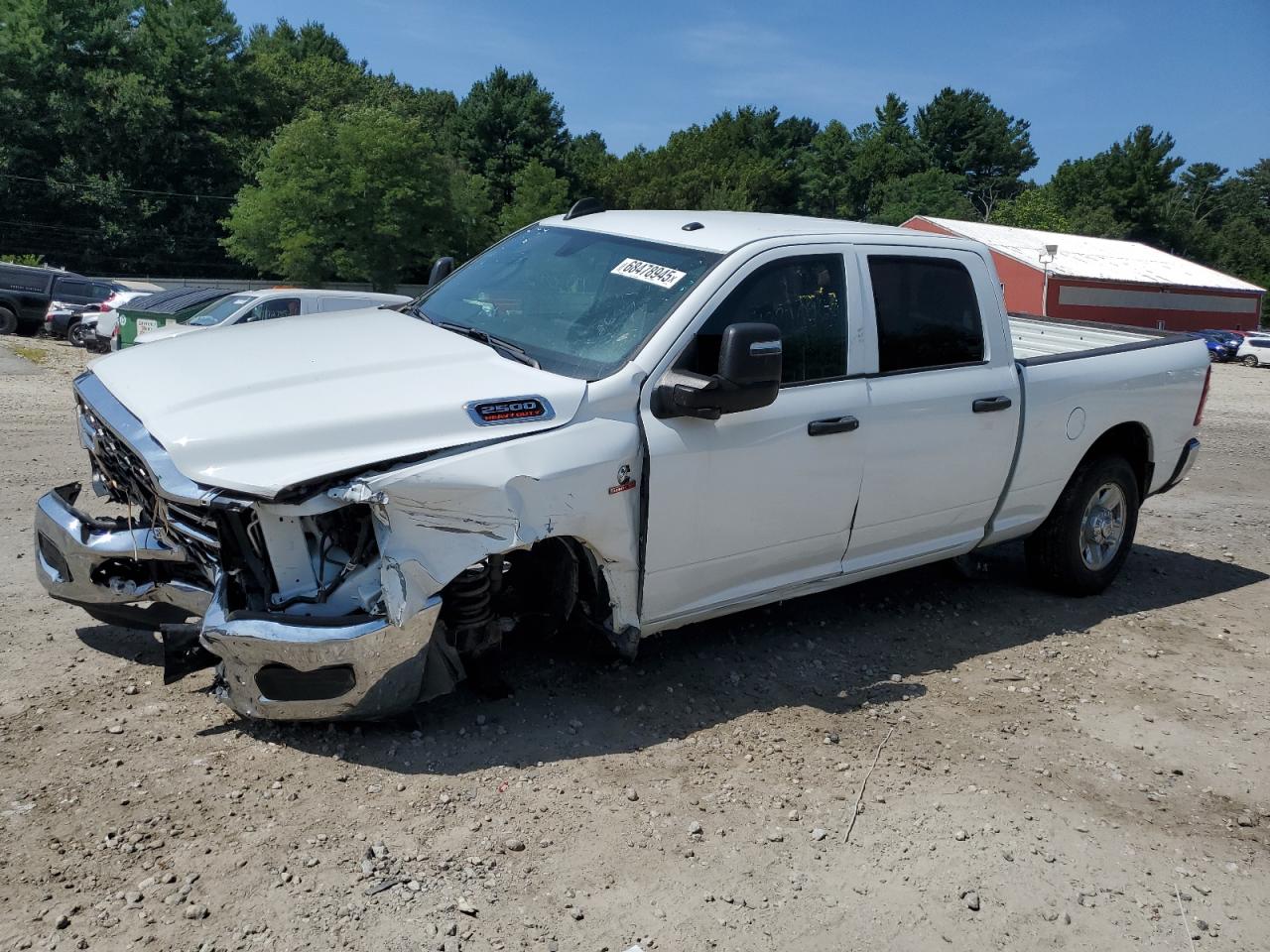 FairThe white 2023 RAM 2500 Tradesman has sustained significant front-end damage. The front of the vehicle, including the bumper, lights, and front panels, exhibits extensive damage. The vehicle's exterior shows signs of wear and tear. The interior appears to be in good condition. The vehicle's overall state is fair, reflecting the need for considerable repairs. The interior shows no signs of airbag deployment.