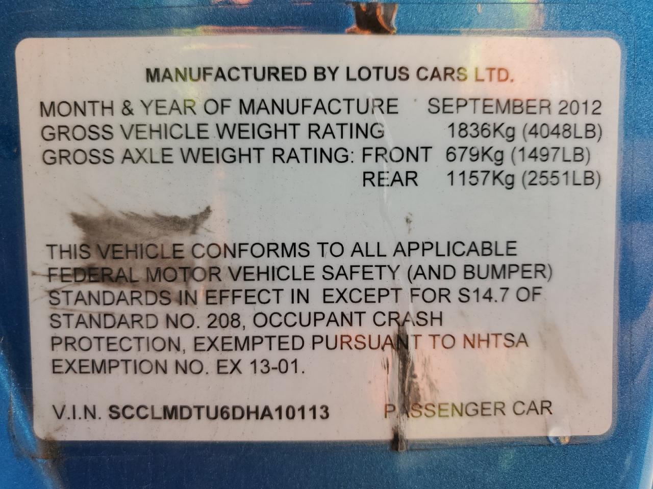 GoodThe 2013 LOTUS EVORA, in a vibrant blue, presents with MINOR DENT/SCRATCHES as its primary damage, indicating a Body category of damage. The car is verified as Run & Drive. The exterior shows minor/moderate visible damage, suggesting the need for potential replacement of a few elements. The interior shows minor visible damage, consistent with age and mileage. The wheels, lights, and glasses appear to be in good condition. This vehicle is drivable and overall in a state that require some fix