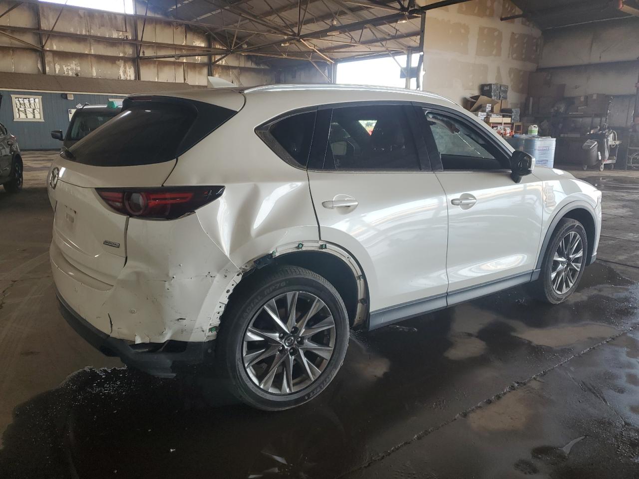 FairThe white 2019 MAZDA CX-5 SIGNA exhibits rear-end damage, body damage. The car starts and drives (Run & Drive Verified). The vehicle's exterior displays moderate visible damage, while the interior shows minor wear consistent with age and mileage. The vehicle may require repairs to be fully functional.