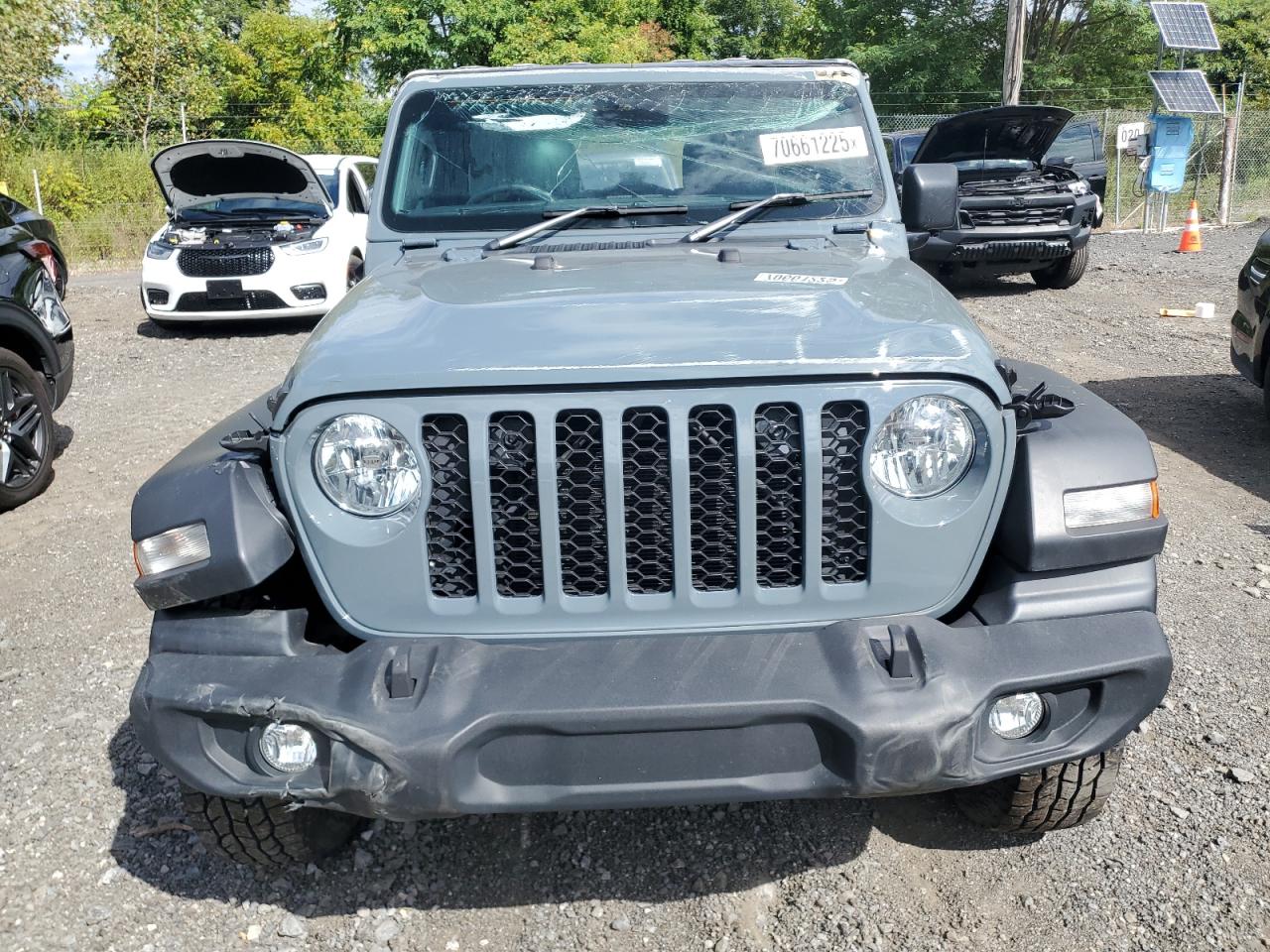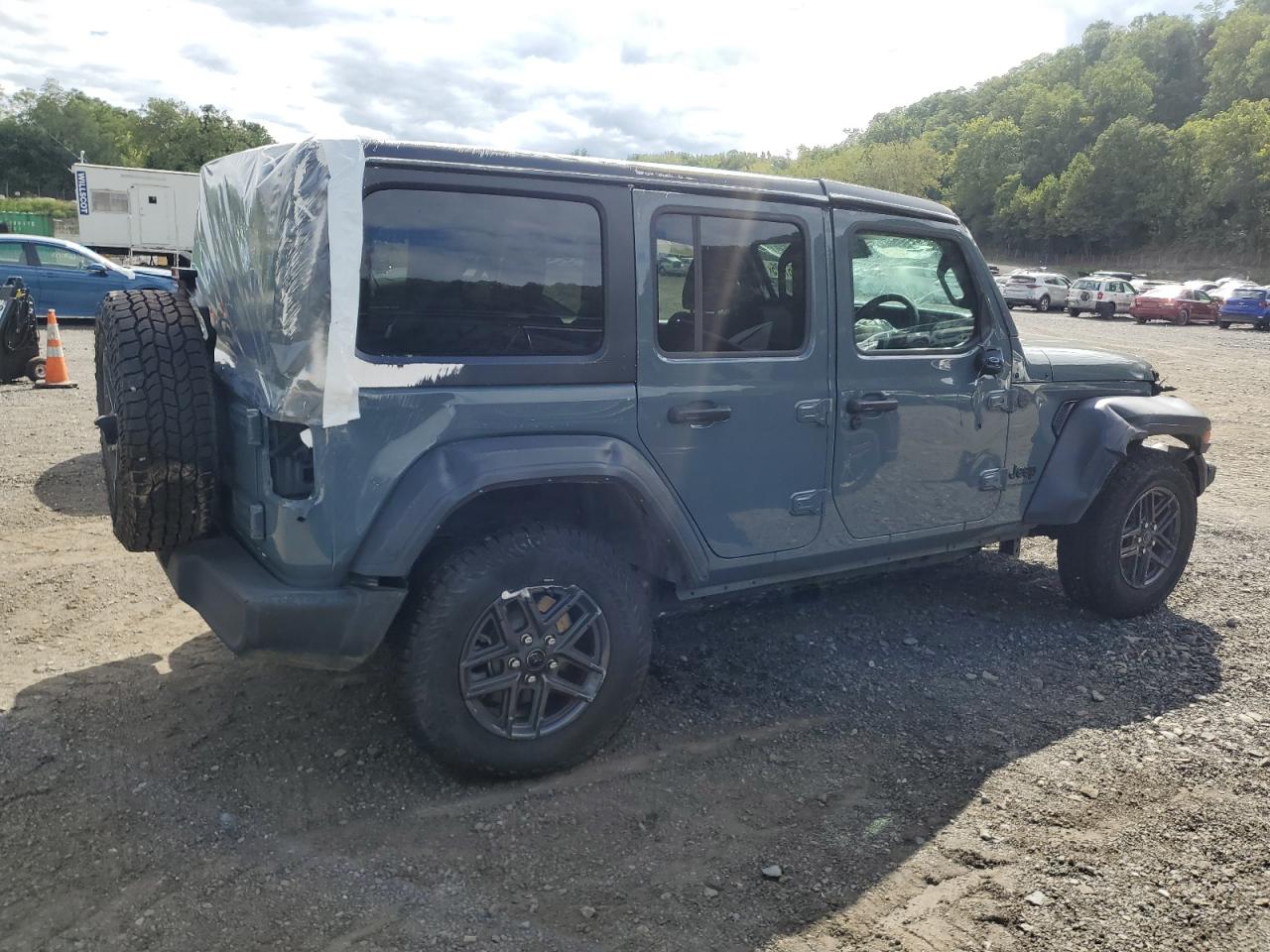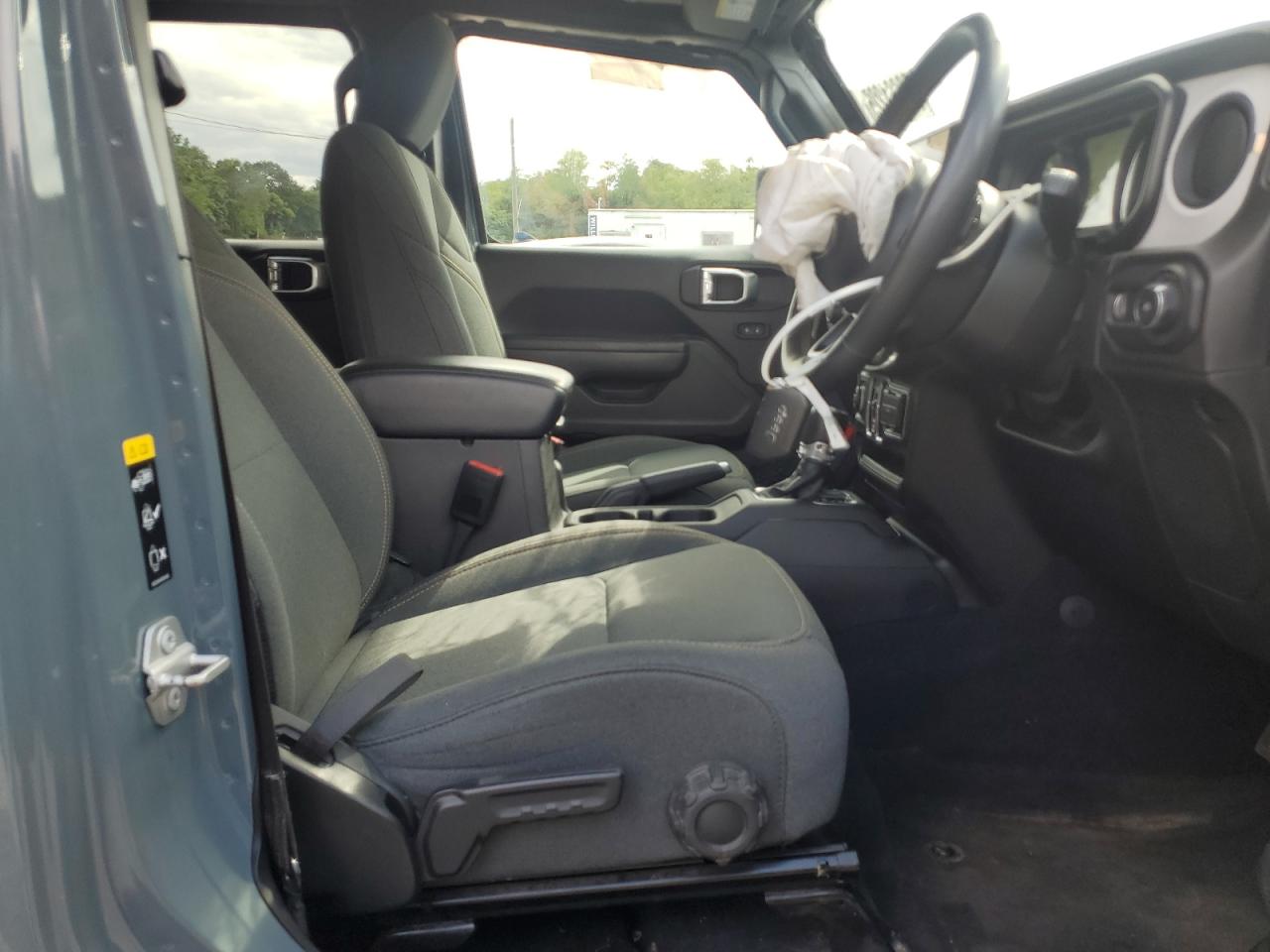 FairThe 2024 JEEP WRANGLER SPORT, colored gray, shows side and front-end damage, with a 'Run & Drive Verified' start code. This rugged SUV exhibits damage to the body panels. Inside, the interior condition is rated as Good with moderate visible damage or damage to exterior. The airbags have been deployed. The wheels appear to be fine.