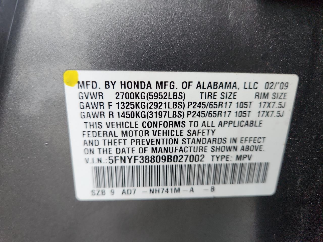 FairThis 2009 Honda Pilot Touring has visible damage. The primary damage is to the side, with secondary damage to the front end. The vehicle's color is charcoal, and it starts with a 'Run & Drive Verified' code. The car's body panels show signs of impact. The wheels appear to be in good condition. The lights and glass are in good shape. Inside, the interior is well-maintained with minimal wear, and it is equipped with airbags. The car is drivable but requires repairs to the body damage.