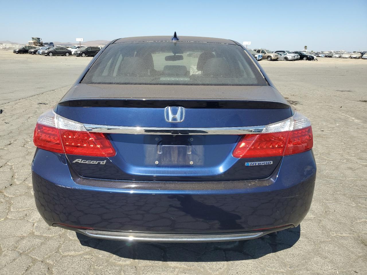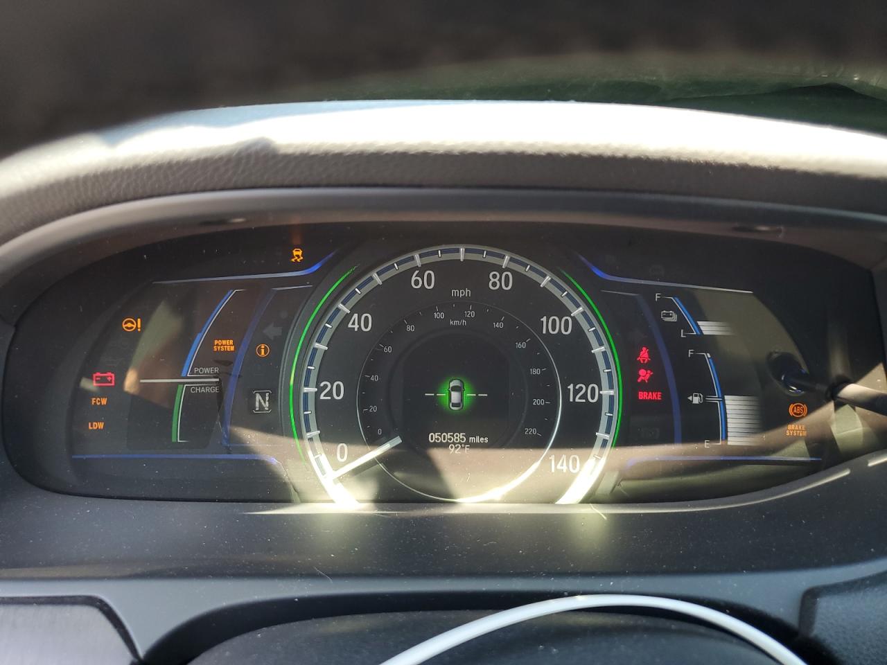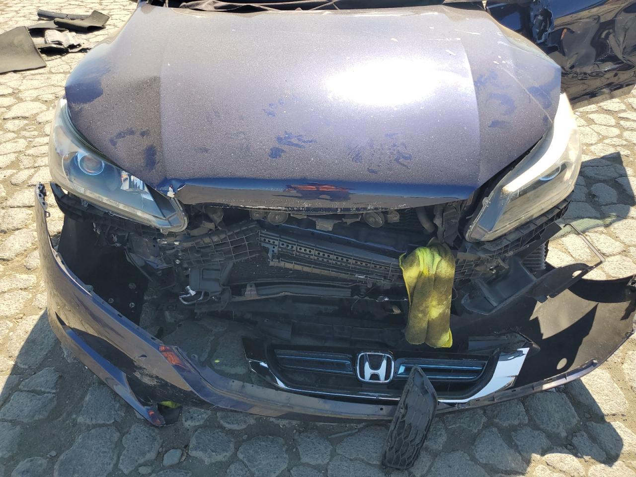 FairThis is a damaged 2015 Honda Accord Hybrid. The primary damage is to the front end, with secondary damage to the side. The car is blue. The front end has significant damage, including the bumper, hood, and possibly headlights. The side of the car shows dents and other damage. The wheels appear to be intact. Interior has deployed airbags. The overall state of the vehicle is fair, with moderate visible damage. The vehicle likely requires significant repairs.