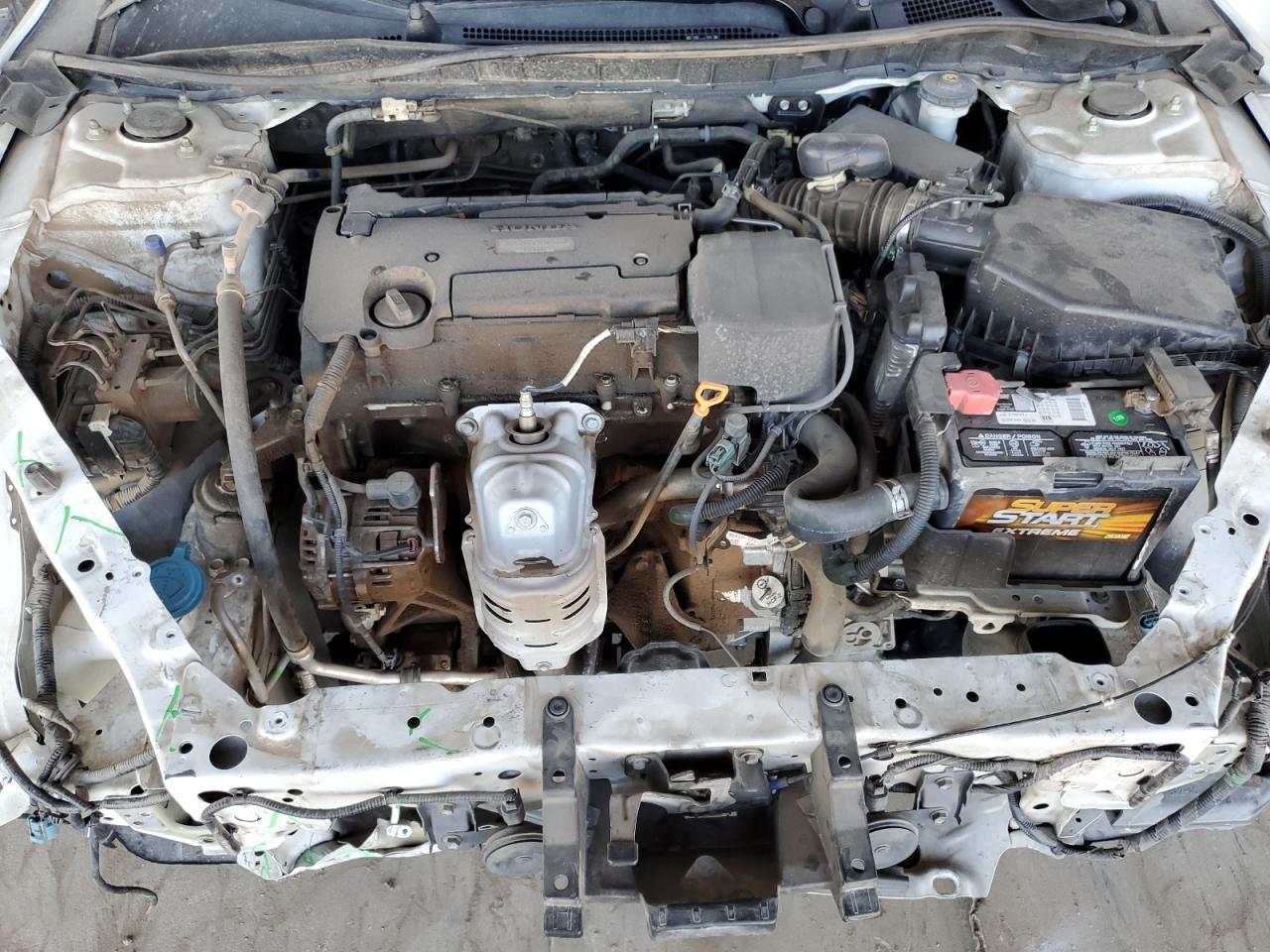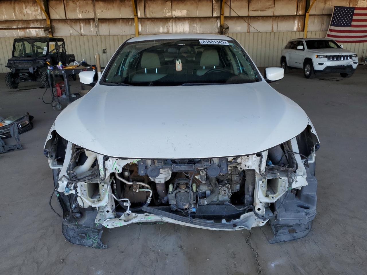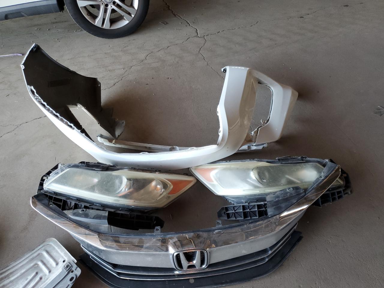 Front-end damage to body panels, missing front bumper, headlights are missing, and possible frame damage. No visible damage to the wheels, lights, or glasses. Interior appears to be well-maintained.