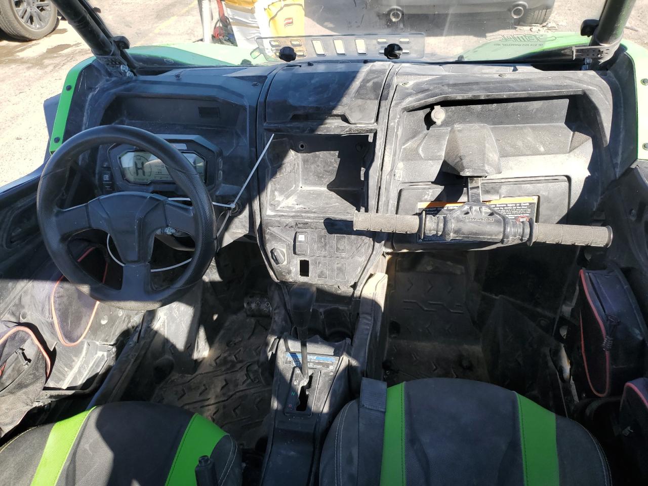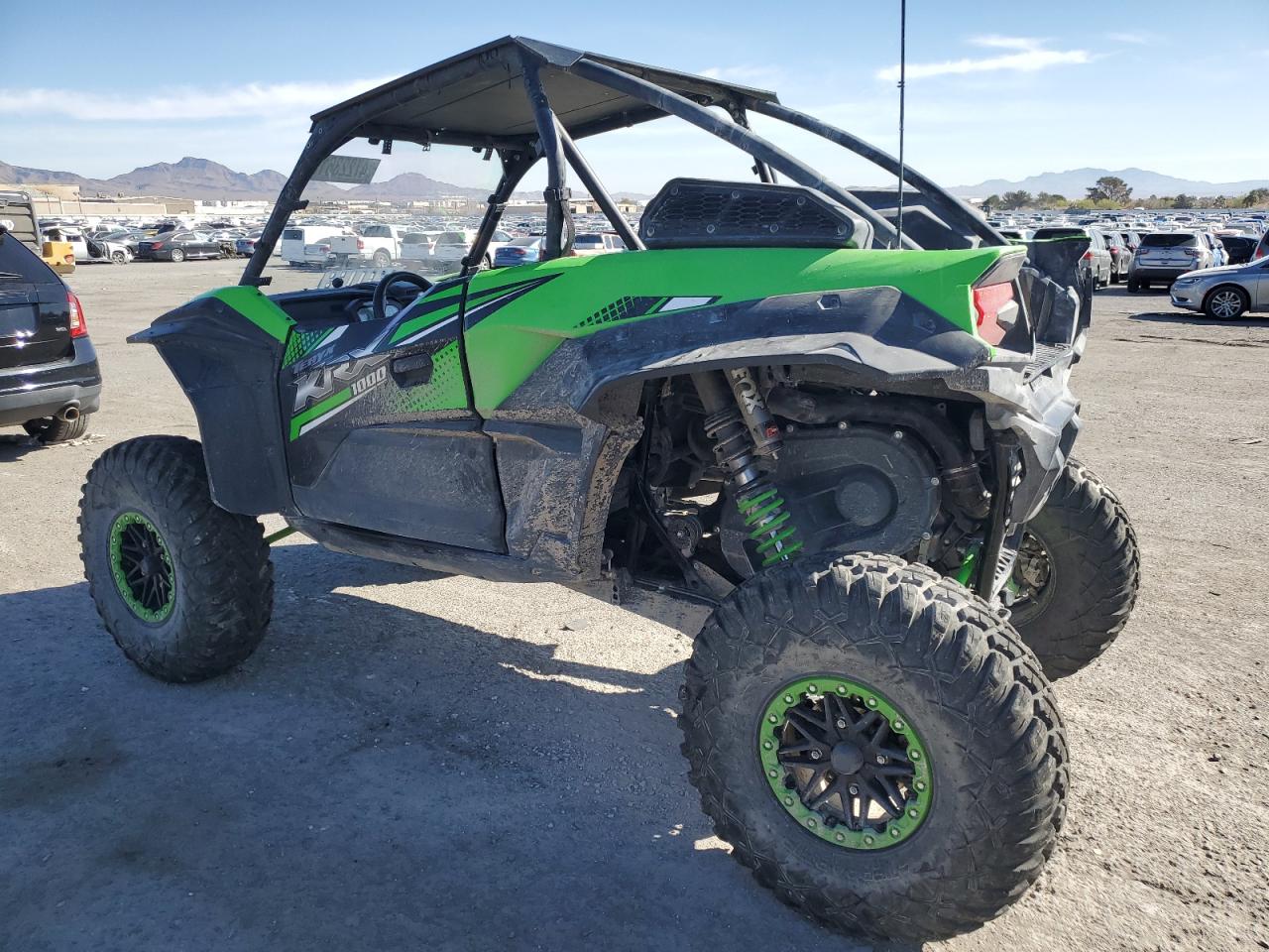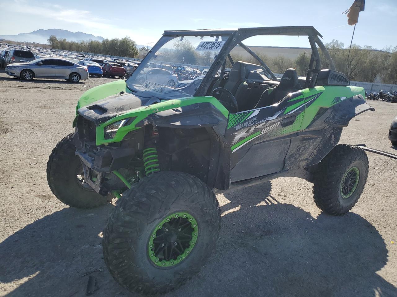 FairThis is a KAWASAKI KRF 1000 A 2020, green in color, with DEFAULT start code. The vehicle has sustained damage primarily to the front end. The damage is significant and visible, with no evidence of secondary damage. The wheels appear to be intact. The lights and glasses have visible damage. The car itself is a side-by-side, designed for off-road use.