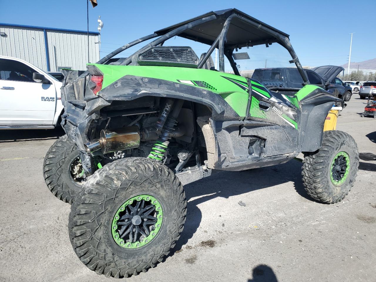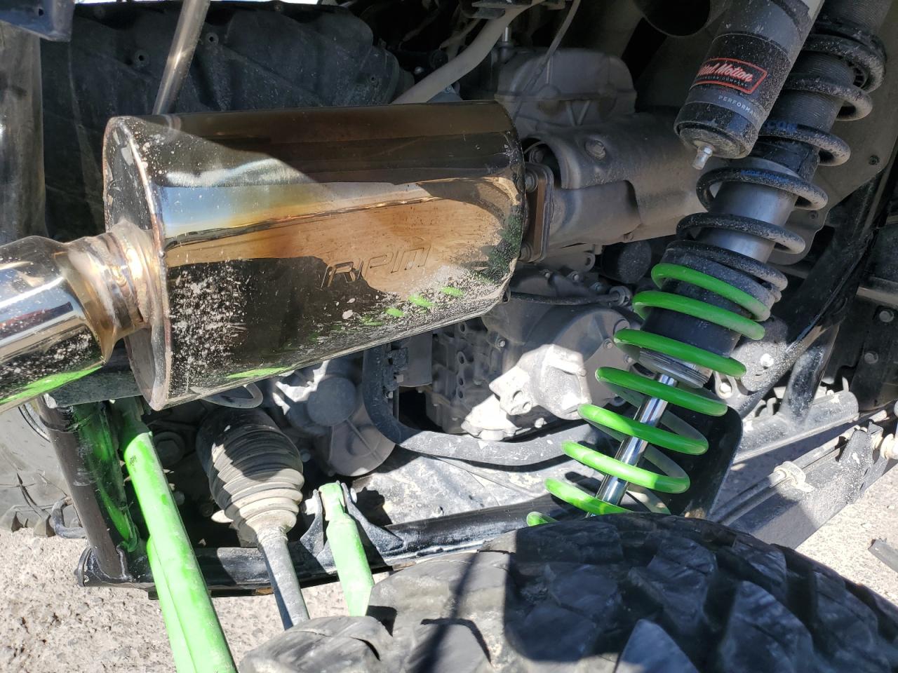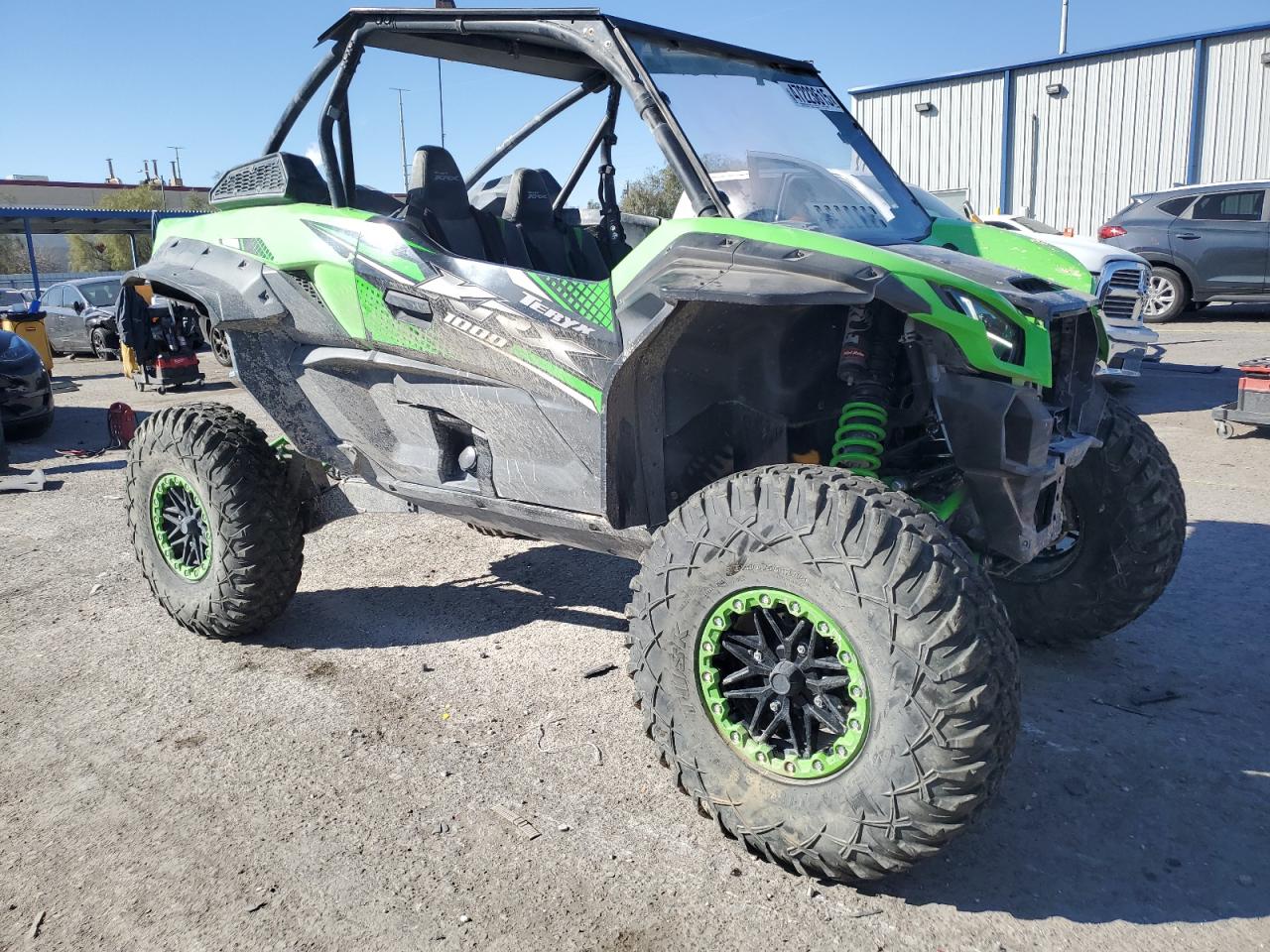 FairThis is a KAWASAKI KRF 1000 A 2020, green in color, with DEFAULT start code. The vehicle has sustained damage primarily to the front end. The damage is significant and visible, with no evidence of secondary damage. The wheels appear to be intact. The lights and glasses have visible damage. The car itself is a side-by-side, designed for off-road use.