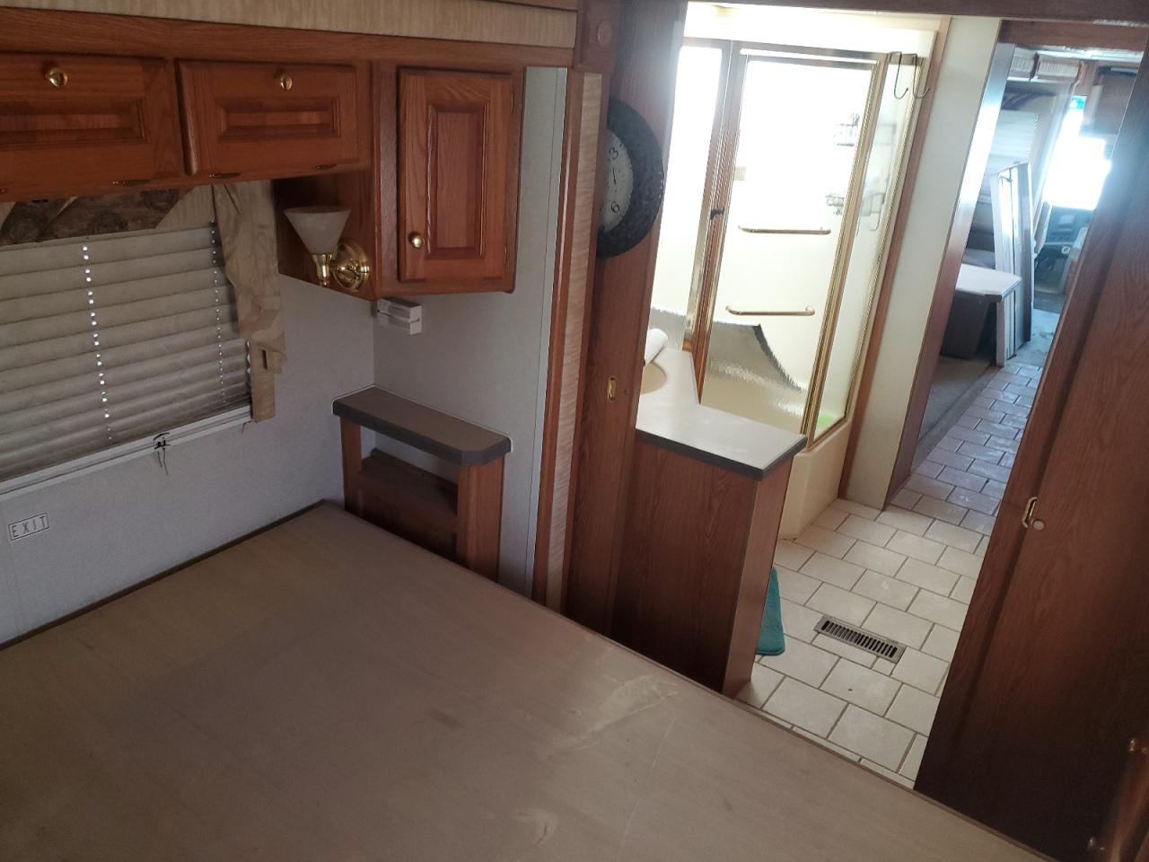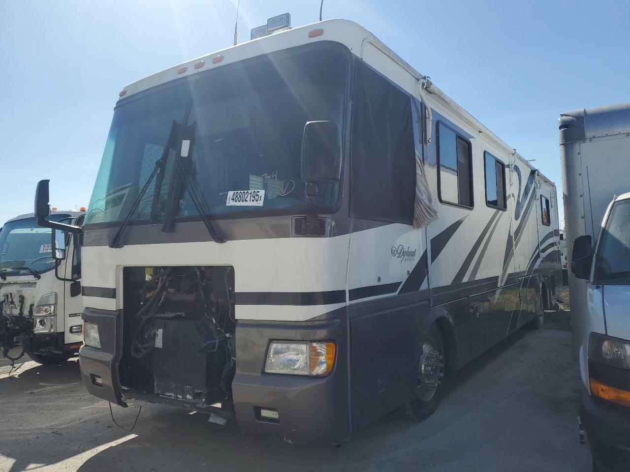 FairThe 2002 Monaco Diplomat RV presents with significant visible damage. The exterior exhibits water/flood damage and minor dents/scratches. The front engine compartment is open and appears to have mechanical issues. The two-tone paint is visible, but the overall aesthetic is compromised. Interior shows signs of wear and tear with some visible damages. The vehicle's condition suggests it requires considerable repair.