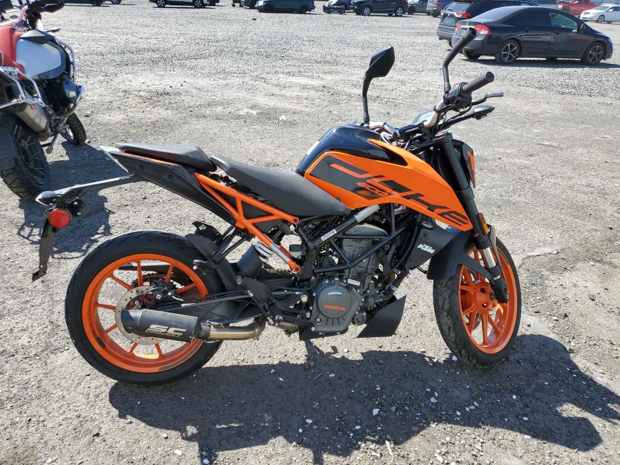 The KTM 200 DUKE 2022 shows signs of vandalism damage to the body. The wheels, lights, and glasses appear to be intact based on the provided images. Interior condition seems to be in good condition. No visible damage to airbag.