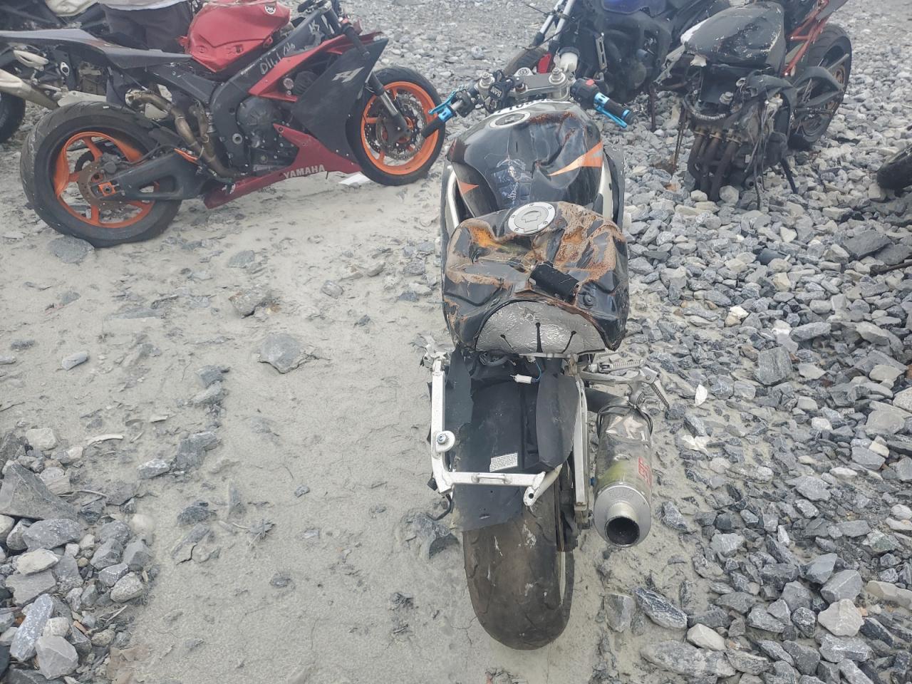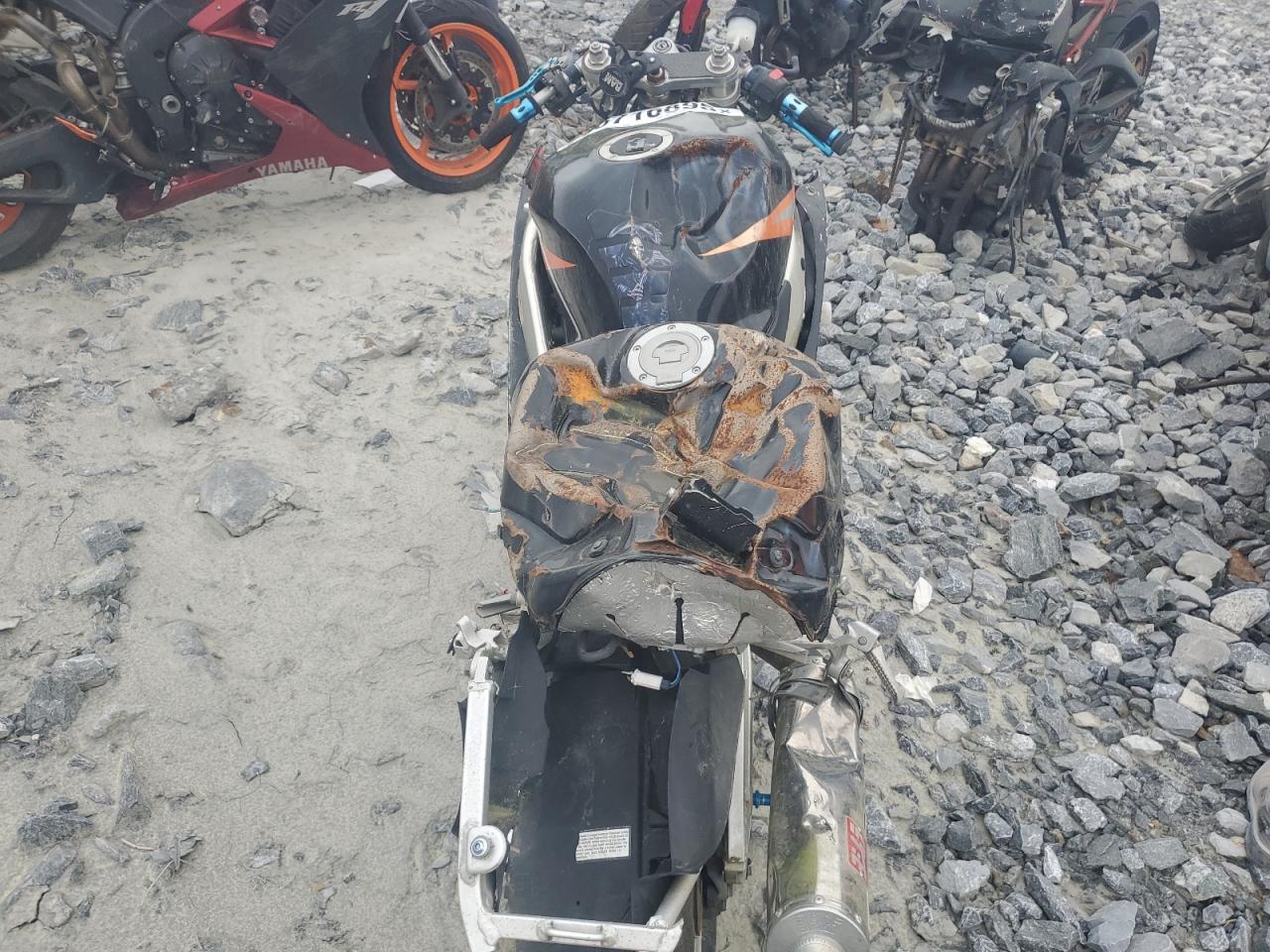 The motorcycles exhibit severe damage, including body panel damage and stripped components. The wheels and lights appear damaged. There is no visible interior damage or airbags.