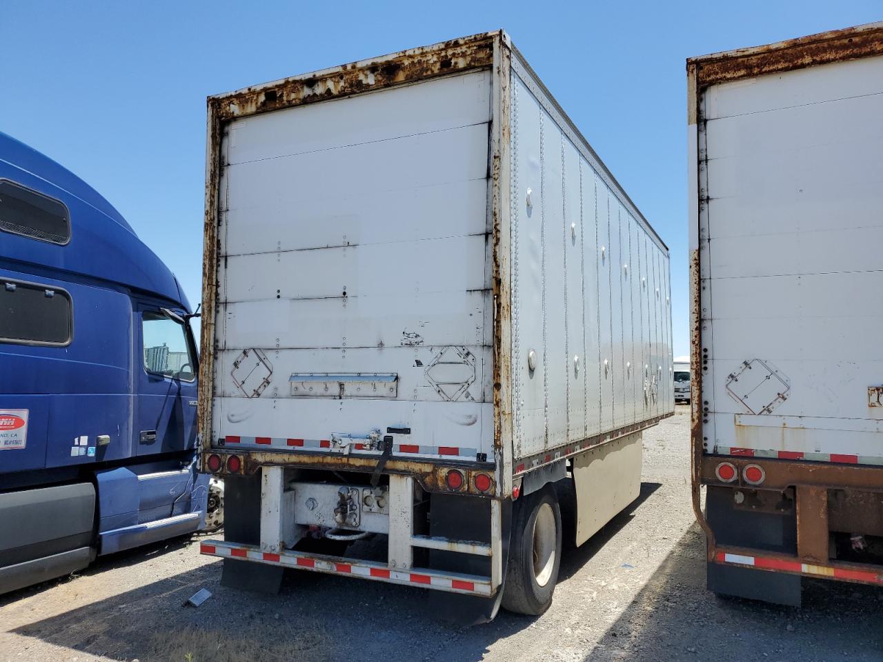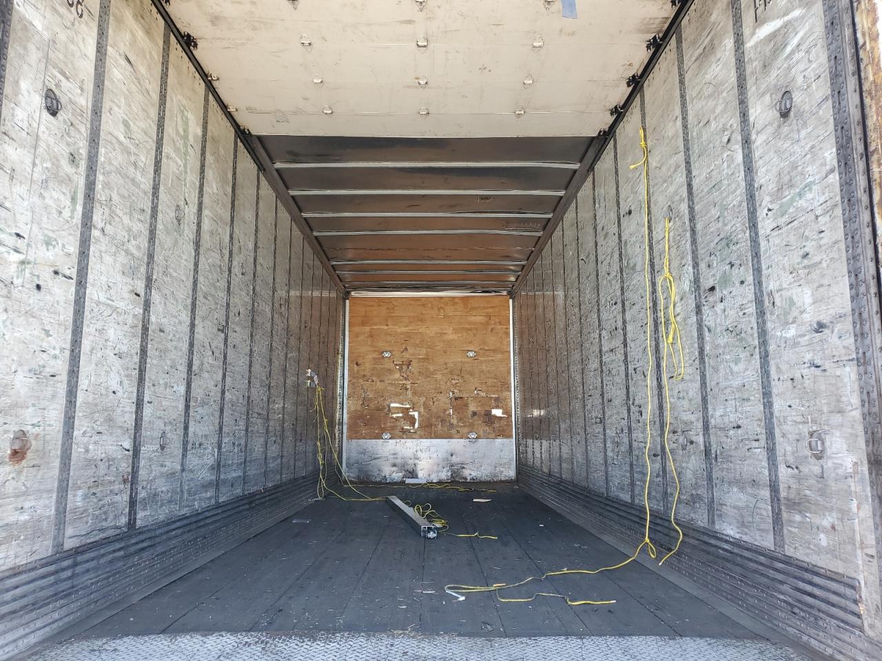 The trailer exhibits moderate damage, including dents and scratches on the body panels. The overall condition suggests the need for some repairs to the exterior.