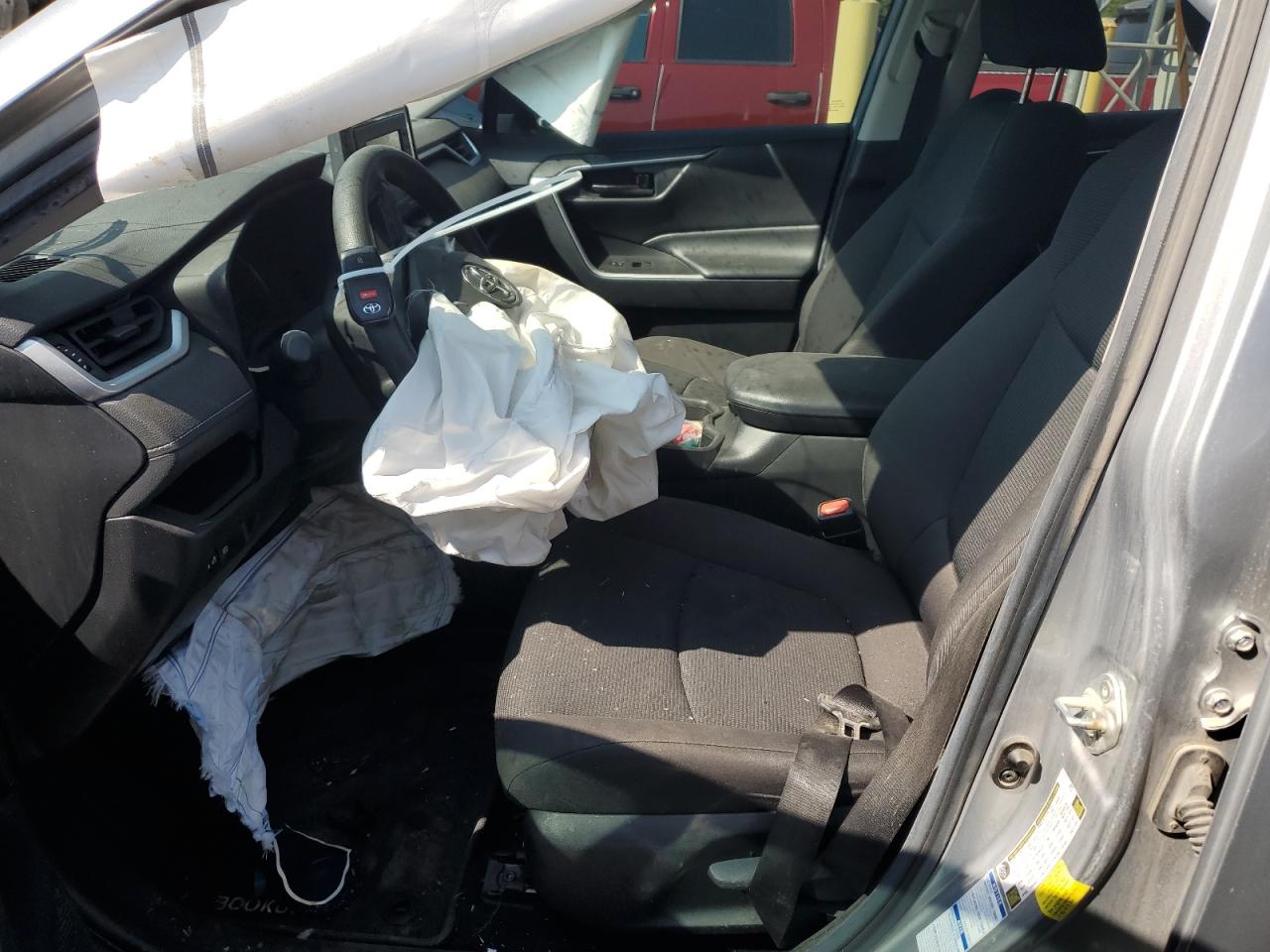 PoorThe 2021 Toyota RAV4 LE in silver exhibits significant front-end damage, including crumpled body panels, suggesting a substantial impact. The vehicle also presents minor dent/scratch on the body. Interior damage is evident, and airbags have deployed. The car's overall condition is poor. Keywords: Damaged Toyota RAV4, salvage RAV4, crashed Toyota, front-end damage, airbag deployed, collision.