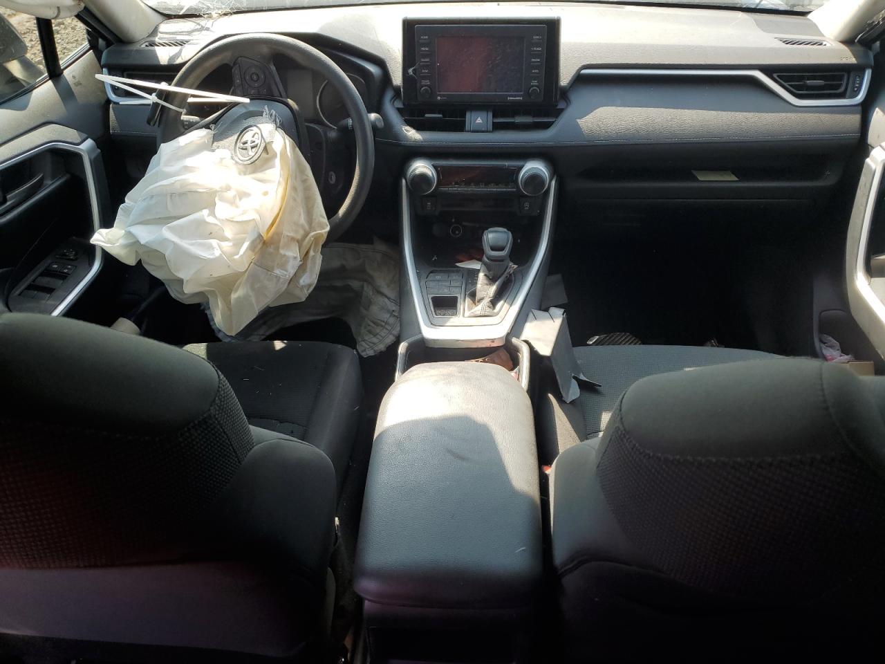 The front end of the RAV4 is heavily damaged, with significant structural deformation. Minor dents and scratches are visible on the body panels. Interior damage is also present, and the airbags have deployed.