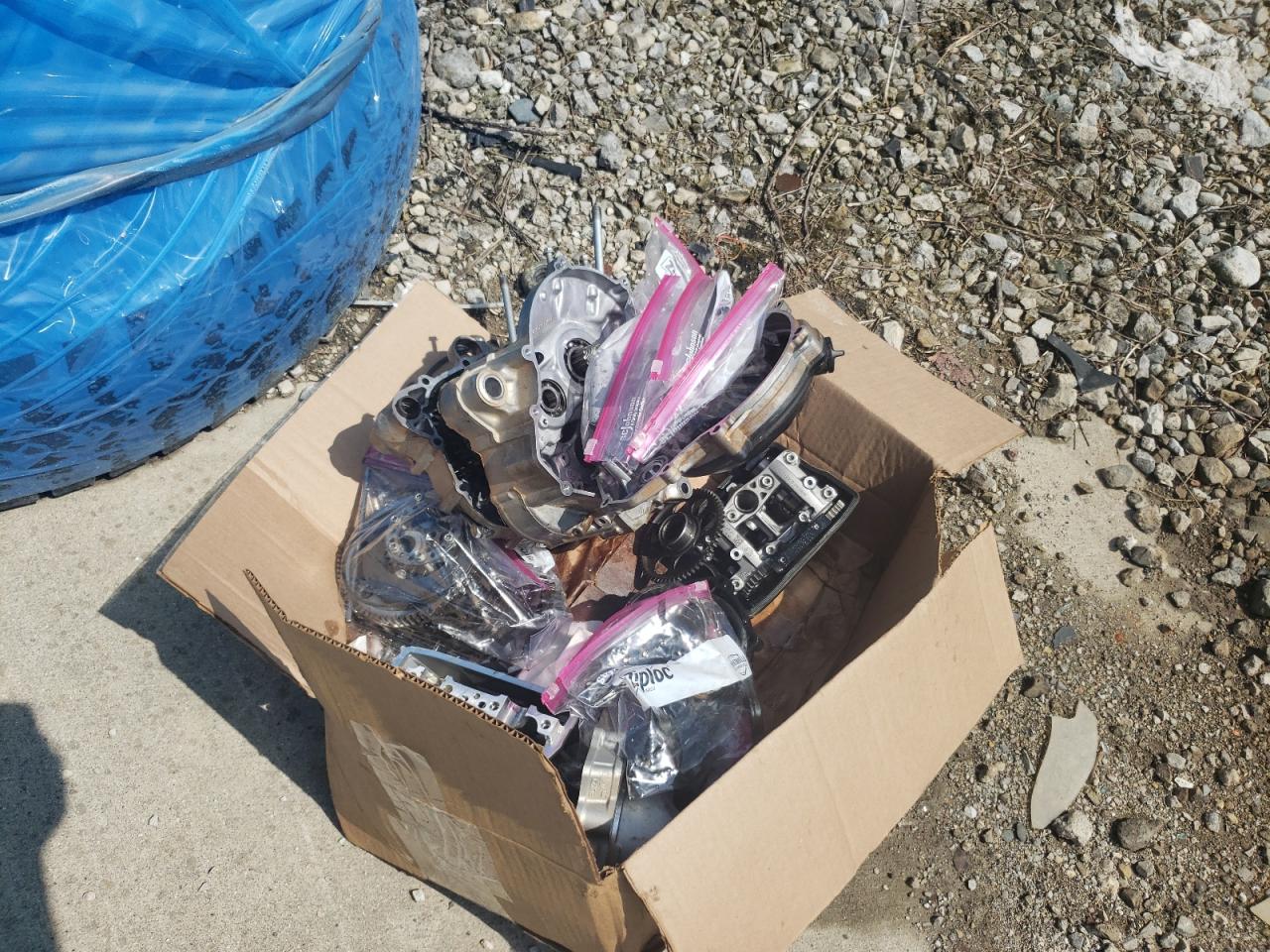 The motorcycle exhibits comprehensive damage, affecting multiple components. The body panels show considerable damage, and many parts appear to be missing or stripped. Wheels, lights, and other components are likely affected. The motorcycle is in a state that requires considerable repair.