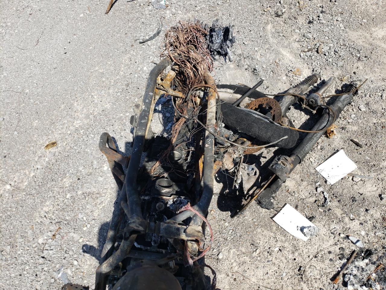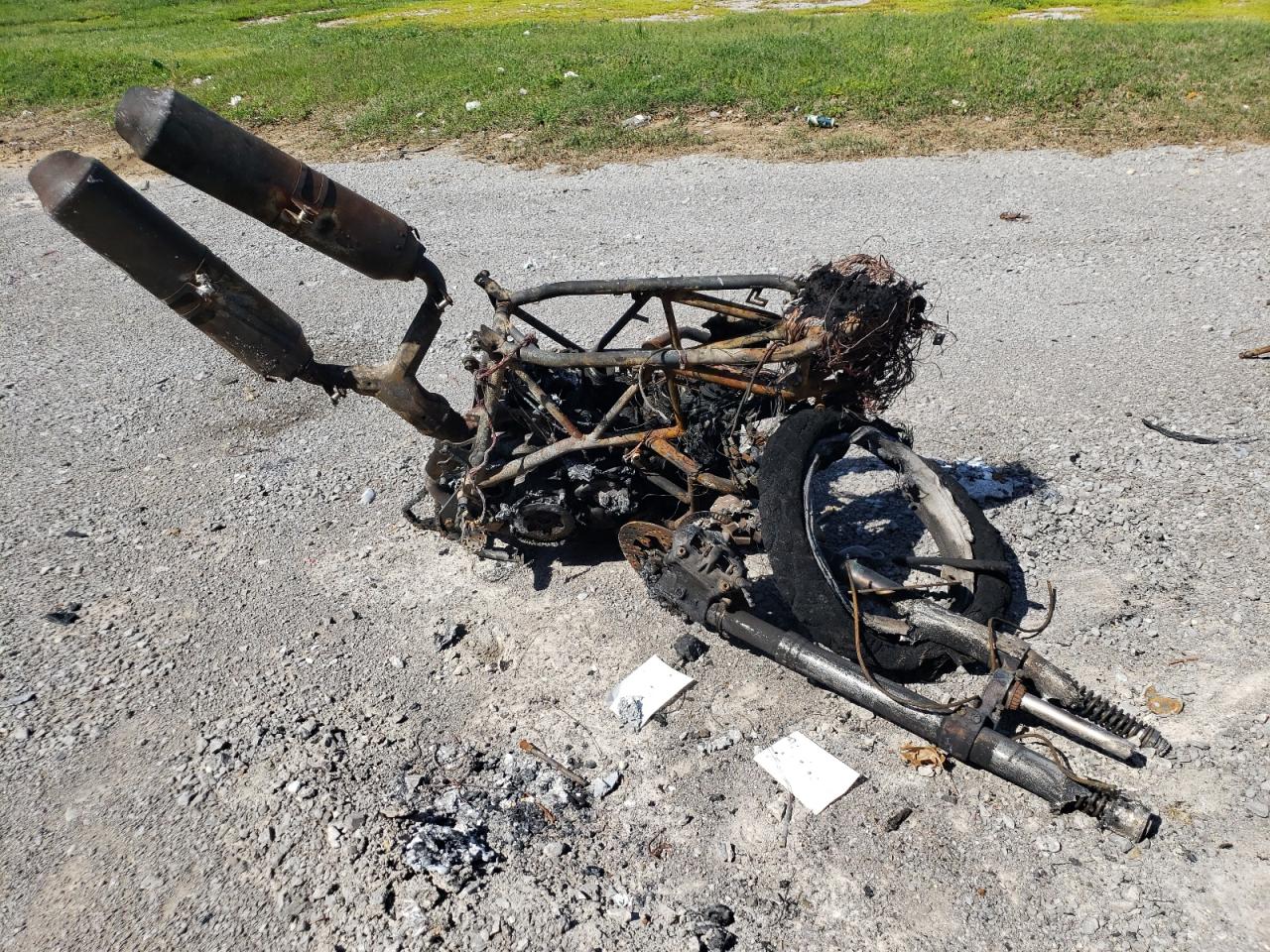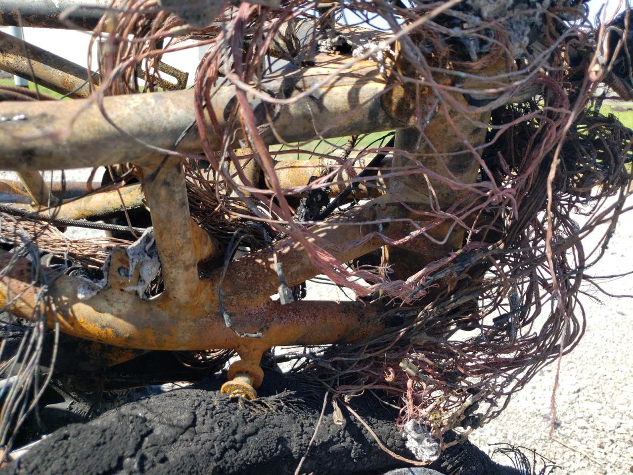 Severe burn damage throughout the vehicle. The body is completely destroyed, and mechanical components are heavily damaged. The wheels, lights, and glass are not discernible due to the fire damage.