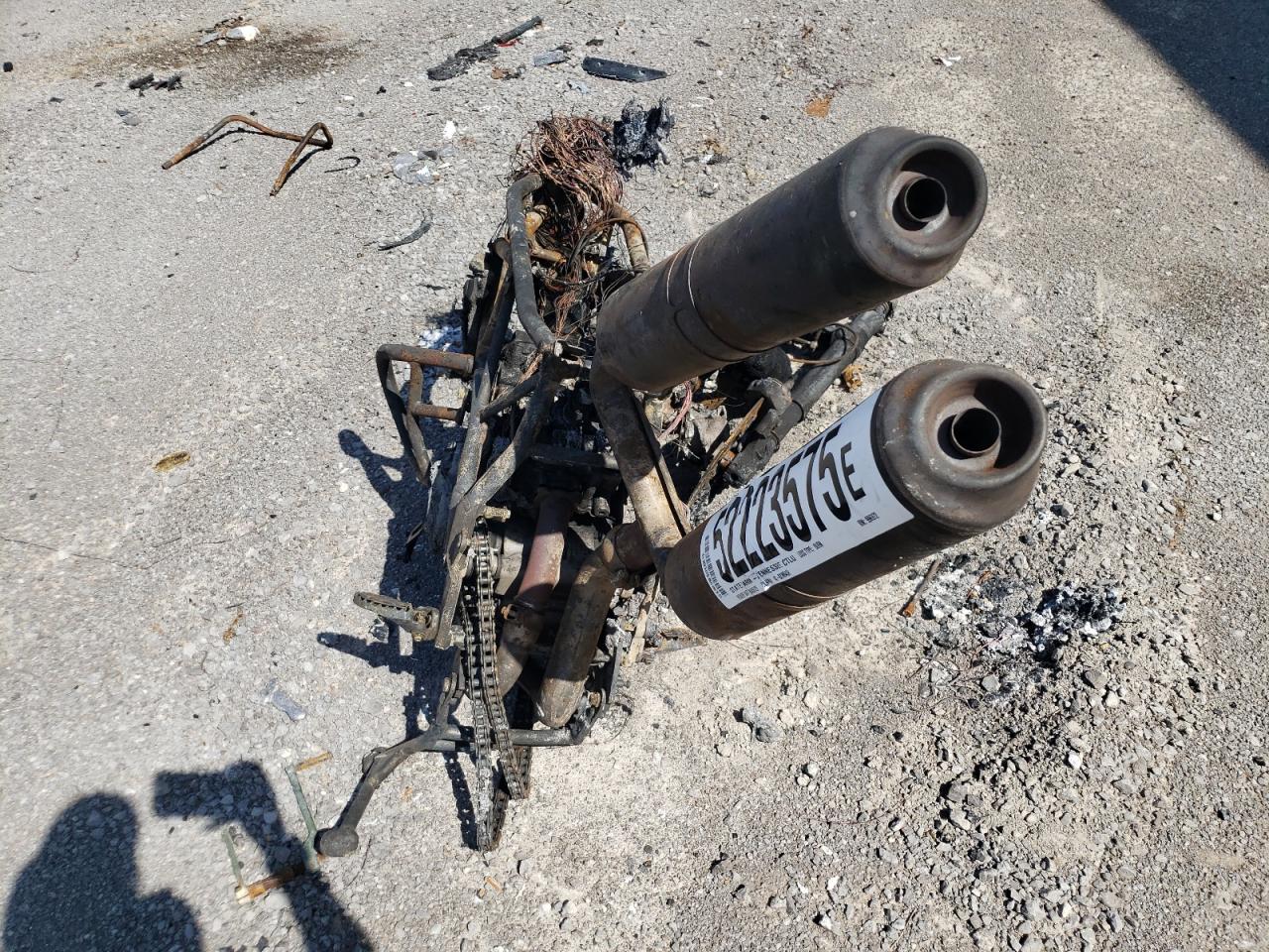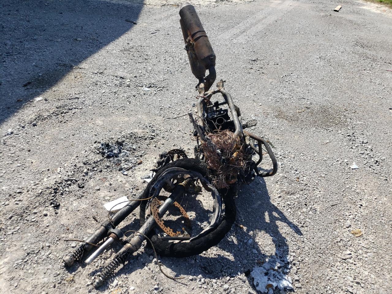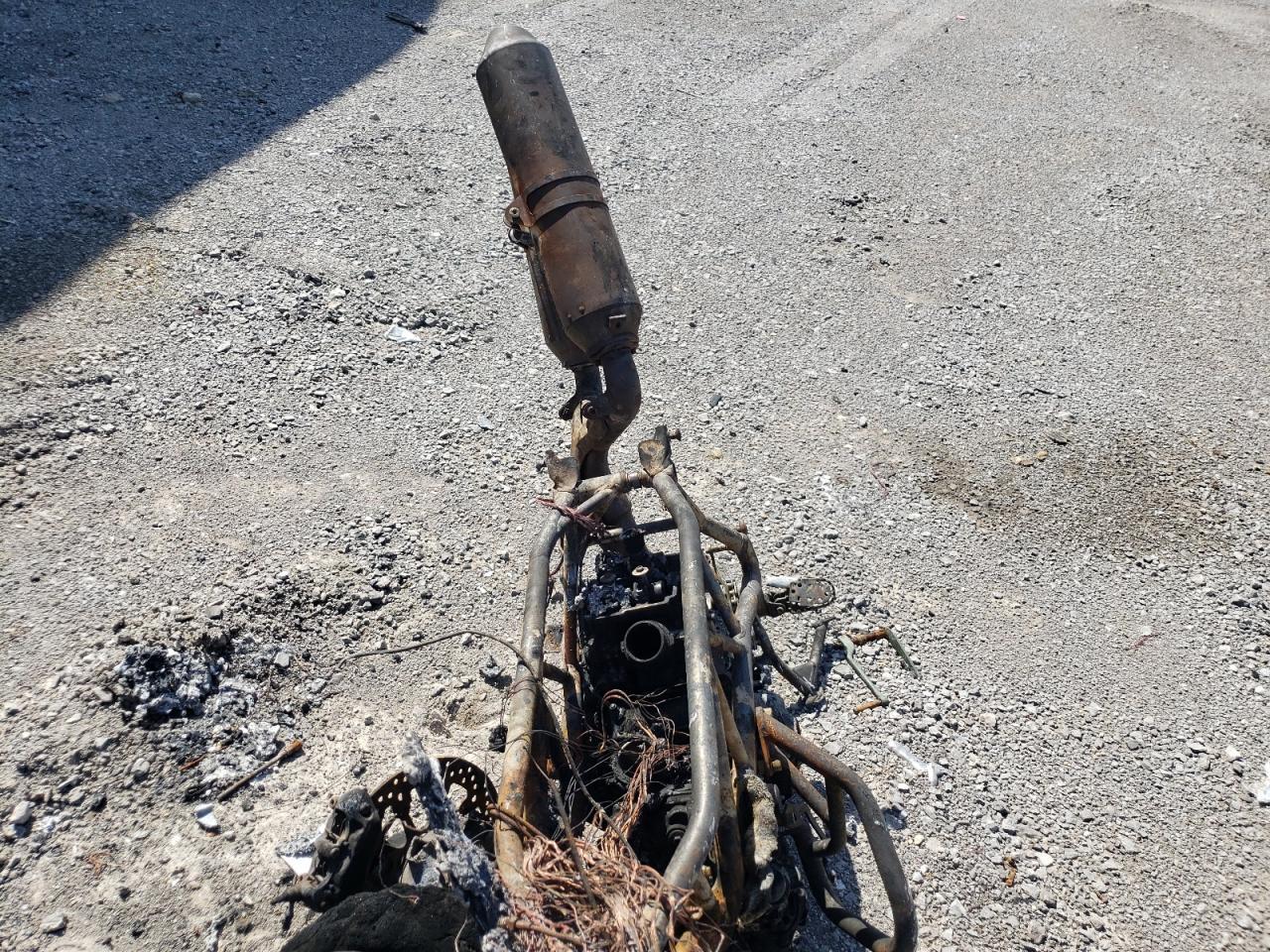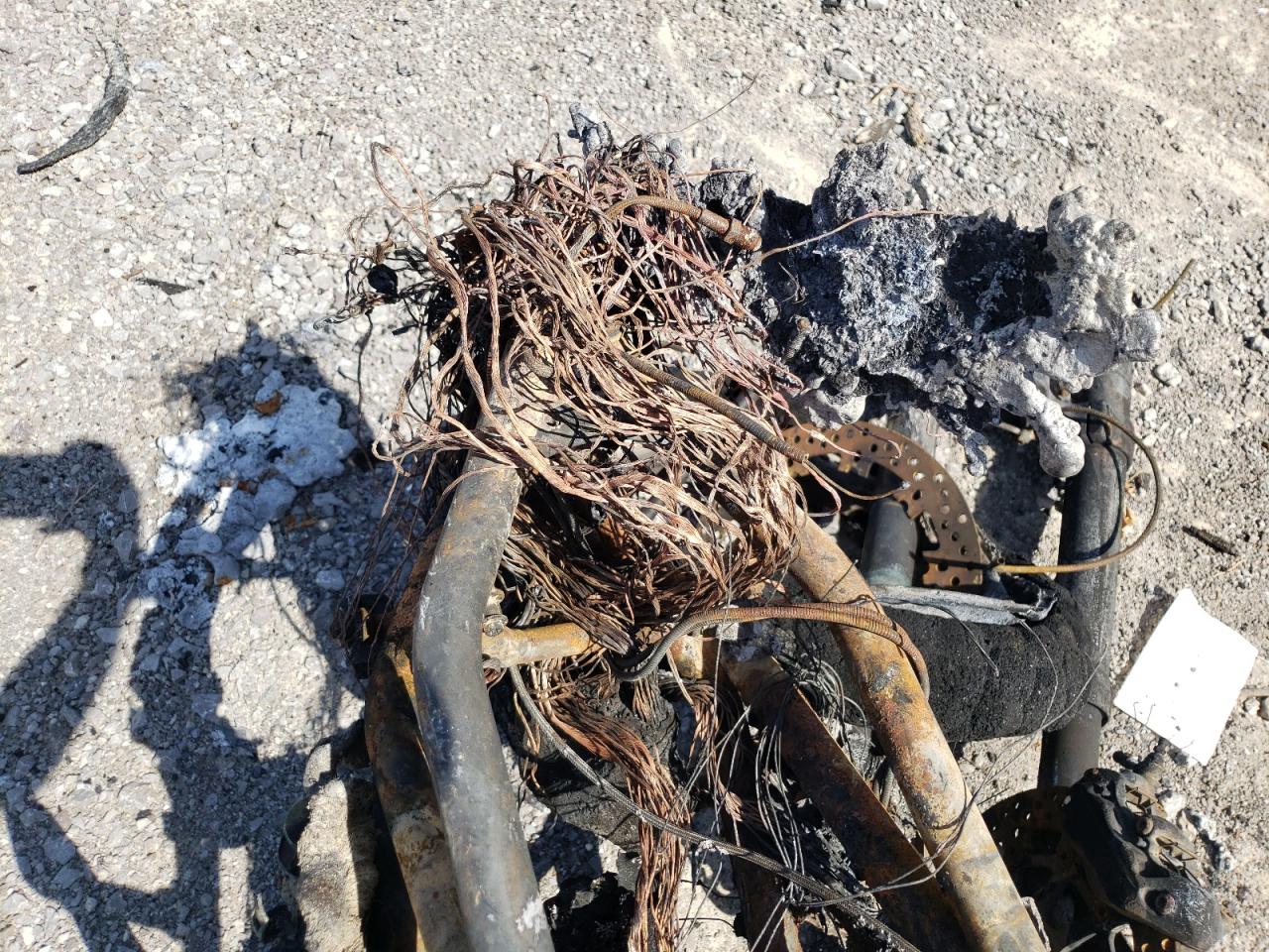 Severe burn damage throughout the vehicle. The body is completely destroyed, and mechanical components are heavily damaged. The wheels, lights, and glass are not discernible due to the fire damage.