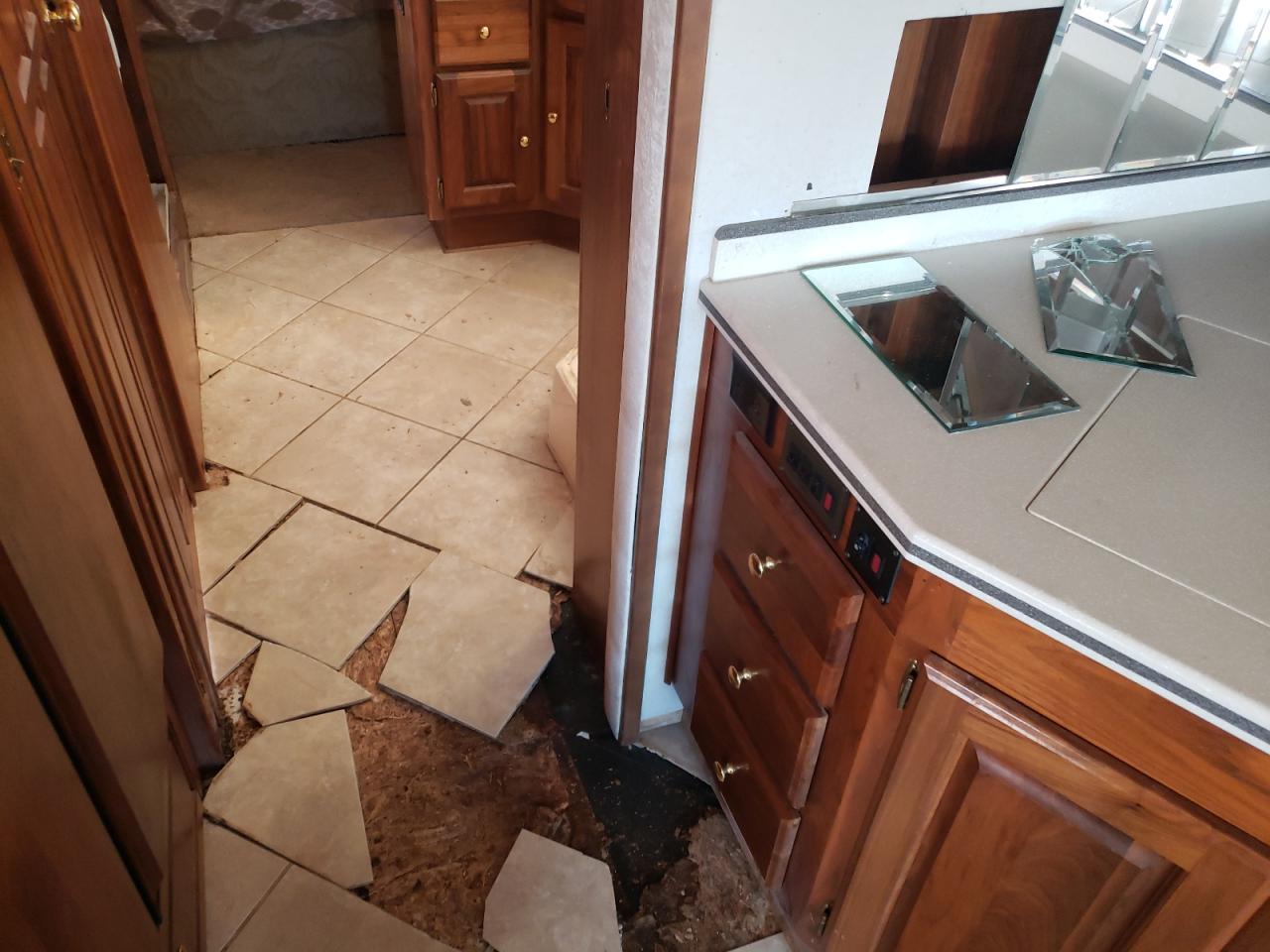 The RV has sustained significant damage consistent with vandalism. The interior appears to be severely damaged, including flooring damage and possibly damage to cabinetry. The exterior shows signs of wear and tear. The wheels, lights, and glass appear to be in decent condition, although this cannot be verified without additional images.