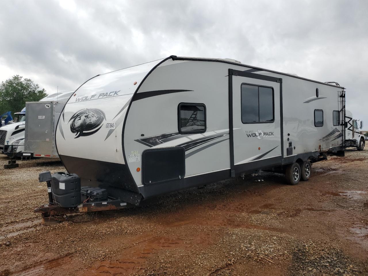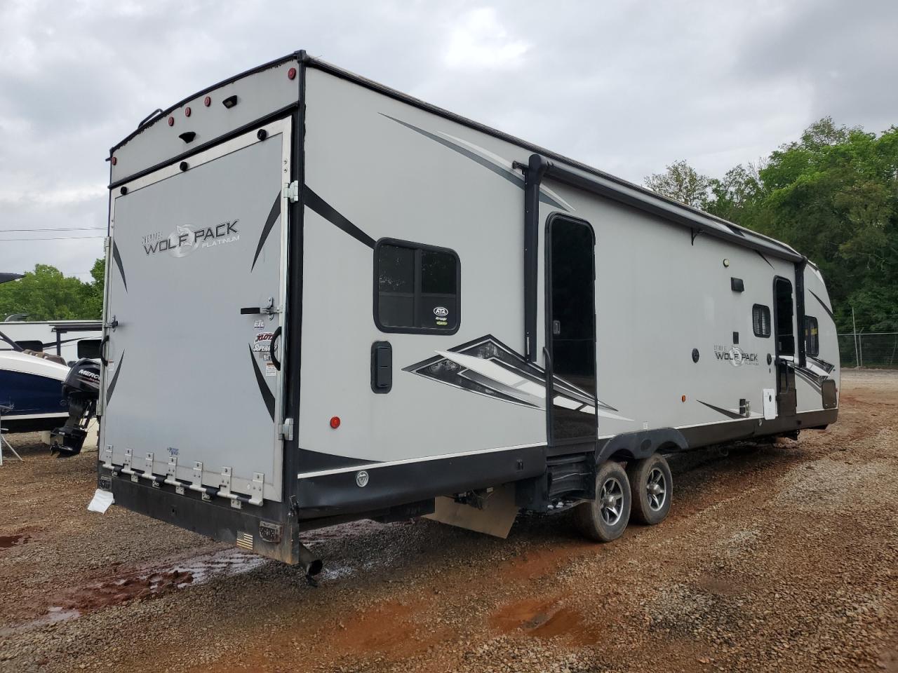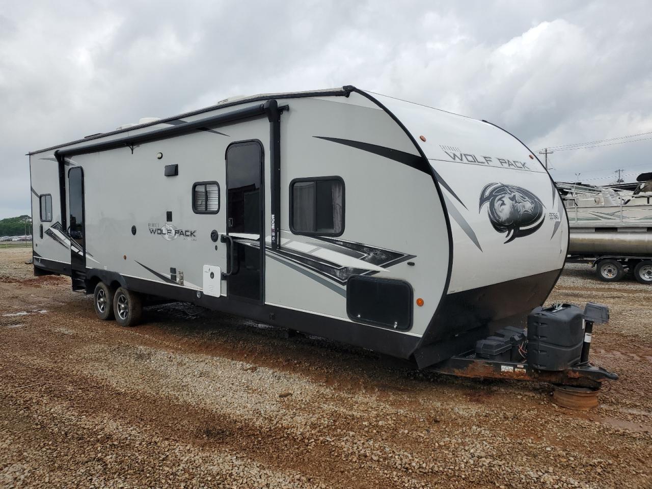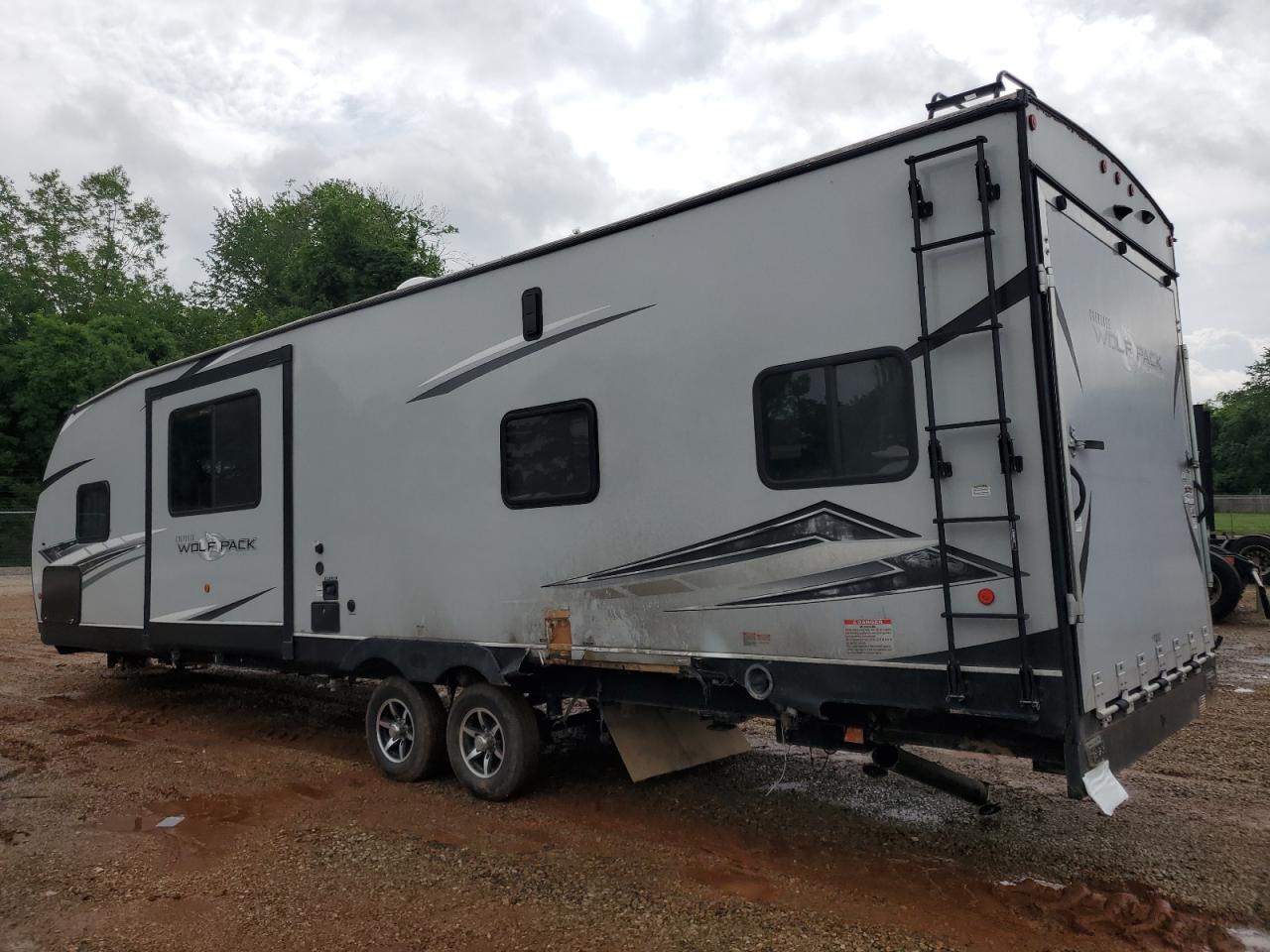 FairThis is a 2021 Wildwood Wolf Pack trailer, primarily damaged by burn and side impact. The exterior is white. The trailer shows signs of moderate visible damage, including damage to the body panels. The wheels appear to be fine. The interior shows minor visible damage. The airbag condition is not visible. The trailer is likely drivable.