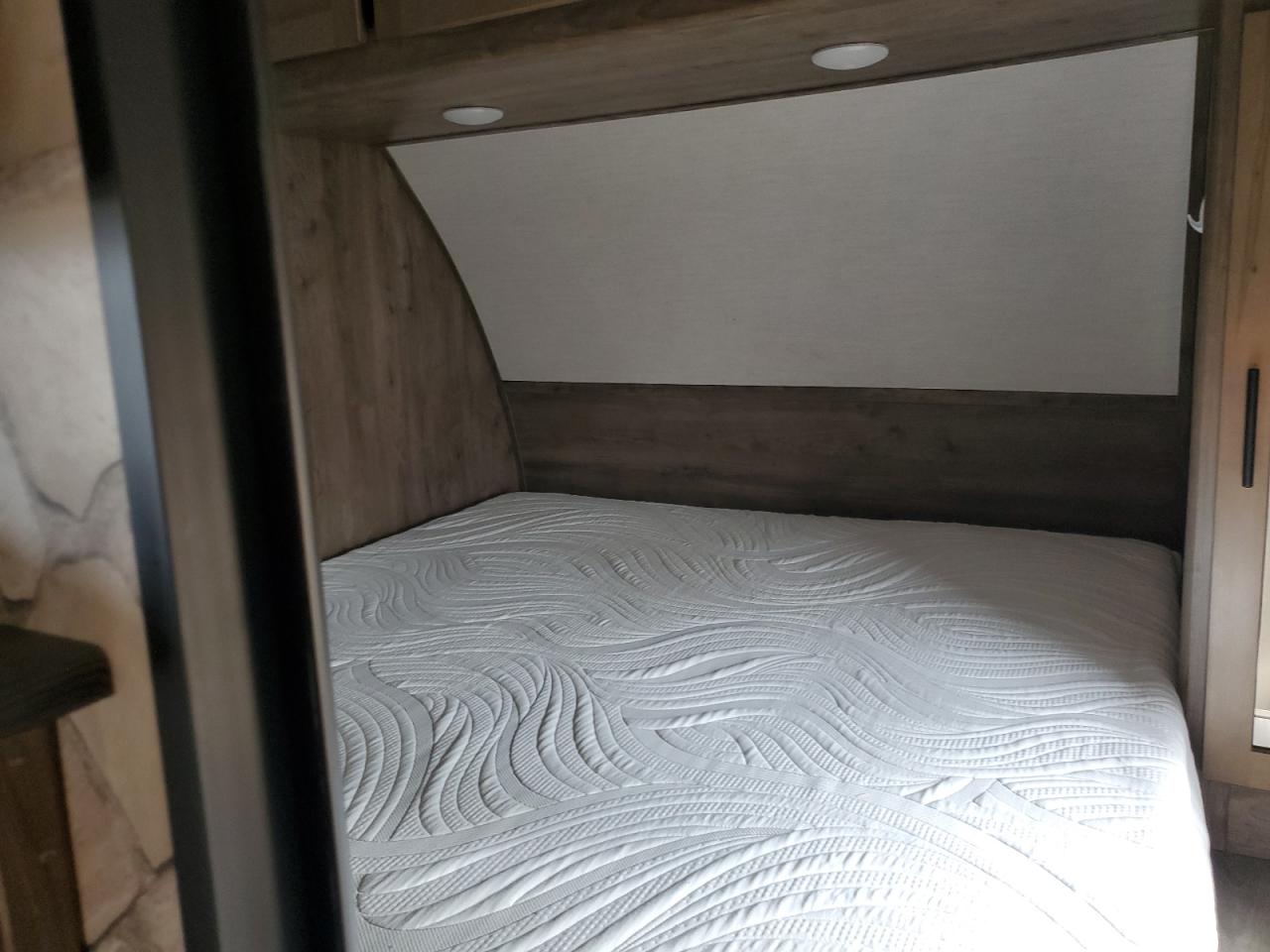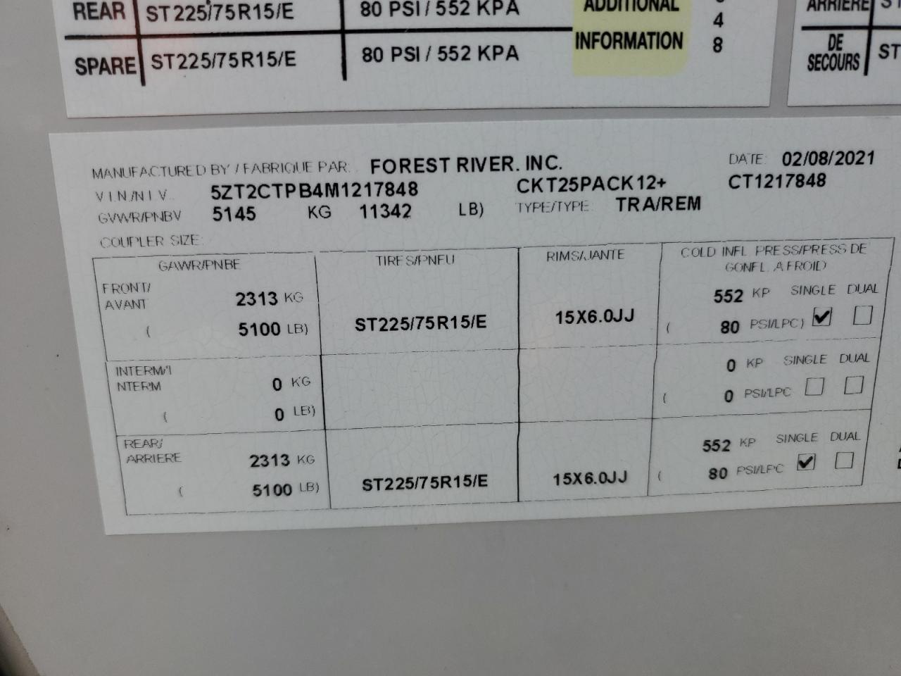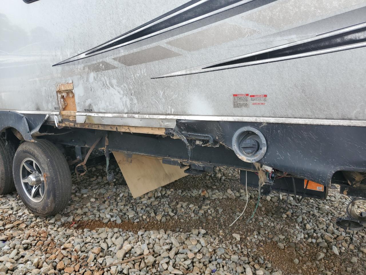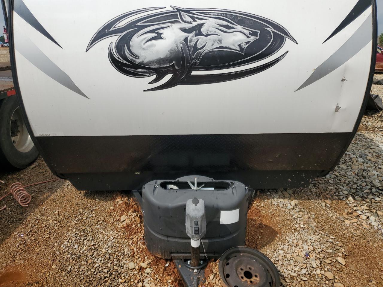 FairThis is a 2021 Wildwood Wolf Pack trailer, primarily damaged by burn and side impact. The exterior is white. The trailer shows signs of moderate visible damage, including damage to the body panels. The wheels appear to be fine. The interior shows minor visible damage. The airbag condition is not visible. The trailer is likely drivable.