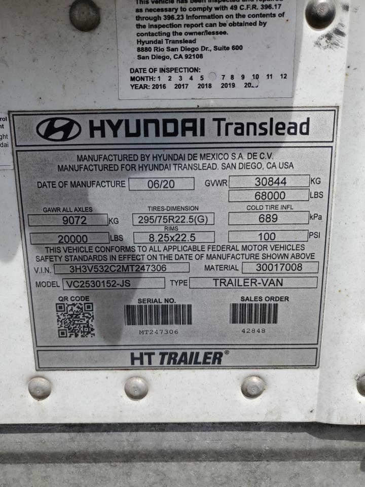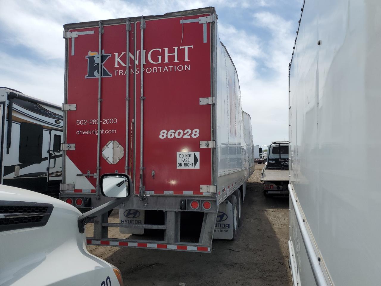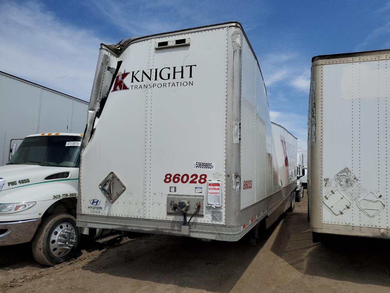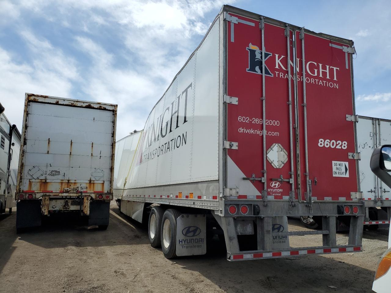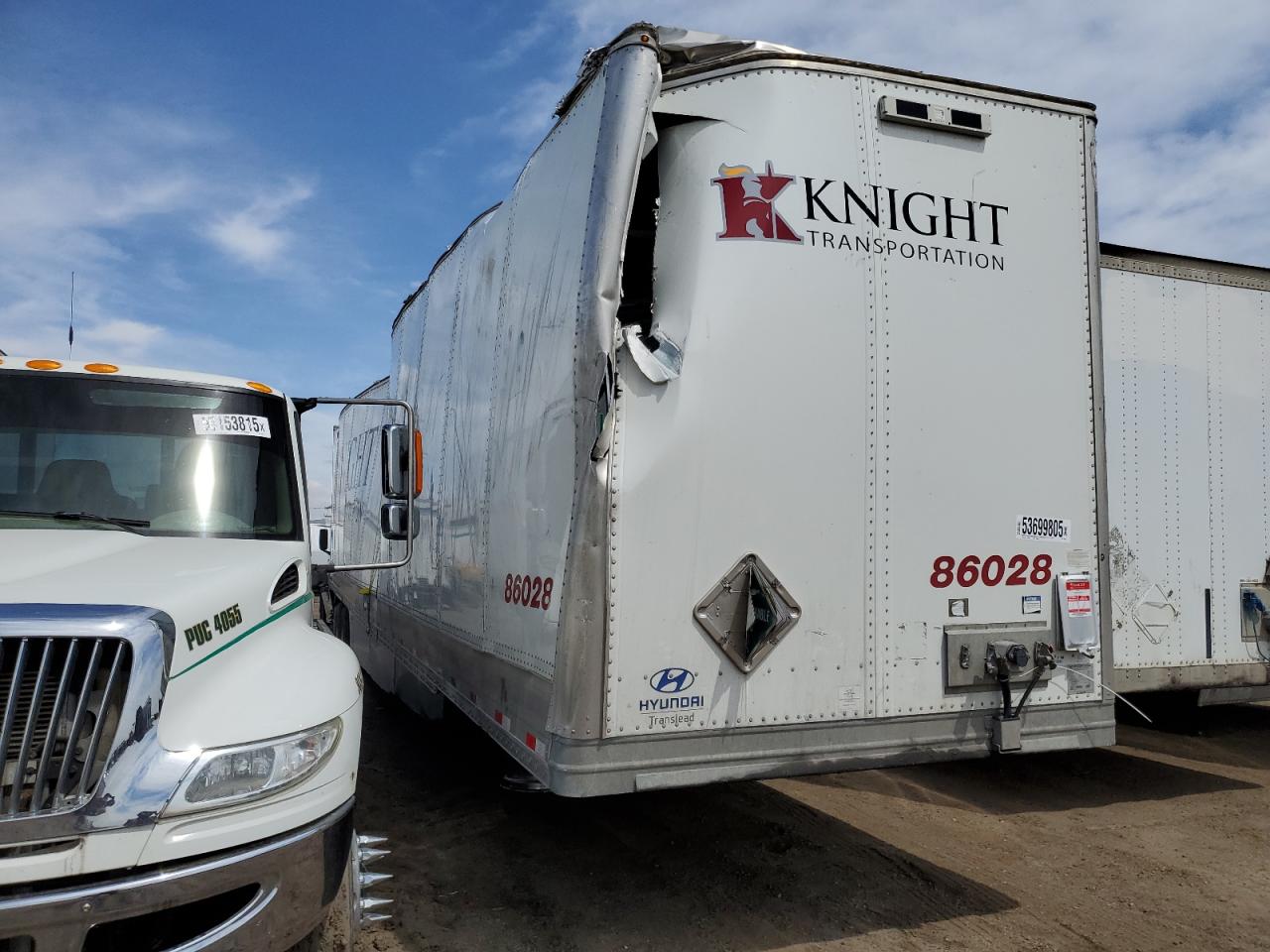 FairHYUNDAI UNKNOWN 2021. The vehicle is white. The trailer has significant damage. The body panels are heavily damaged, particularly at the top and rear, indicating a collision. The undercarriage shows signs of impact as well. The wheels appear to be in decent condition, but the overall state is affected by the extensive body damage. The trailer has the Knight Transportation logo.