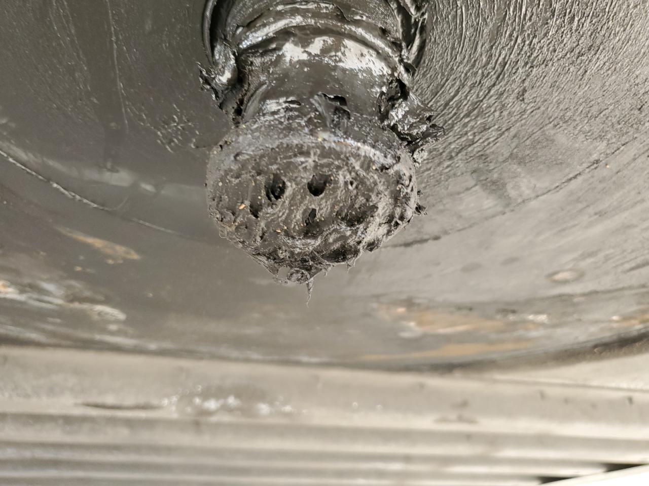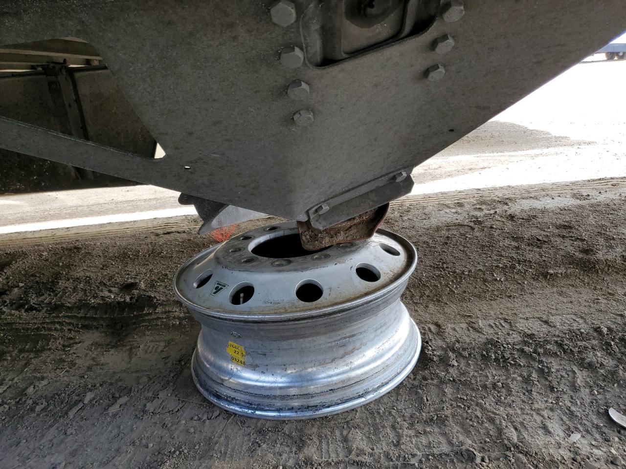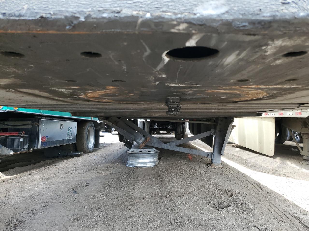The trailer's body has extensive damage, primarily on the sides and the rear, indicating a collision. The undercarriage shows signs of damage.
