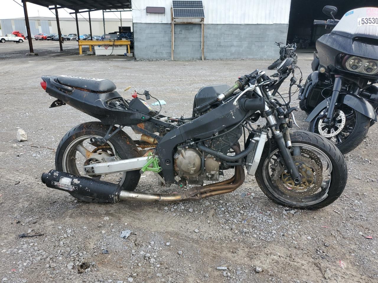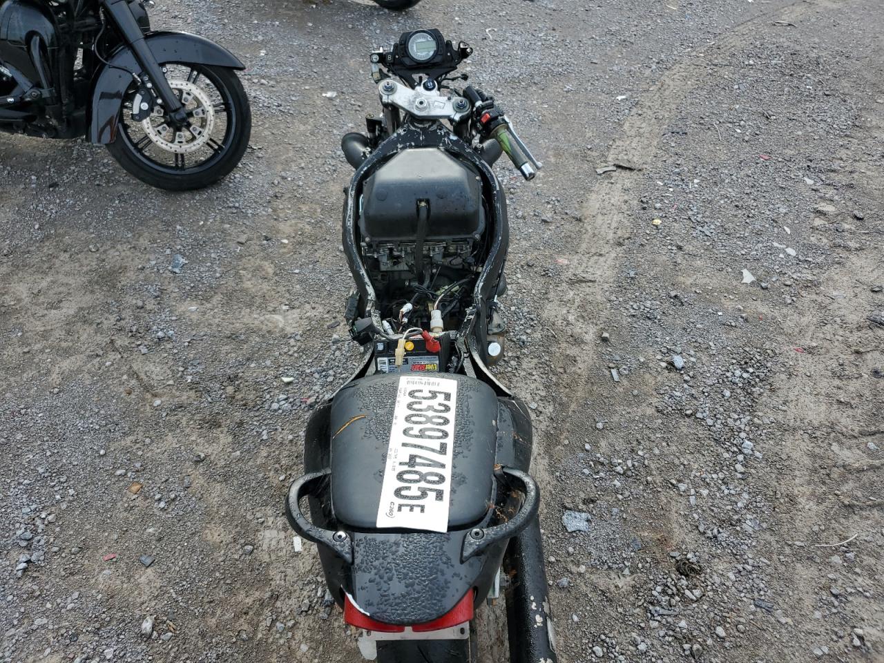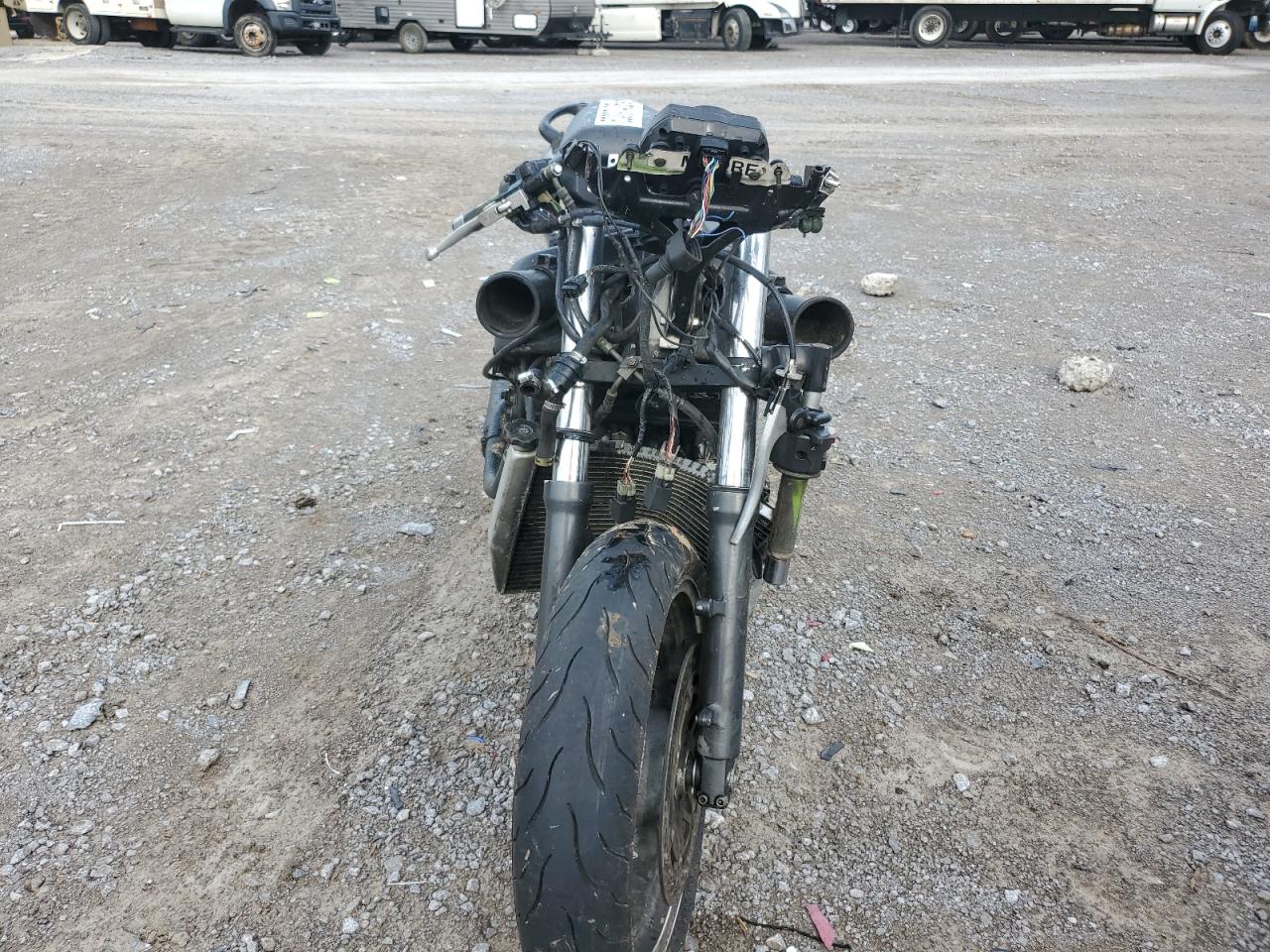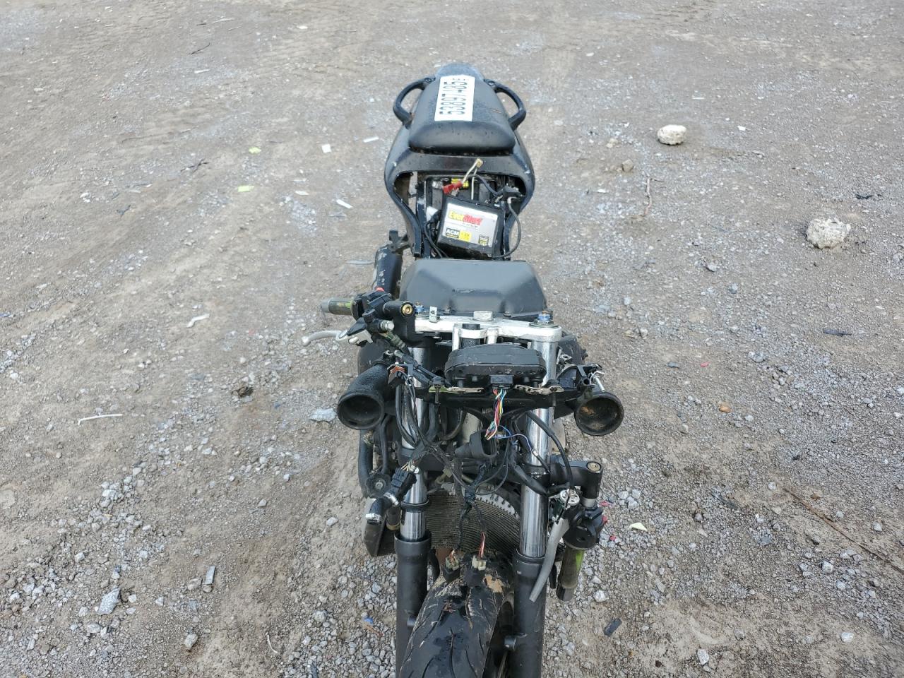 The motorcycle has extensive damage throughout its body, with signs of fire damage. Many parts are missing or damaged, including lights, fairings, and possibly the engine. The interior is also heavily damaged.