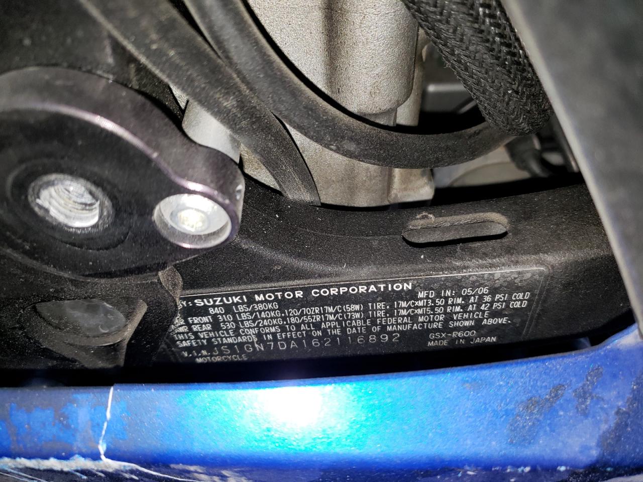 FairThe 2006 SUZUKI GSX-R600 K is a blue motorcycle with significant damage. The primary damage is to the front end, and secondary damage is to the side. The front end has been heavily damaged, and the body panels show considerable wear and tear. The wheels appear intact, but the lights and glasses are likely damaged. The interior condition is fair with potential damage. The airbags status is unknown. This motorcycle requires considerable repair and is not drivable.