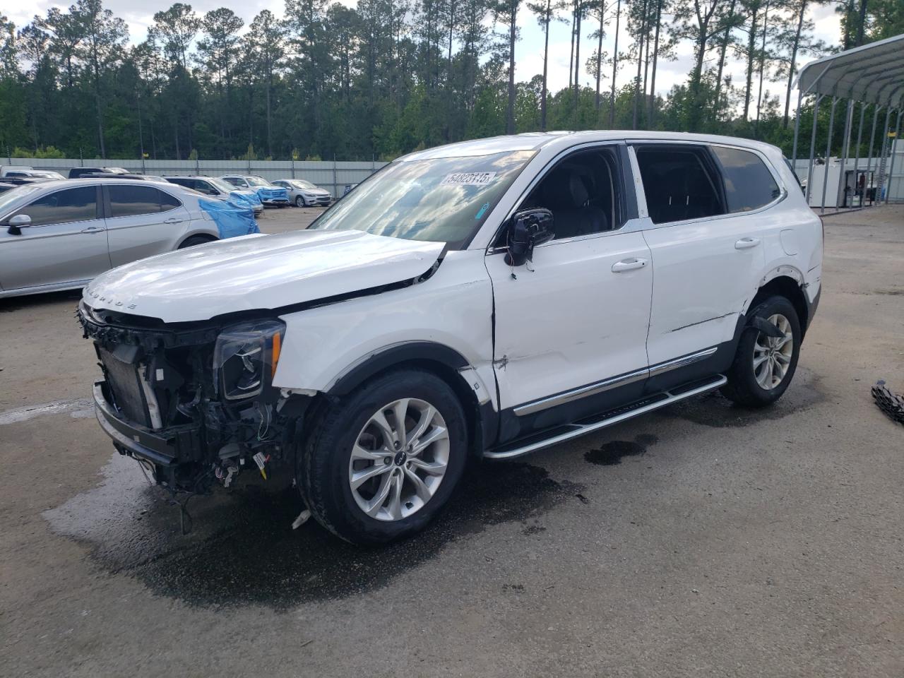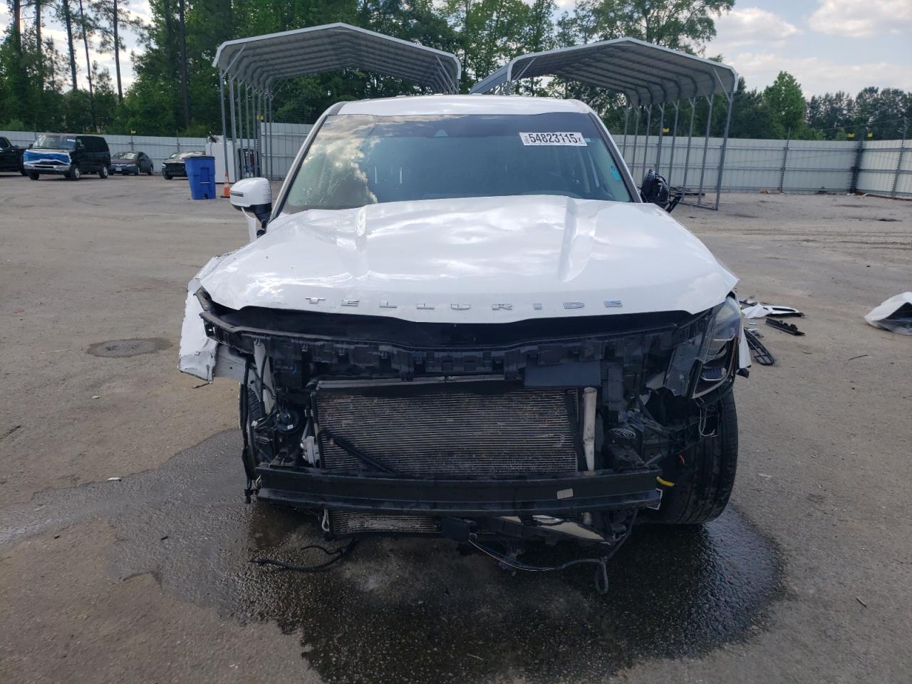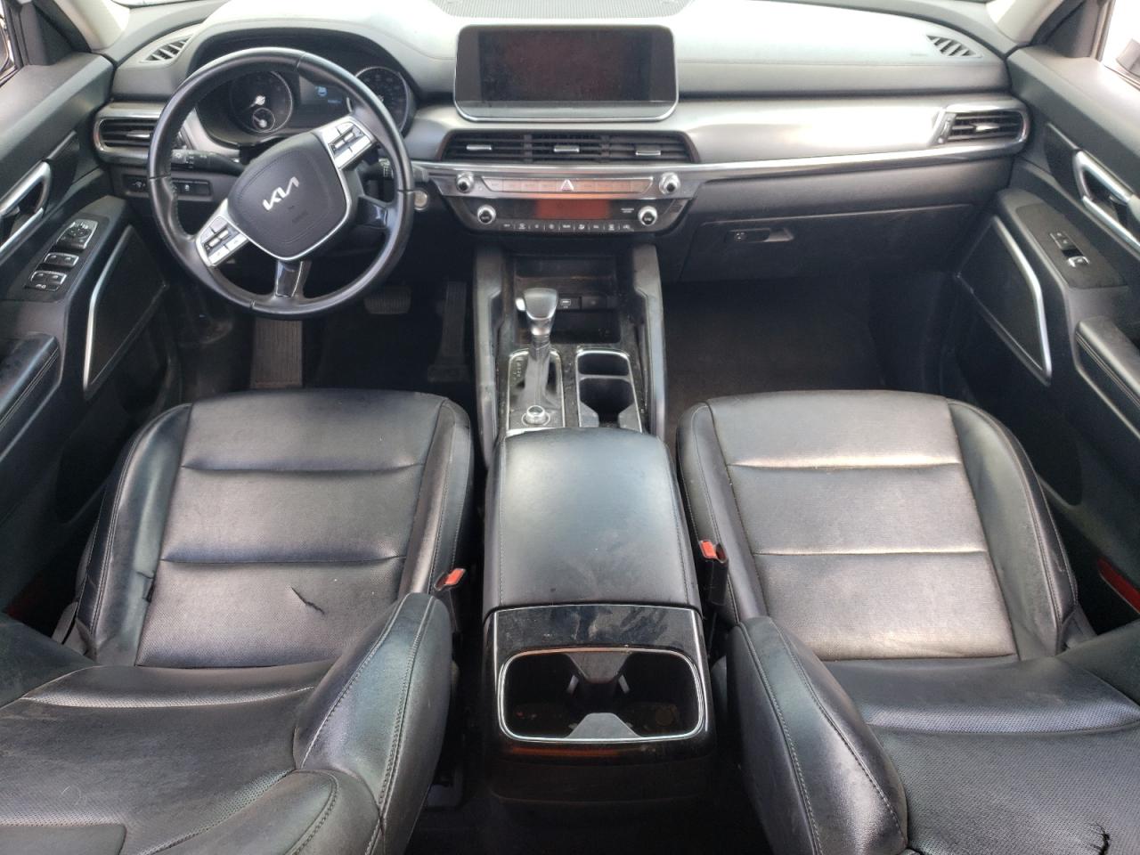 The KIA TELLURIDE has significant body damage, particularly at the front and rear. The front end is heavily damaged, and the rear also shows impact damage. Interior condition appears to be good.