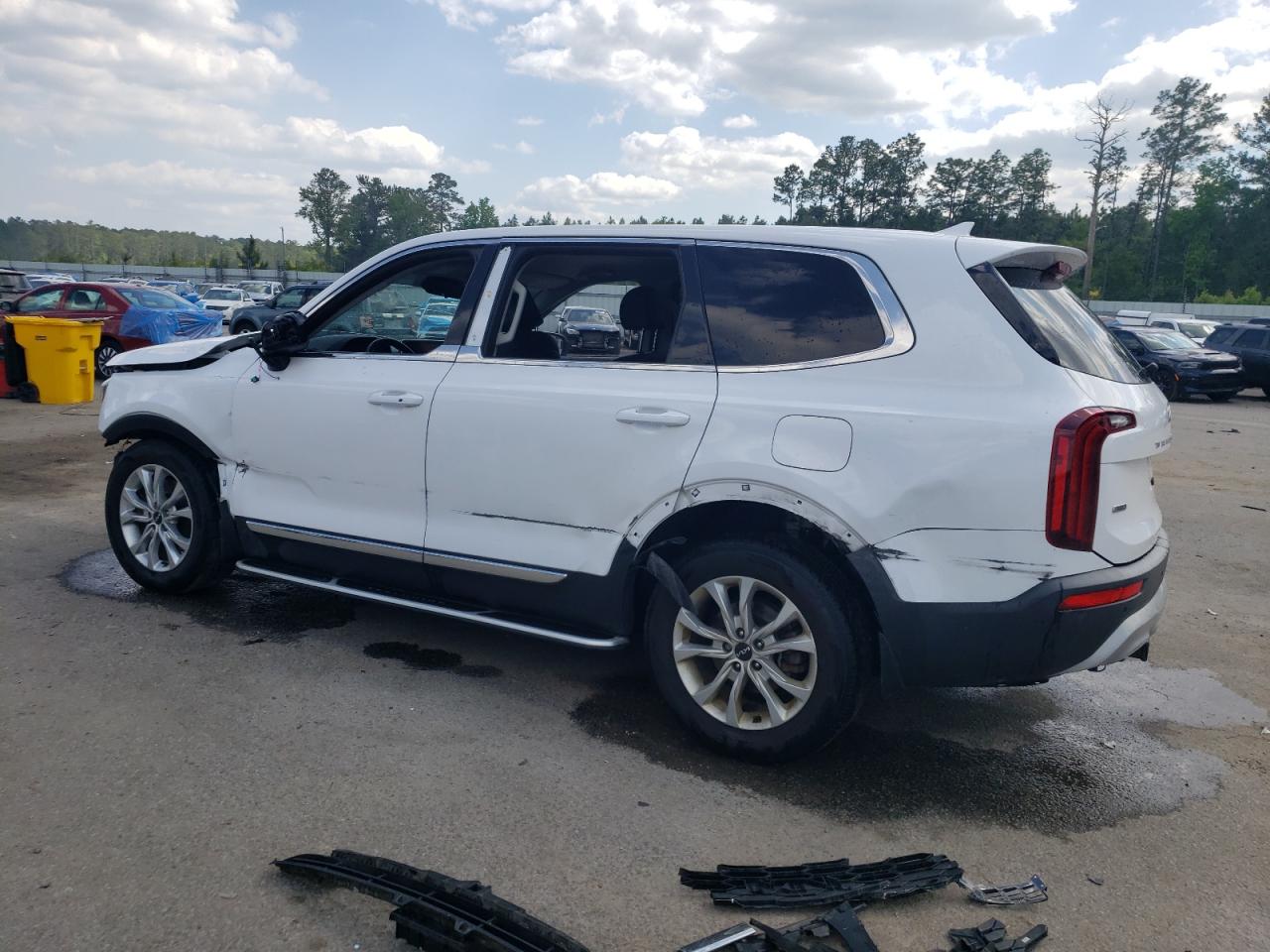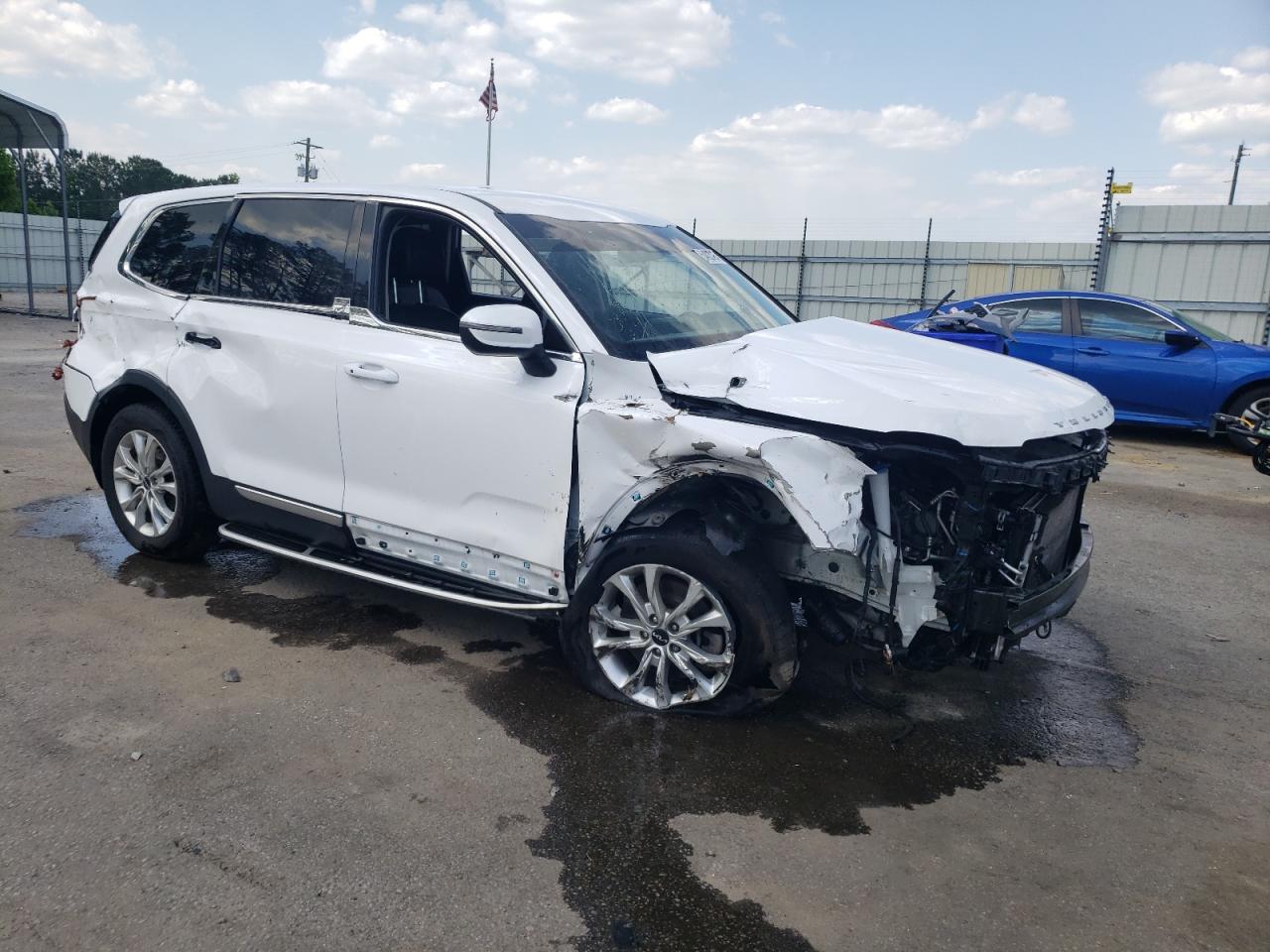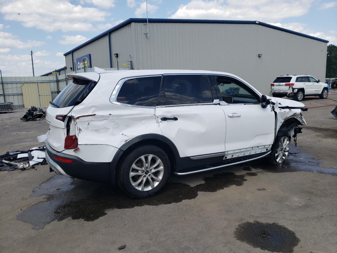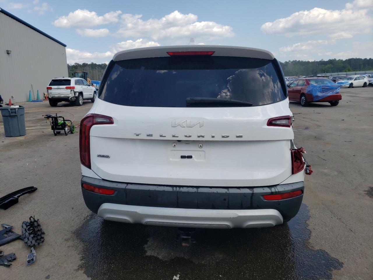 FairThe 2022 KIA TELLURIDE in white shows signs of significant damage, primarily concentrated on the body. The front end is heavily impacted, with visible damage to the bumper, hood, and surrounding panels. The rear also exhibits damage. The vehicle's interior appears to be in good condition, with no immediately apparent issues. The wheels seem intact, and the glass appears undamaged. The car requires considerable repair, especially to the body panels, before it can be considered roadworthy.