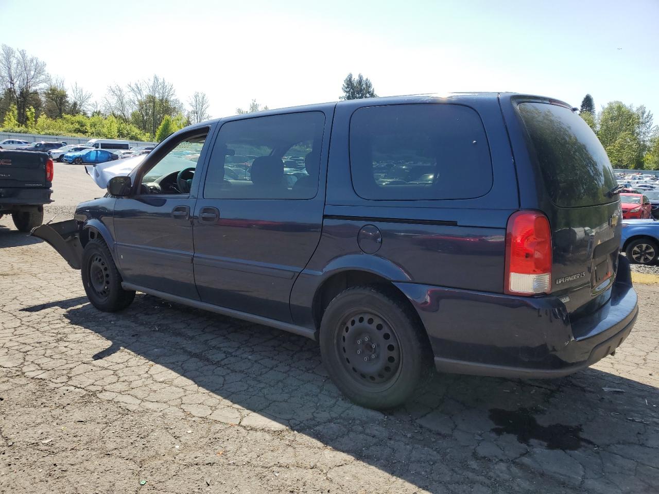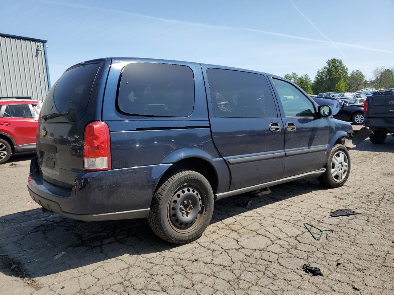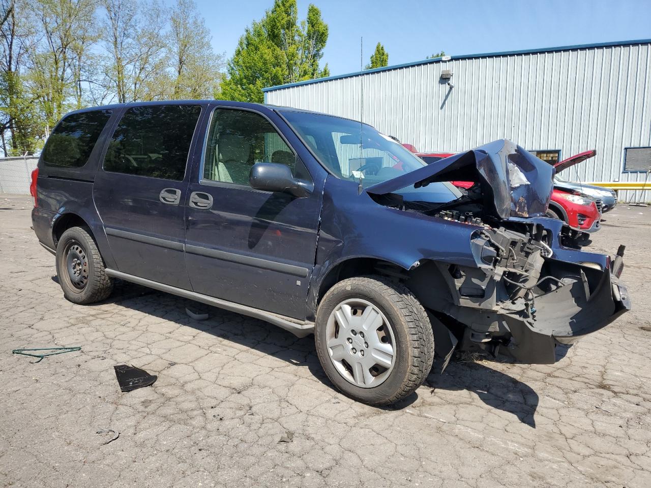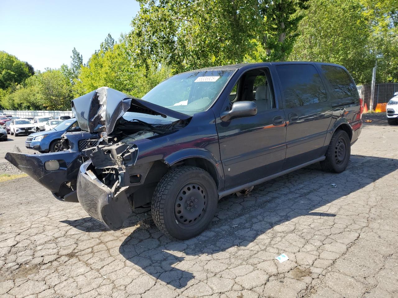 FairThe 2007 Chevrolet Uplander L, a blue minivan, presents with significant front-end damage, indicating a collision. The body panels are heavily impacted, and there's likely structural damage to the frame. The wheels appear to be intact, but the lights and windows may be affected. The interior shows signs of wear, potentially including airbag deployment, and the overall state of the vehicle is reflective of a car needing significant repair or salvage.