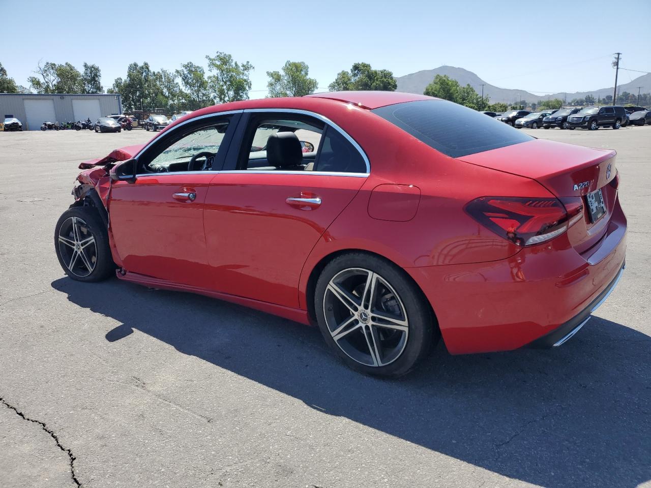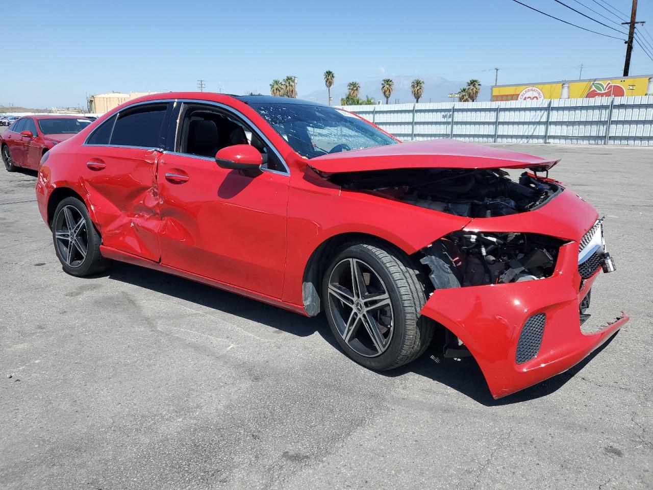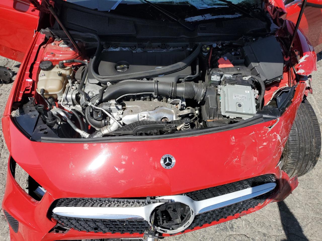 FairThis is a heavily damaged 2019 MERCEDES-BENZ A 220. The primary damage is to the front end and the secondary to the side, resulting in extensive body damage. The red exterior shows significant impact, with the front end completely crushed and side panels severely dented. The wheels appear to be intact. The interior also shows damage.