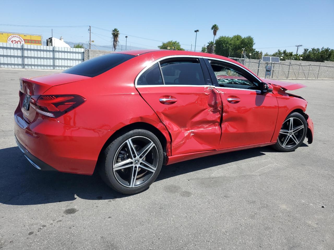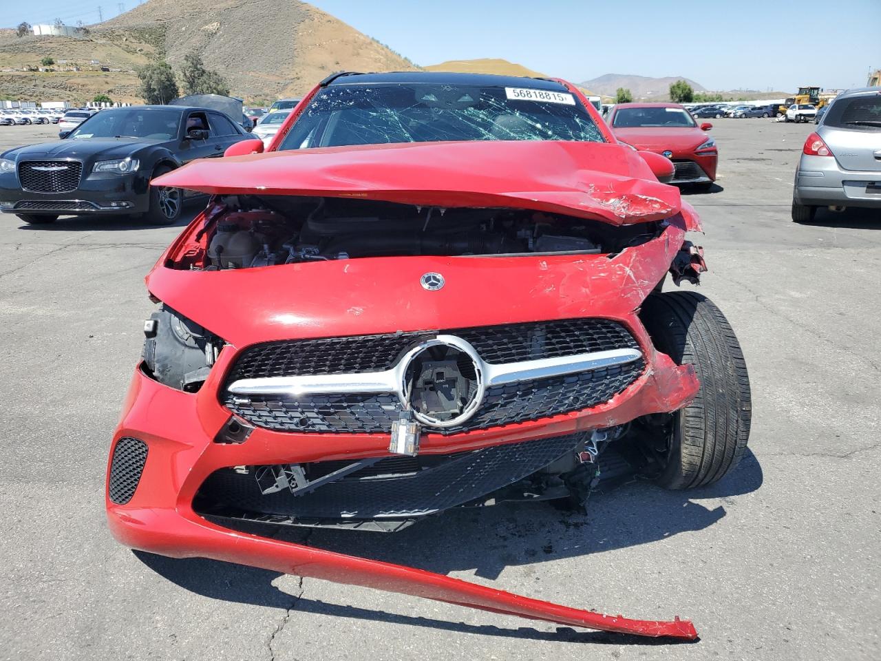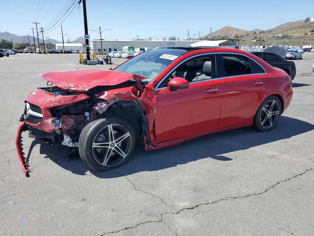 FairThis is a heavily damaged 2019 MERCEDES-BENZ A 220. The primary damage is to the front end and the secondary to the side, resulting in extensive body damage. The red exterior shows significant impact, with the front end completely crushed and side panels severely dented. The wheels appear to be intact. The interior also shows damage.