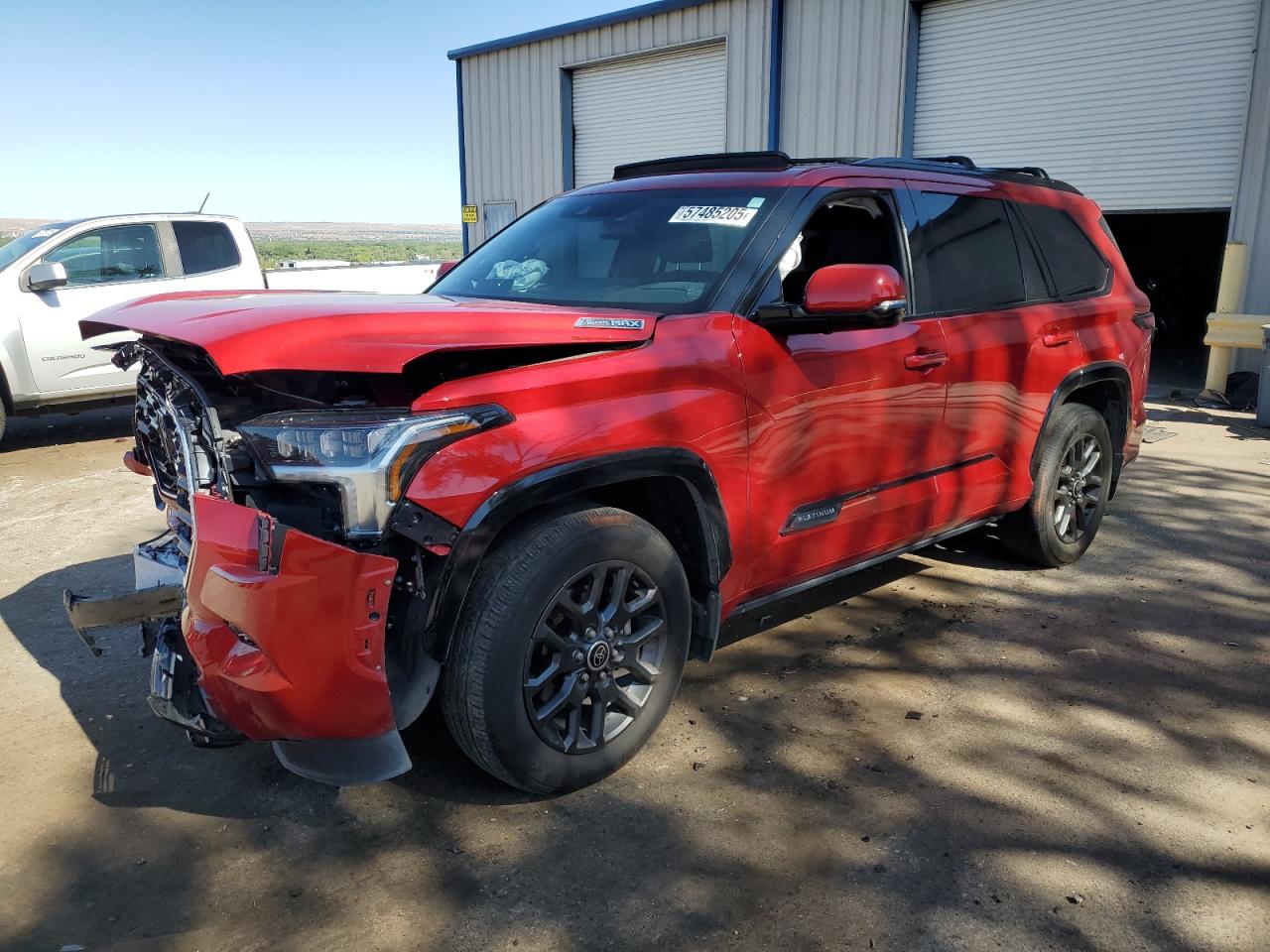 FairThe 2023 TOYOTA SEQUOIA SR has sustained significant front-end and side damage in a collision. The red SUV shows extensive damage to the front, including the bumper, hood, and front panels. Side damage is also evident. Interior appears to be in a fair condition. This vehicle is listed as Run & Drive Verified. The airbags have deployed.
