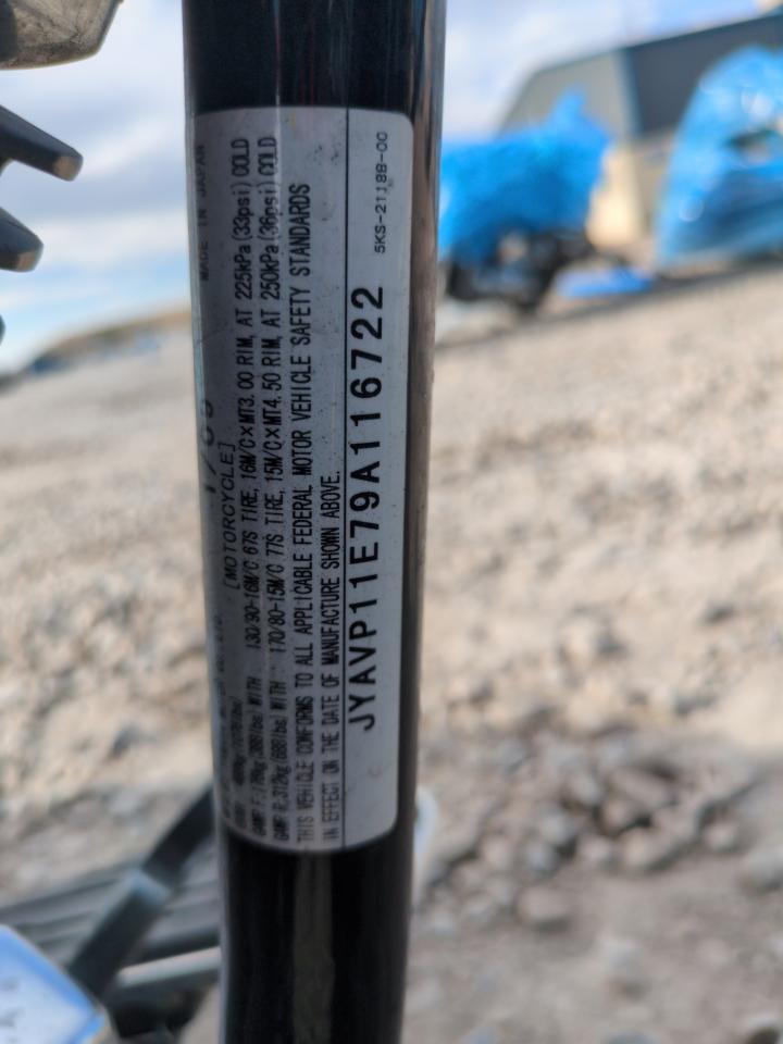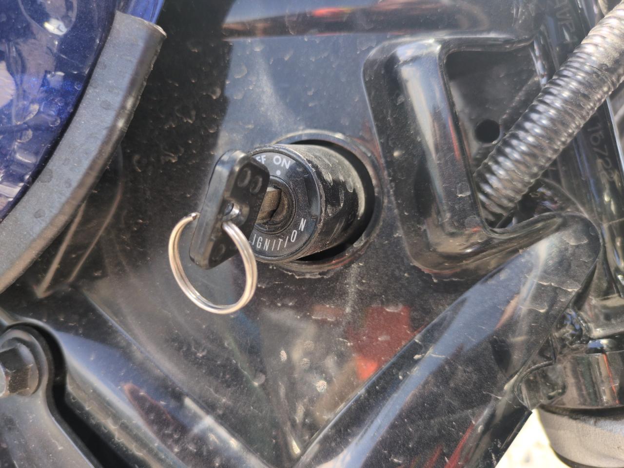 The primary damage is focused on the front end, with no secondary damage reported. It has body damage. The vehicle's overall exterior condition is good considering the damage. The wheels appear to be in good condition, and the motorcycle is operational.