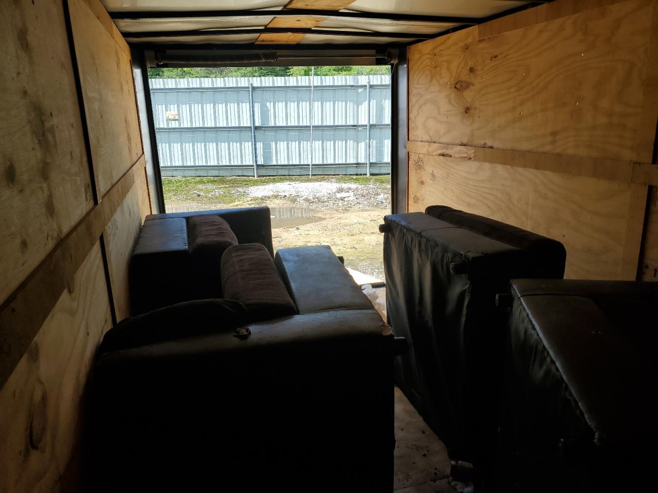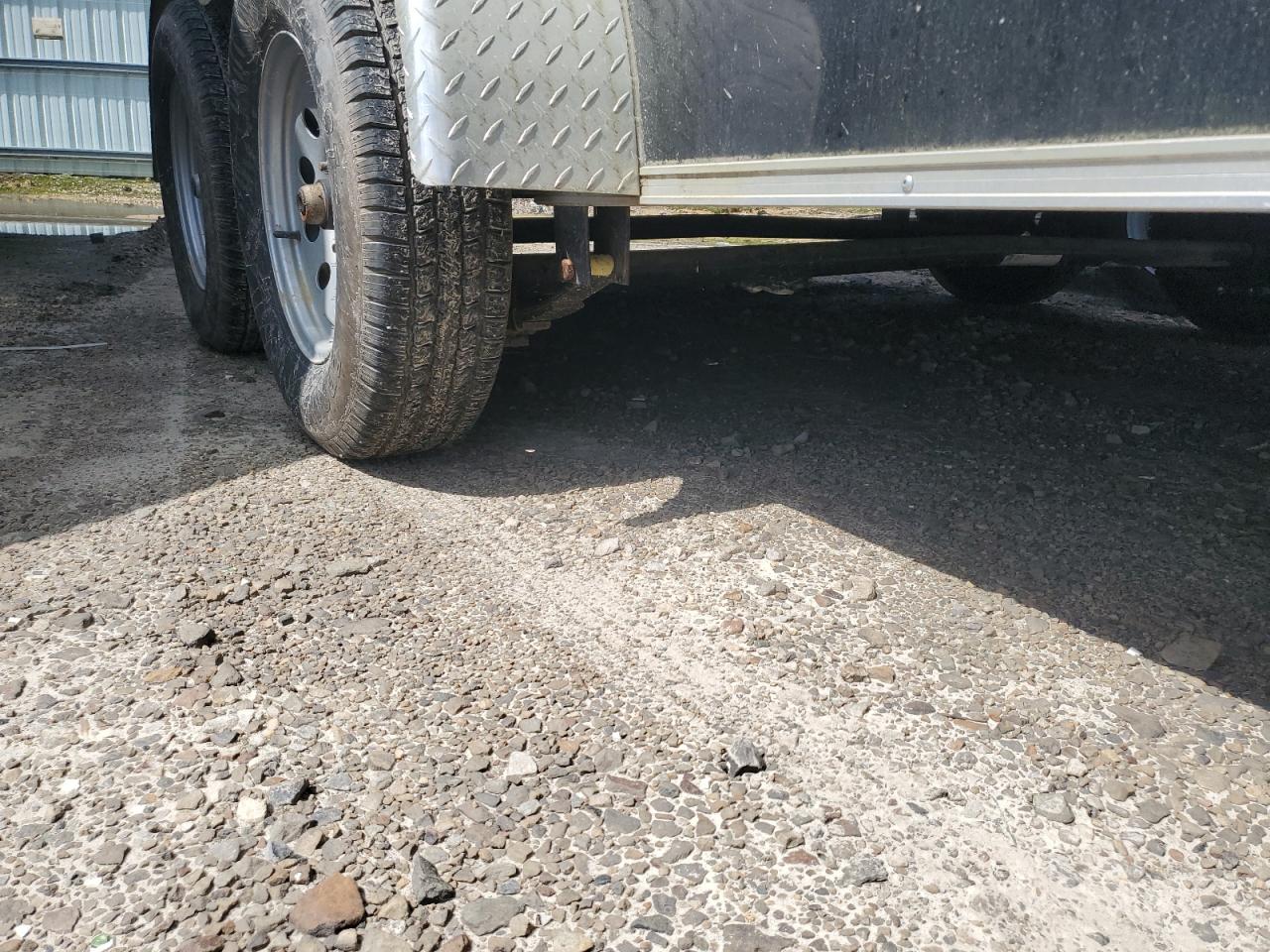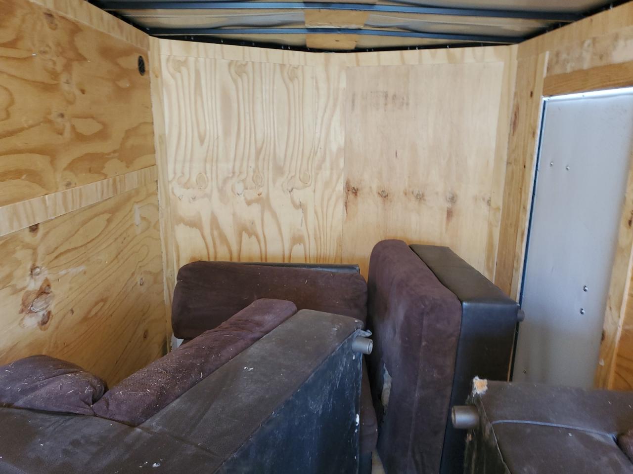 The trailer's exterior has noticeable damage on the side and front end. Interior damage is present. The tires appear to be in decent condition, and it's drivable after repairs.