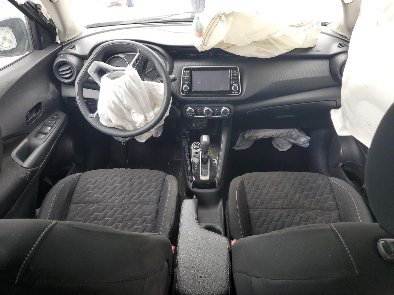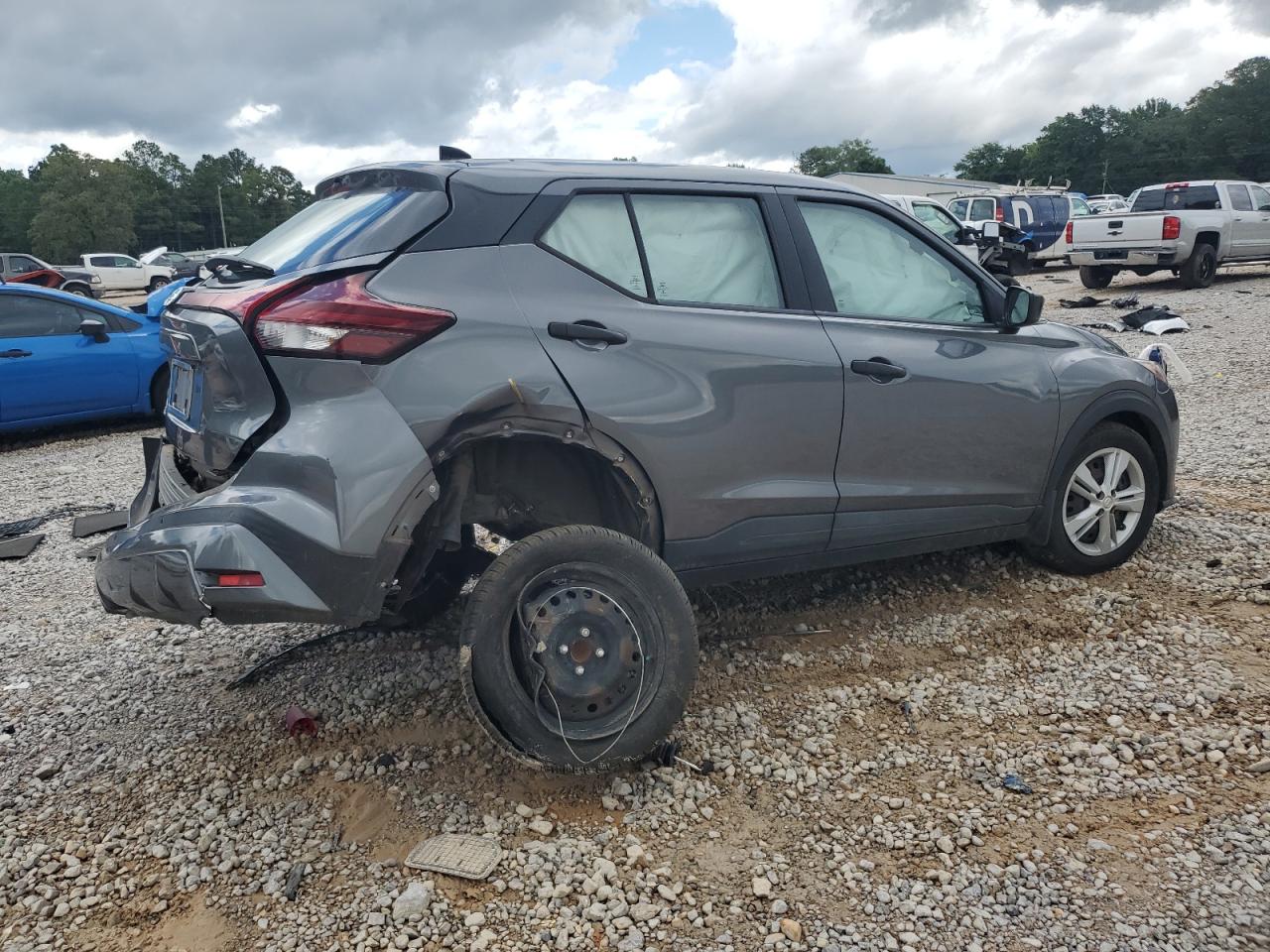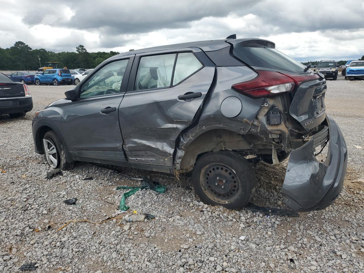 PoorThis is a charcoal 2021 Nissan Kicks S, severely damaged from a rear-end and side impact collision. The vehicle's body is extensively damaged, with significant deformation to the rear and side panels. Interior damage includes deployed airbags, specifically in the steering wheel area. This car is not drivable.