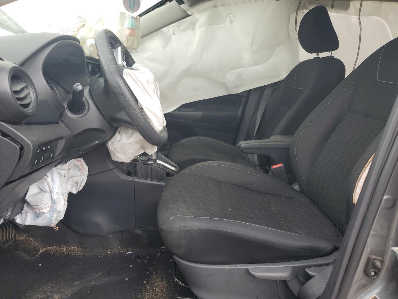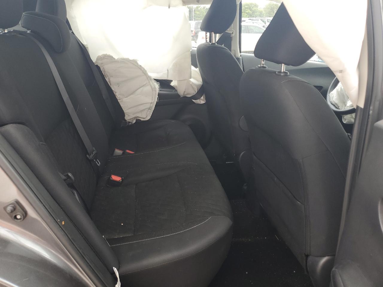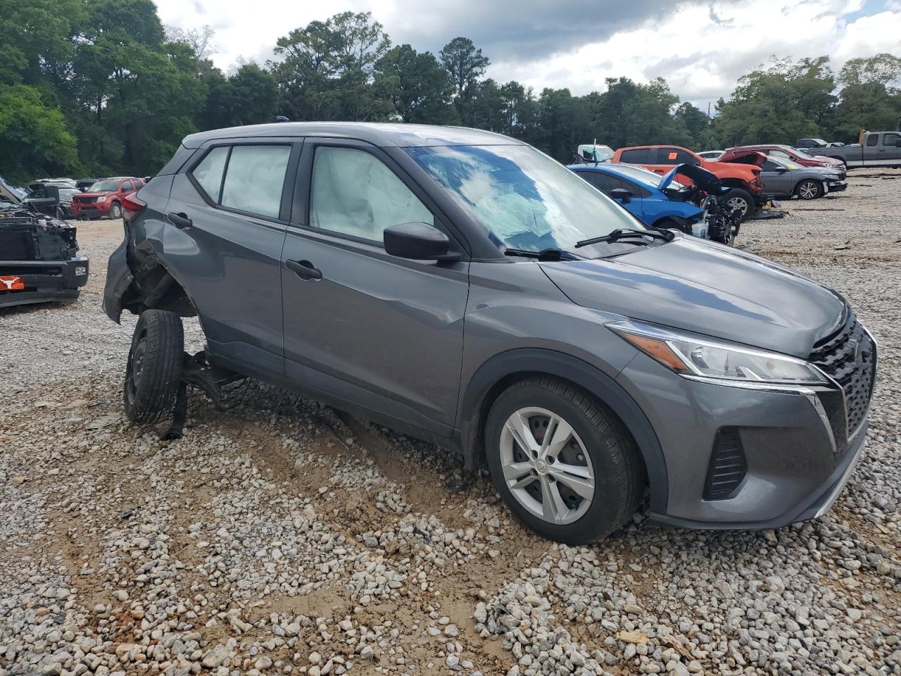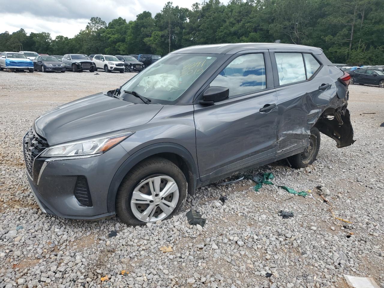 PoorThis is a charcoal 2021 Nissan Kicks S, severely damaged from a rear-end and side impact collision. The vehicle's body is extensively damaged, with significant deformation to the rear and side panels. Interior damage includes deployed airbags, specifically in the steering wheel area. This car is not drivable.