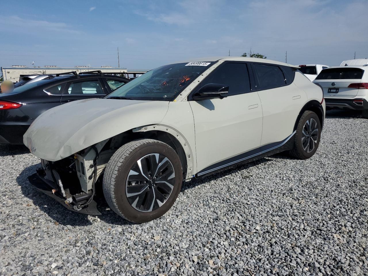 FairKIA EV6 LIGHT 2024, white color. Primary damage: FRONT END, secondary: SIDE. Start code: Run & Drive Verified. The car is heavily damaged, with significant front-end and side damage. The body panels are damaged and will need repairs. Interior damage is present, and the airbags have deployed, indicating a substantial impact. Despite the damage, the car is reported as running and driving.
